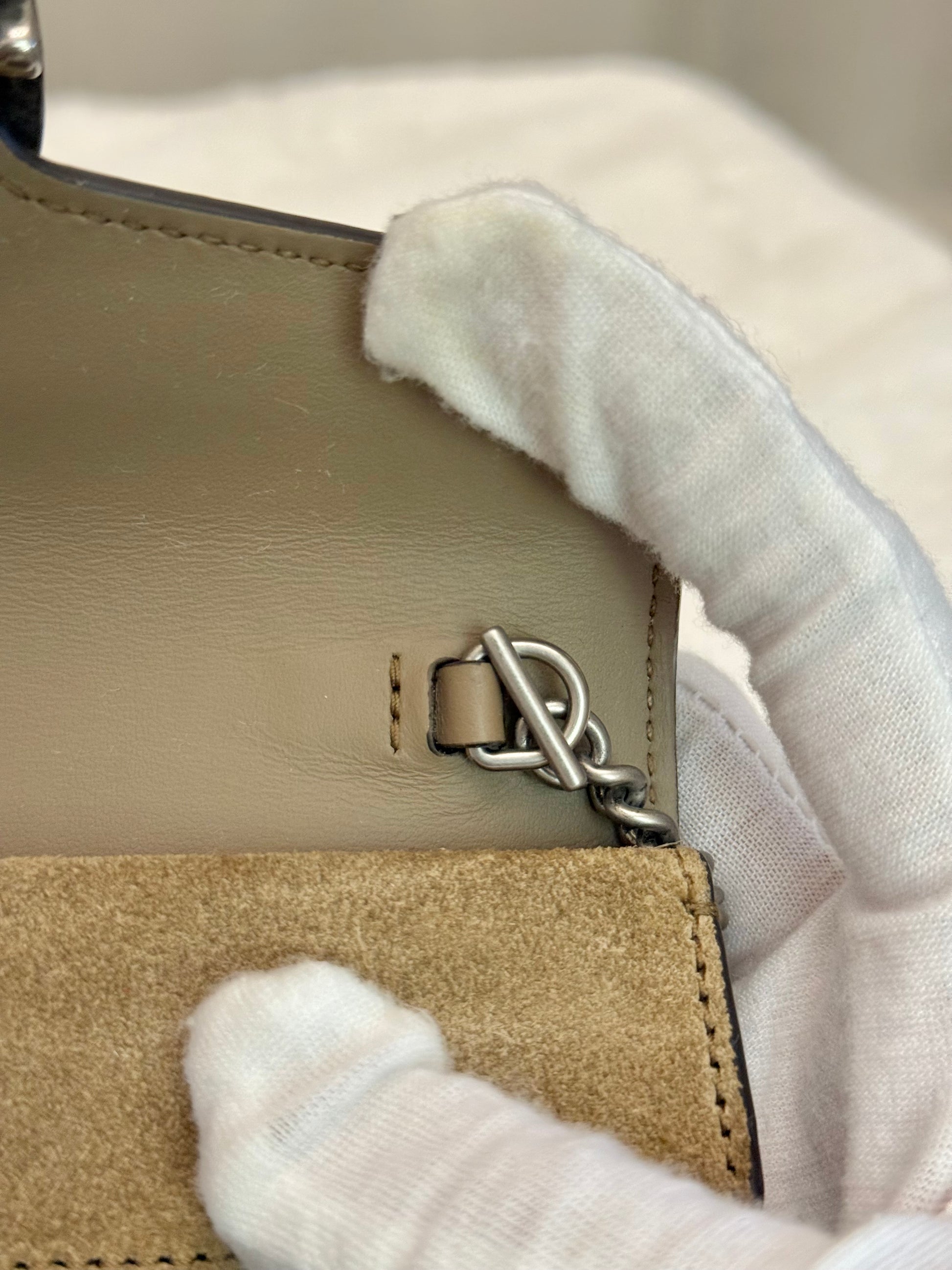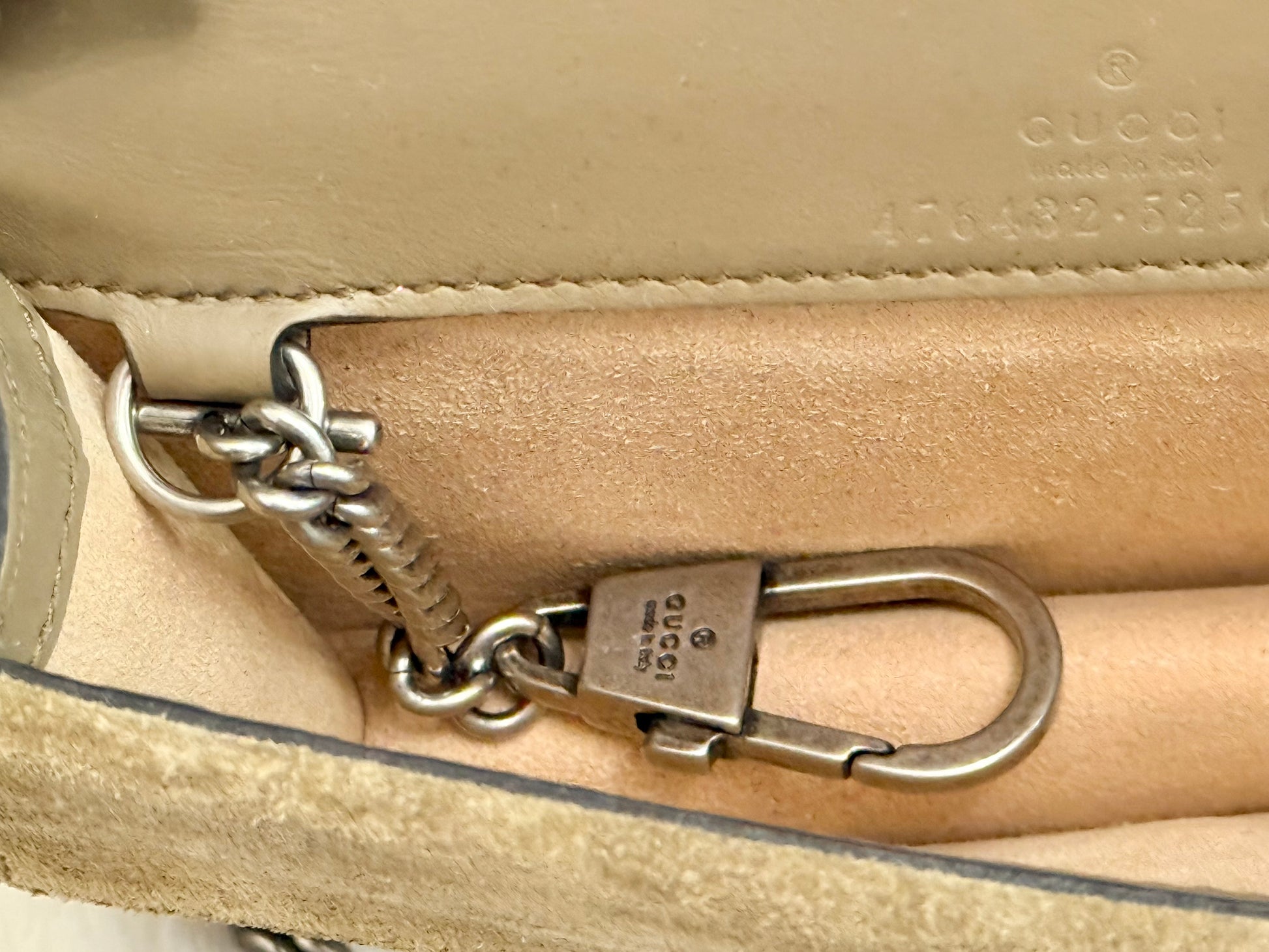 EXCELLENT CONDITION. Coated Canvas is in great condition. Interior has no stains. Tiger head closure has no flaws. Chain strap has no flaws. Snap closure is still tight. No offensive odors, comes from pet and smoke free home.