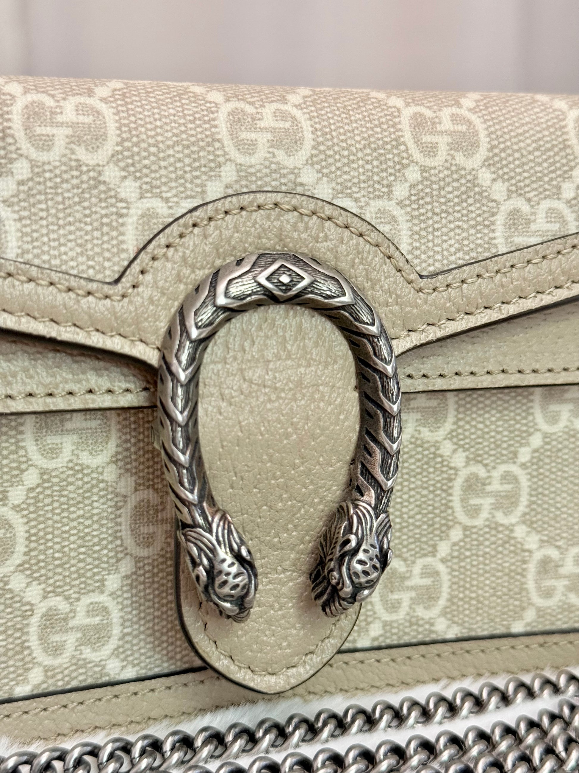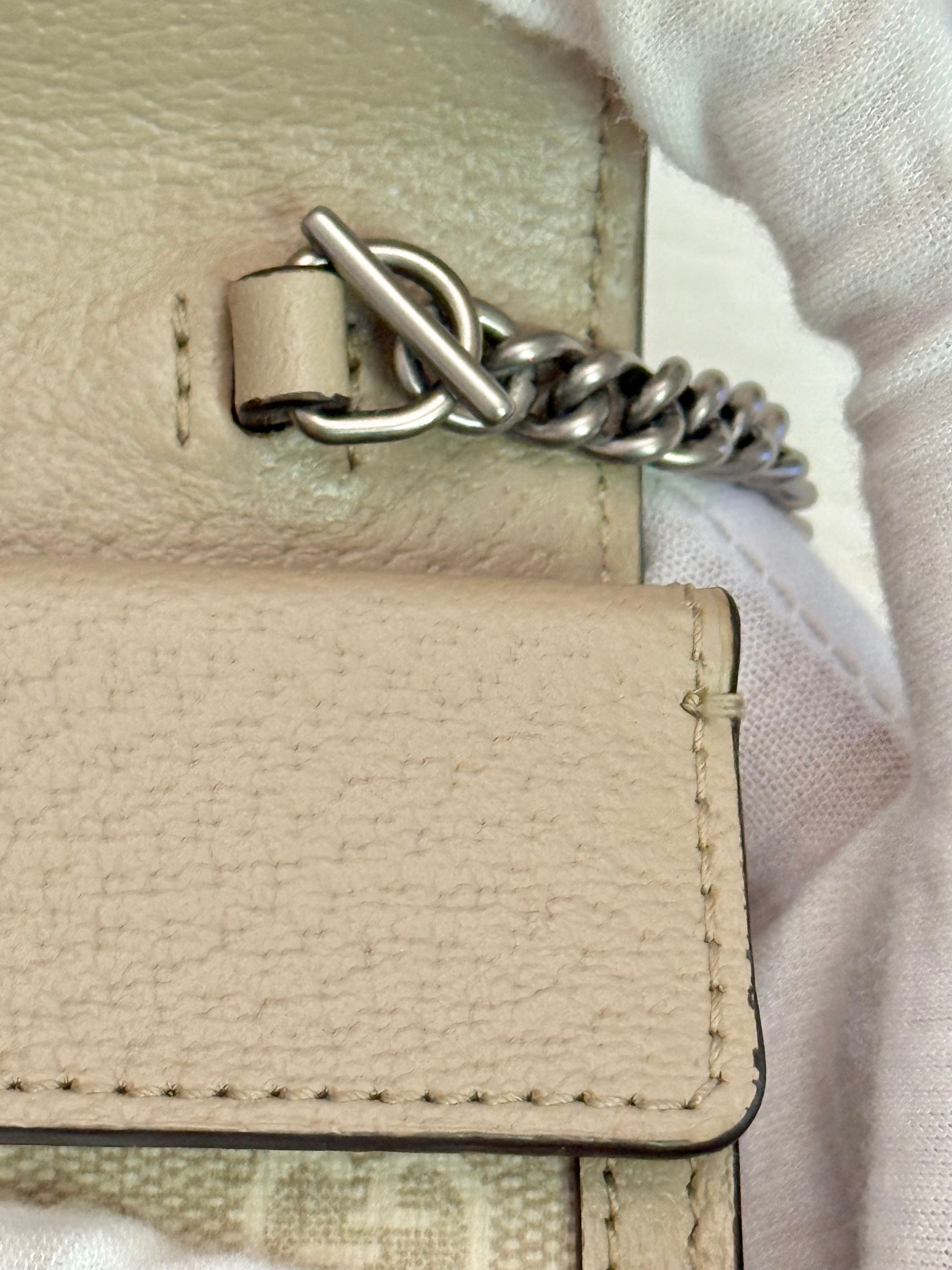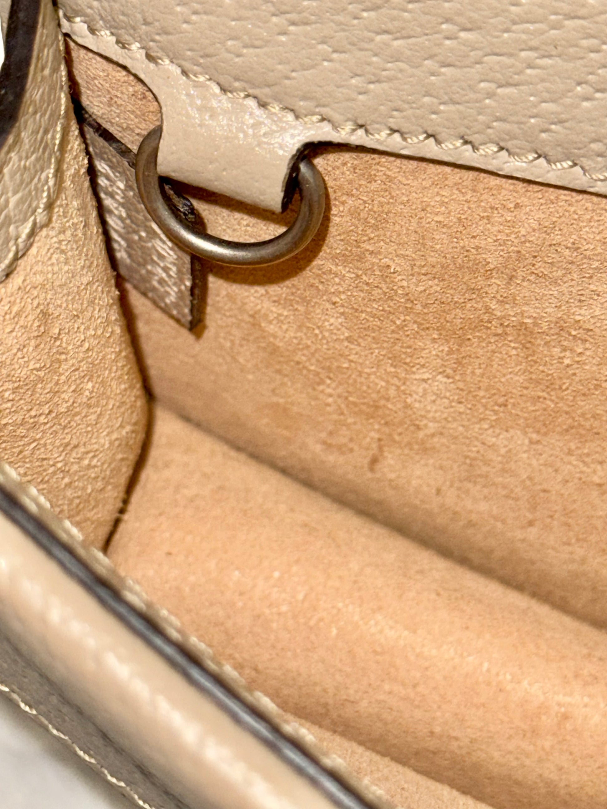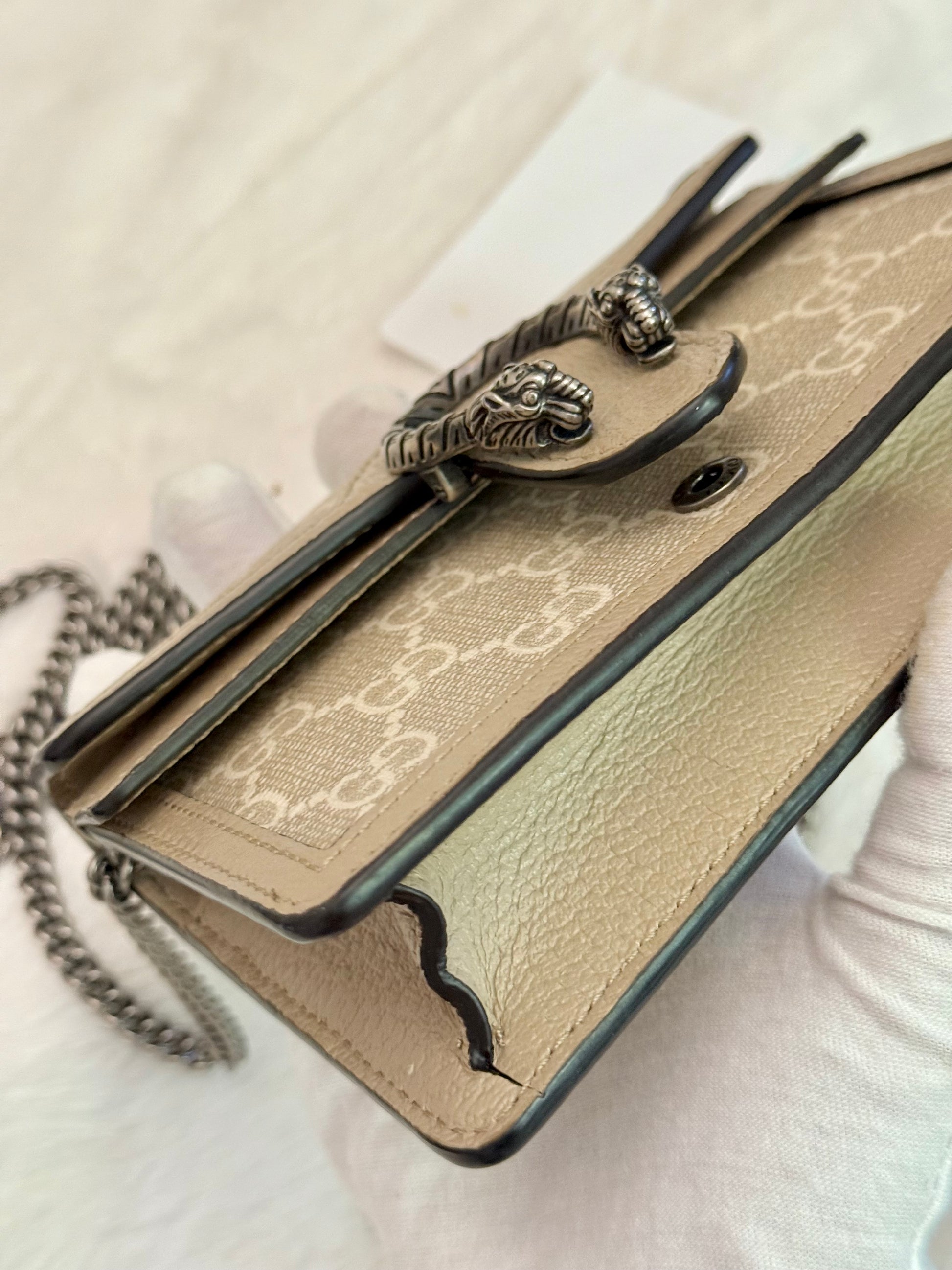 EXCELLENT CONDITION. Coated Canvas is in great condition. Tiger head closure has no flaws. Chain strap has no flaws. Snap closure is still tight. Interior has no major stains but it has reddish faint marks. Trim leather is pristine. No offensive odors, comes from pet and smoke free home.