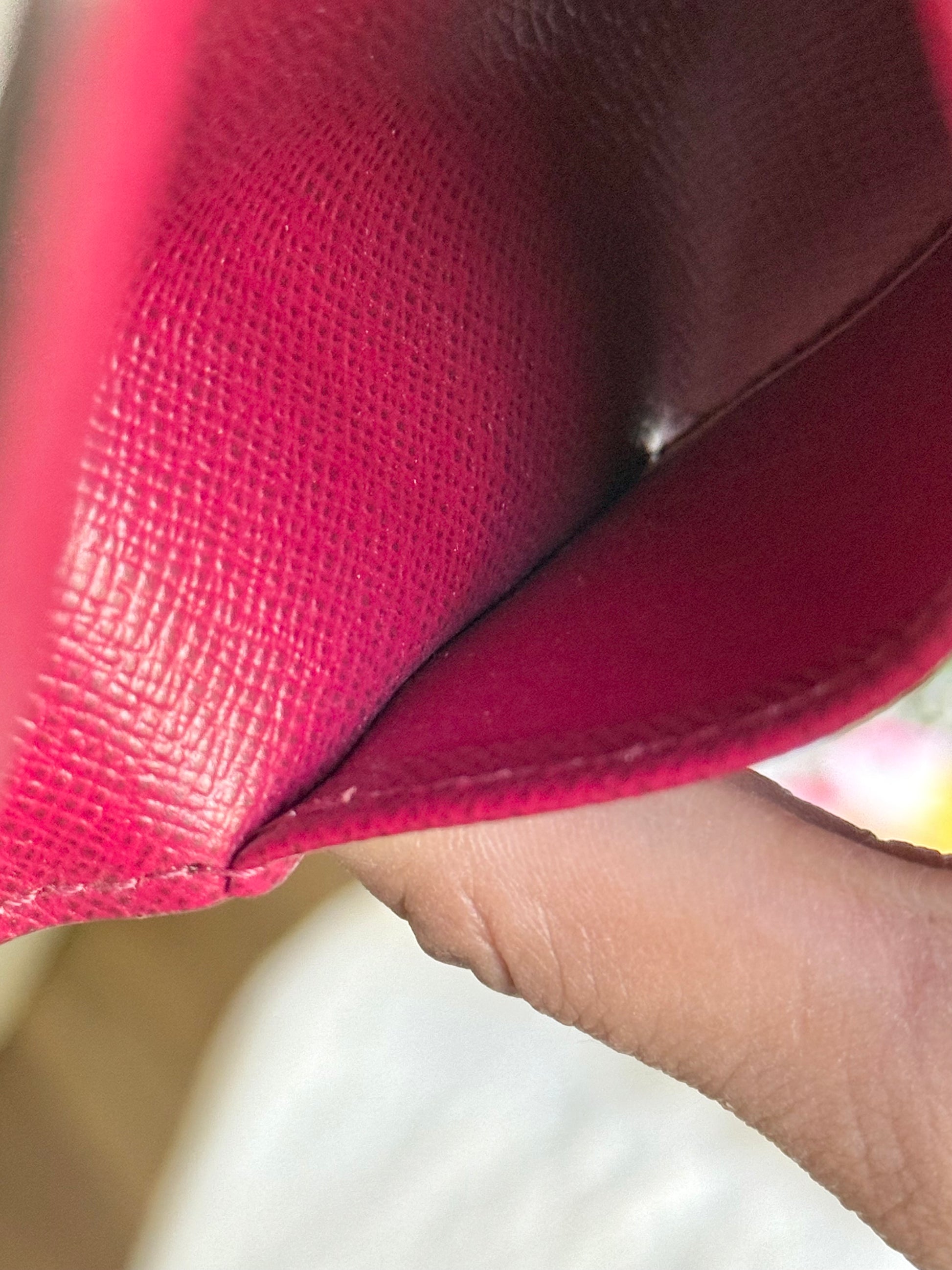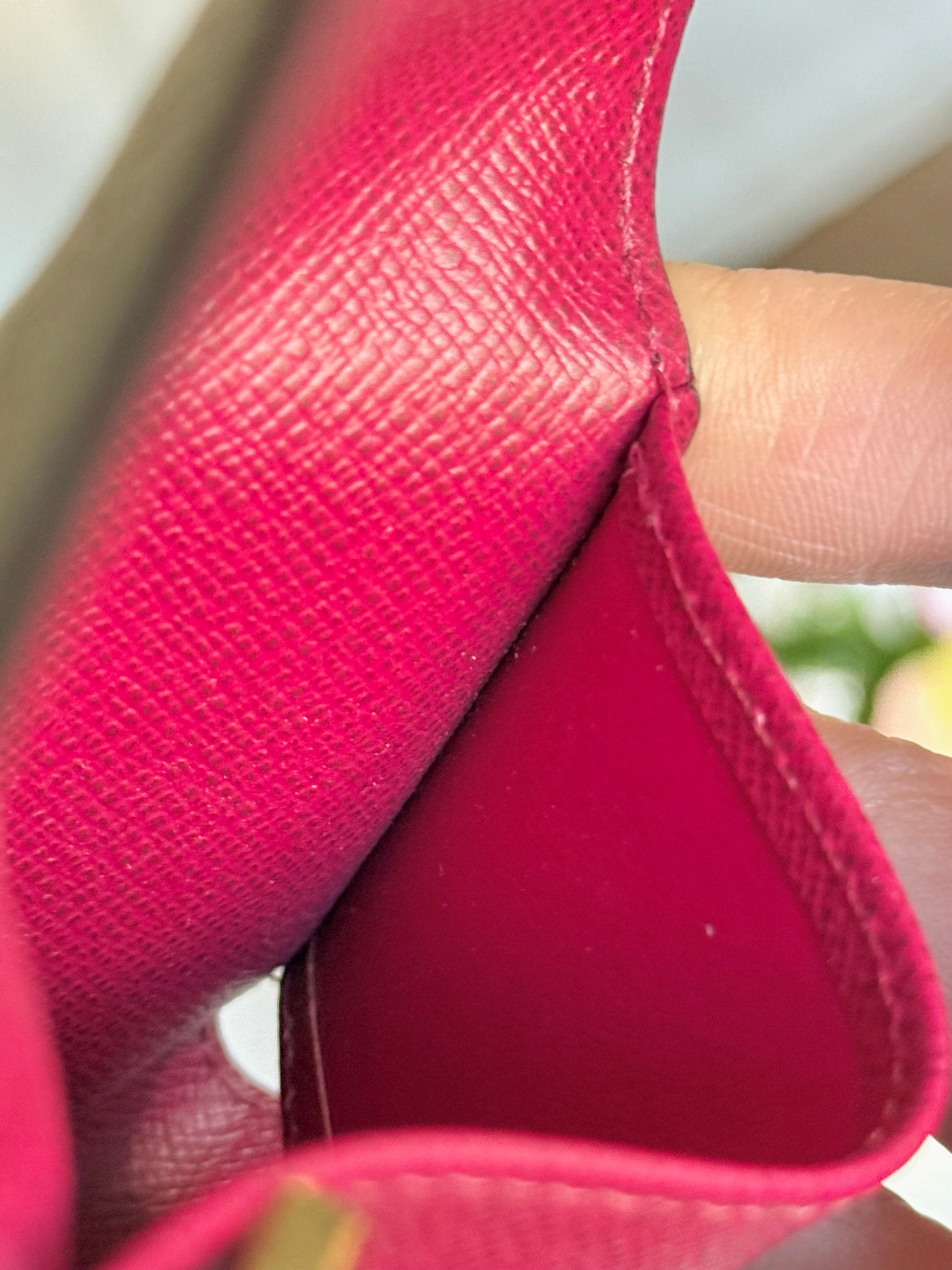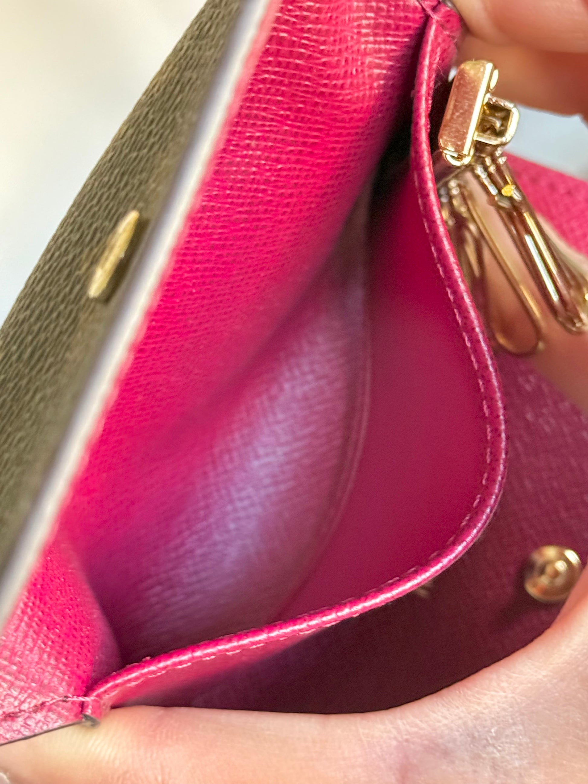 In EXCELLENT condition! Interior color Fuchsia is discontinued. No flaws on canvas, glazing and interior. Hardware shows signs of use: hairline scratches on front button and on key holders.
