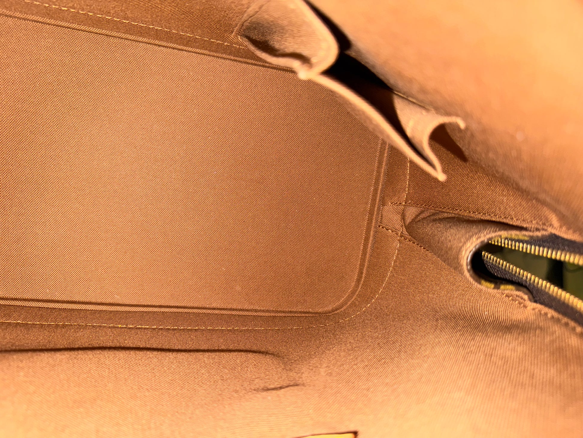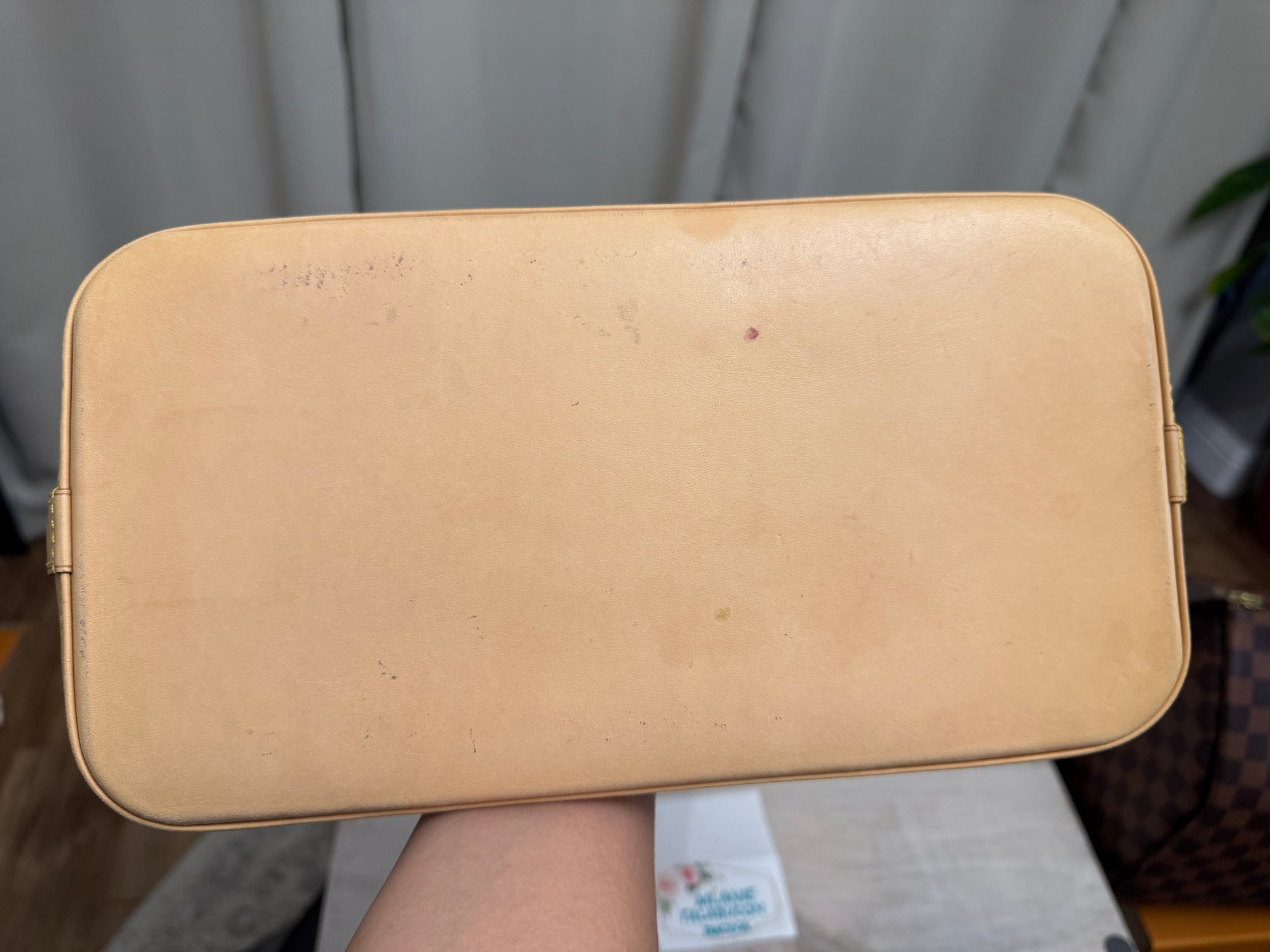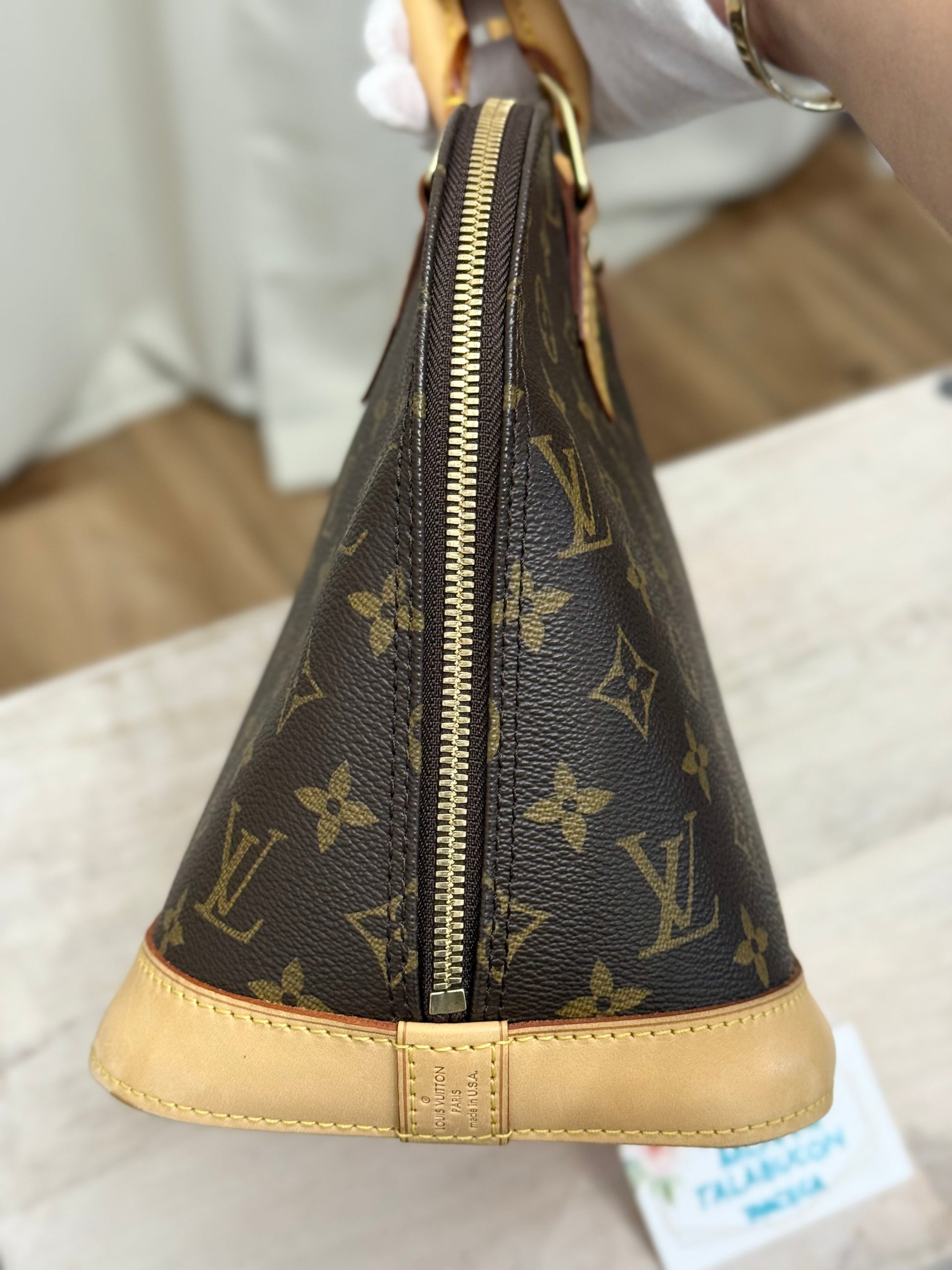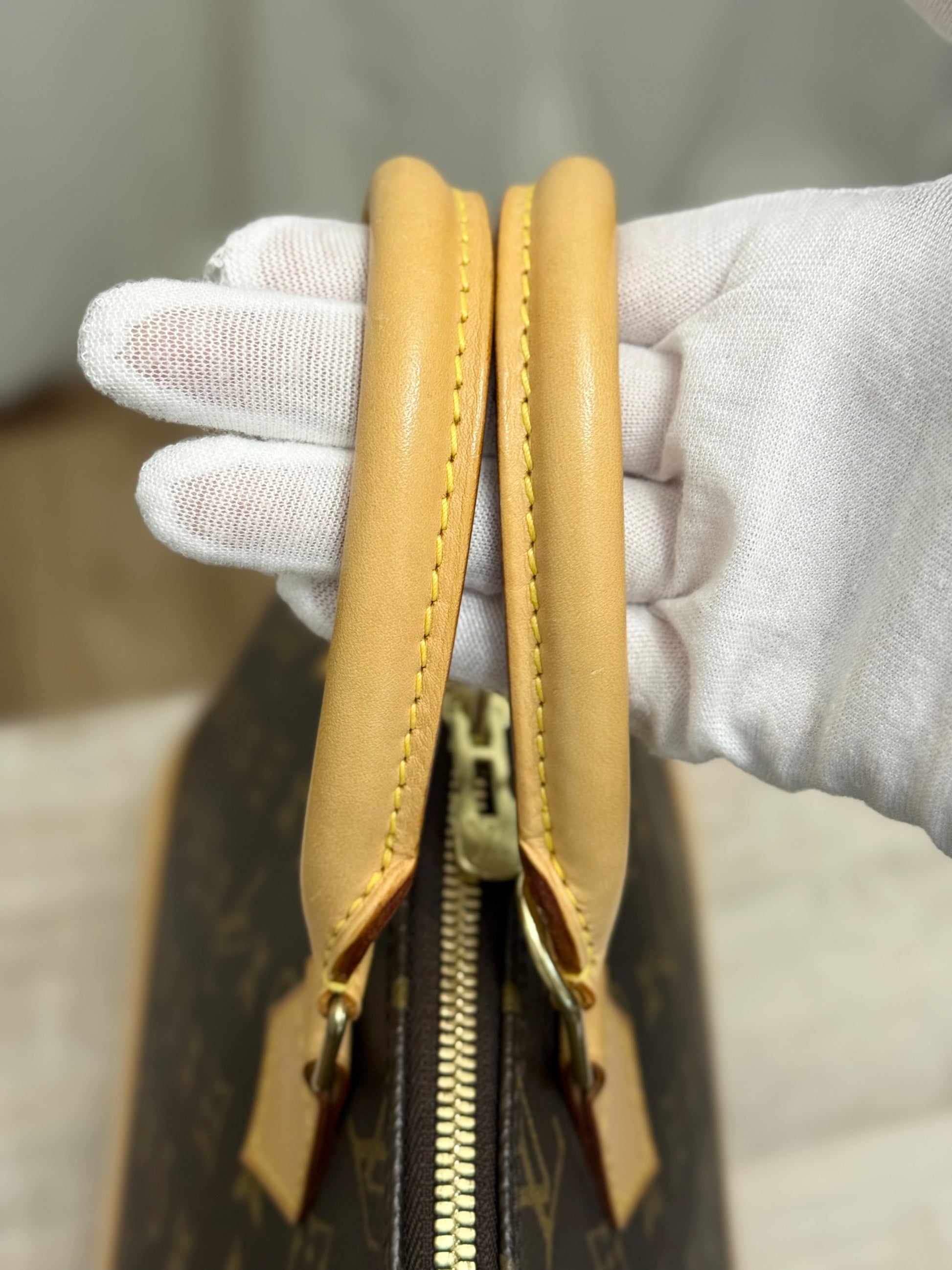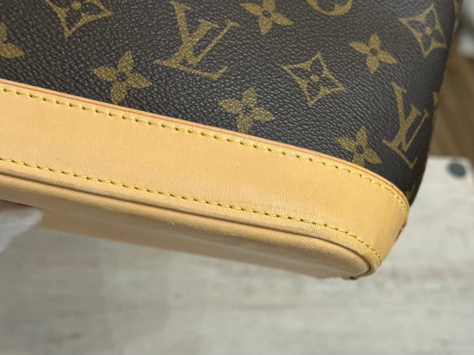 The bag is in EXCELLENT preowned condition! Canvas has no cracks. Zipper runs smooth. Hardware is golden. Interior is clean with minor marks. Vachetta has light patina. Bottom vachetta leather has light patina with marks. No offensive odors, comes from pet and smoke free home.
