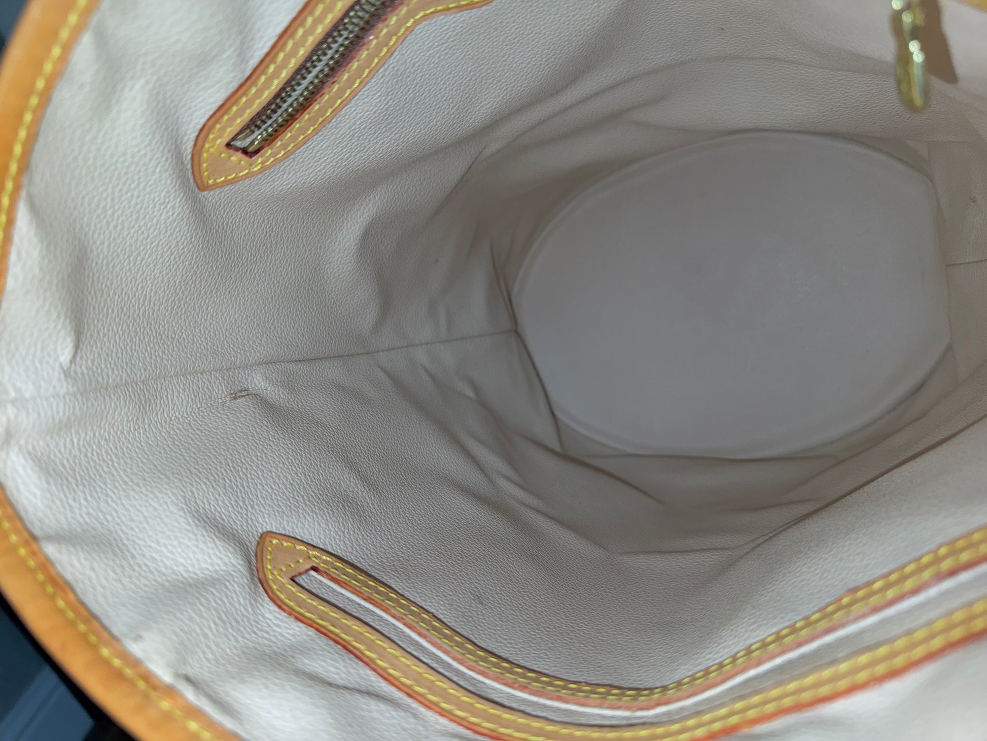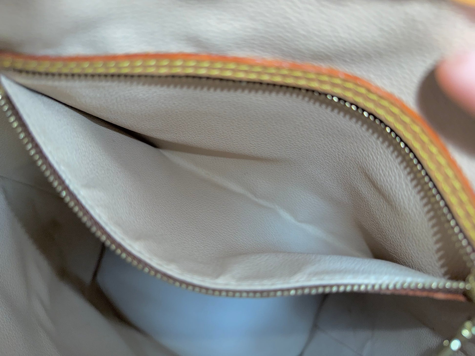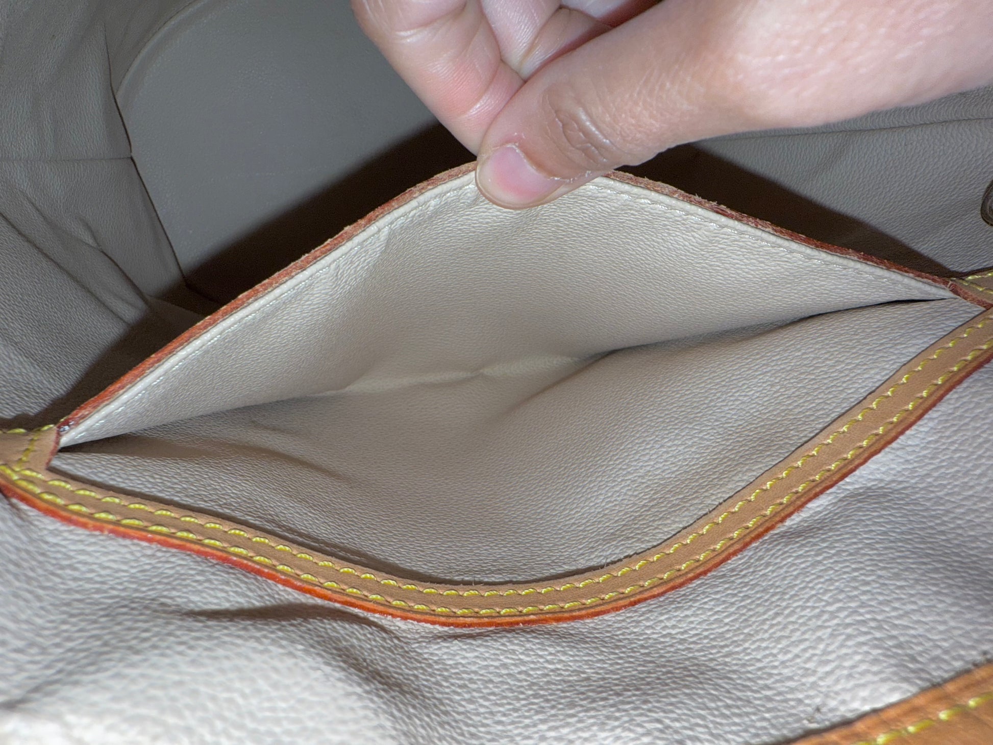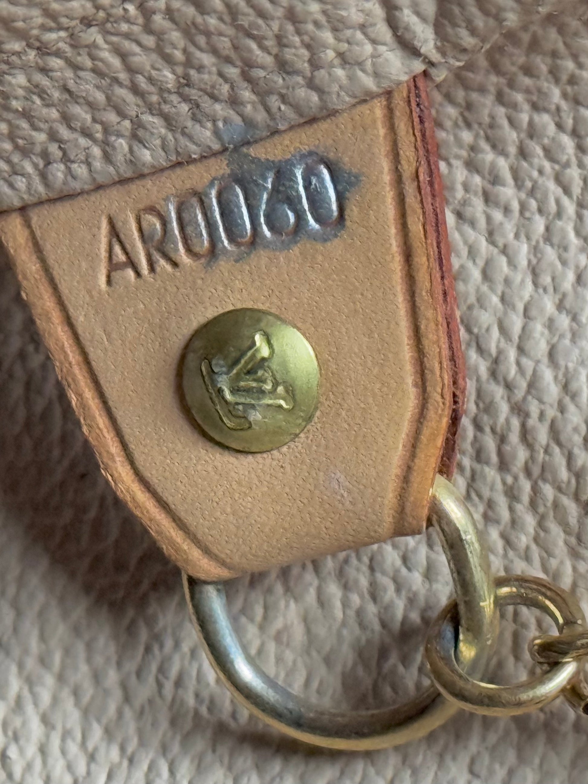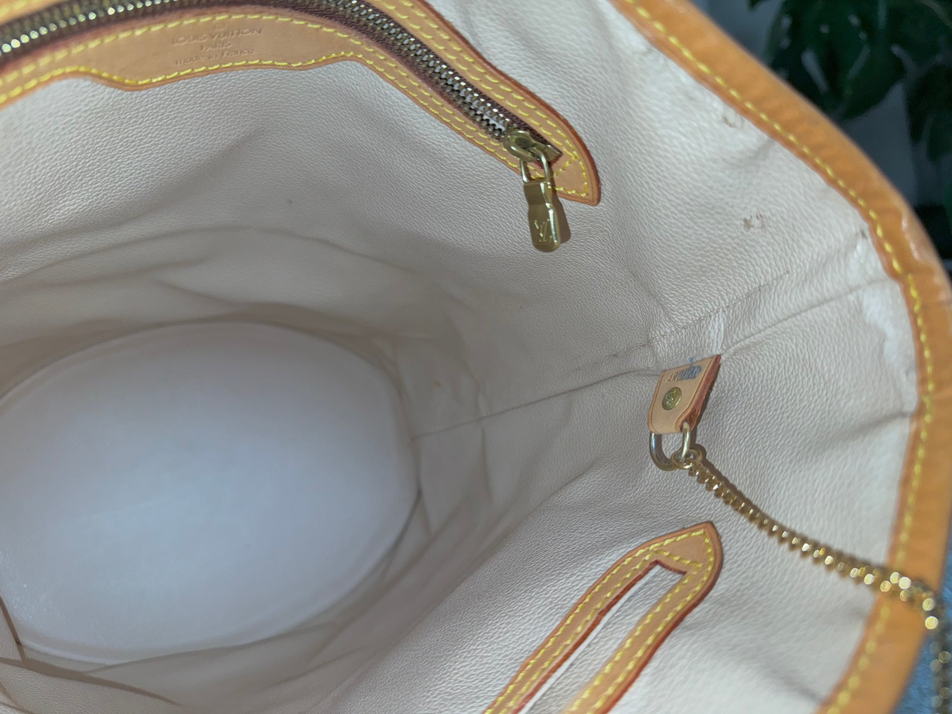 The bag is in EXCELLENT condition for her age of 25yo! No flaws on canvas: . Vachetta has lovely patina; trim is solid. Interior has no stickiness, just scuffs and stretched area due to use. Hardware is golden and no tarnish. No offensive odors, comes from pet and smoke free home.