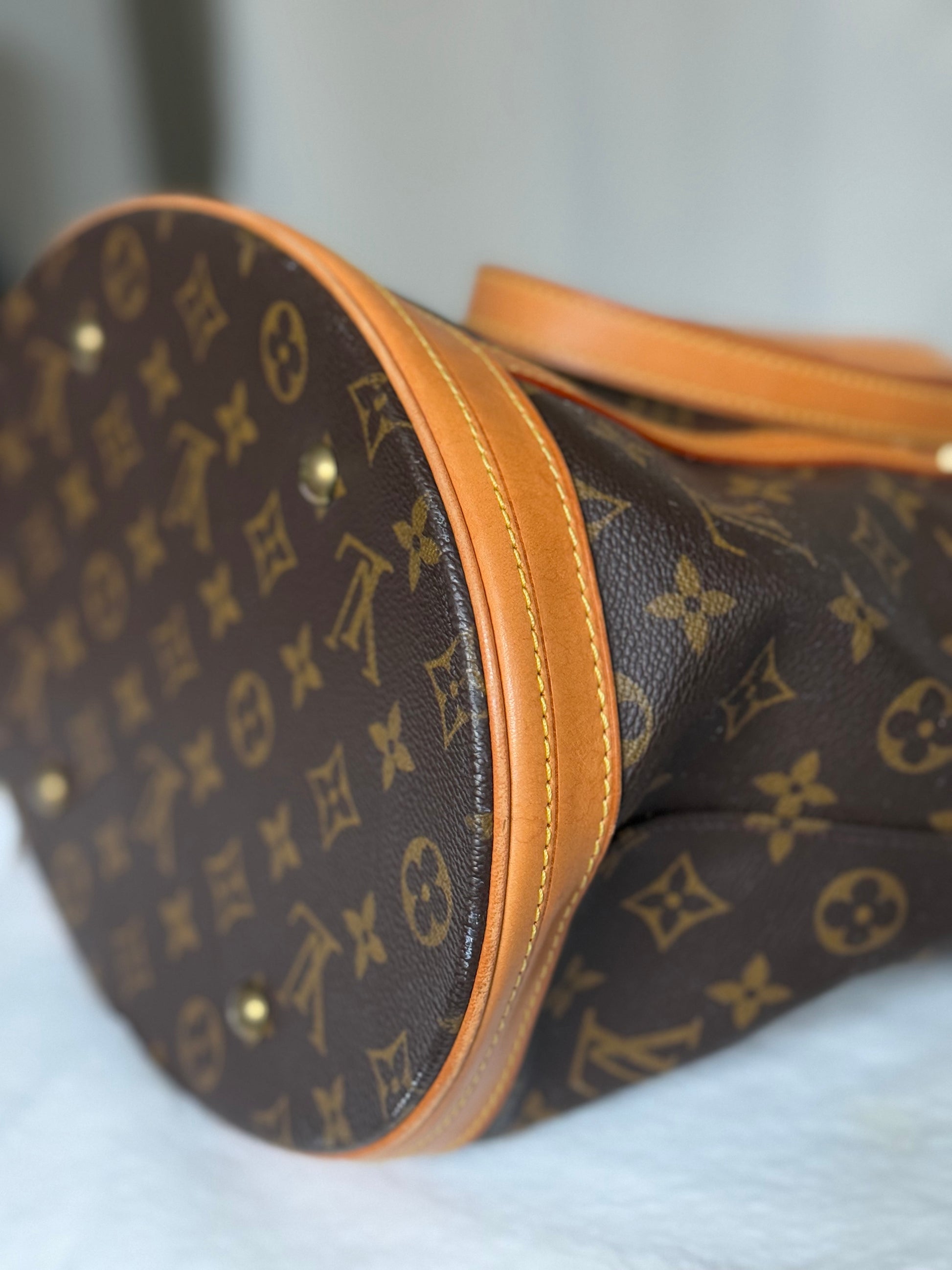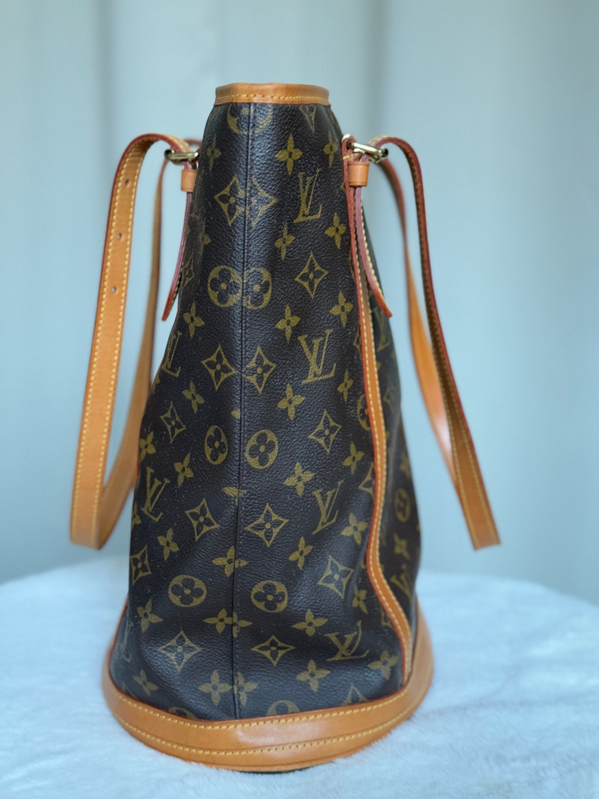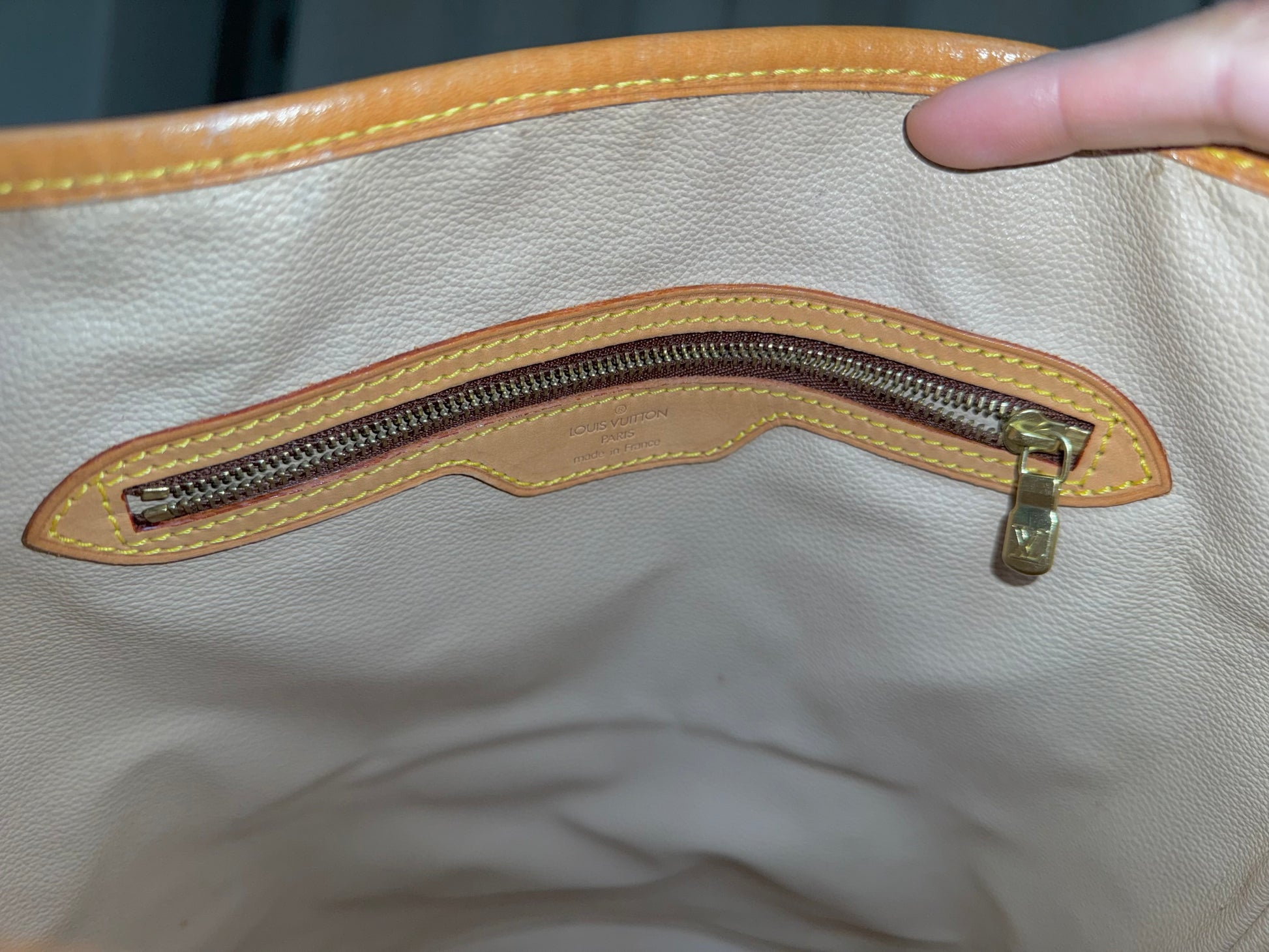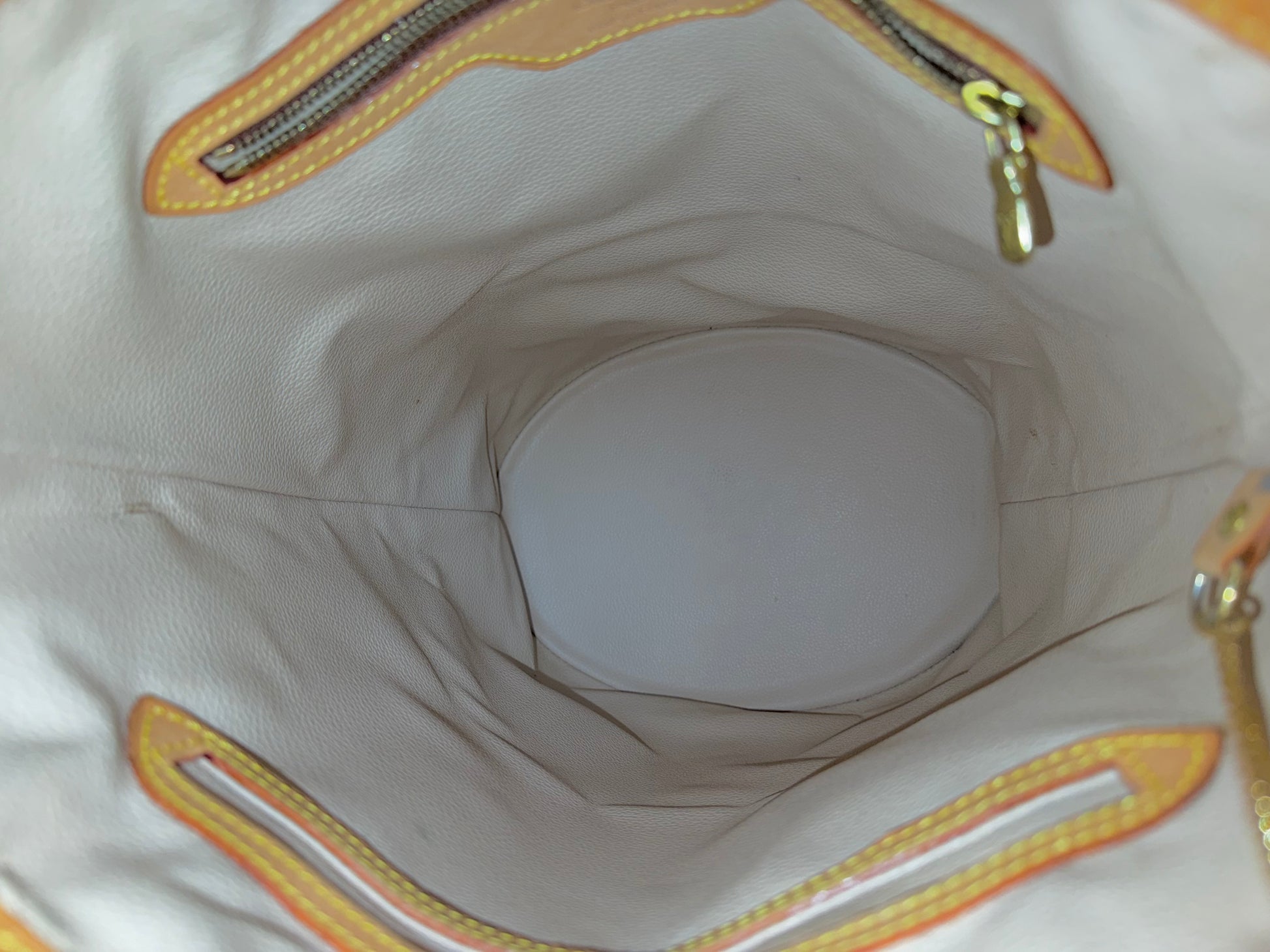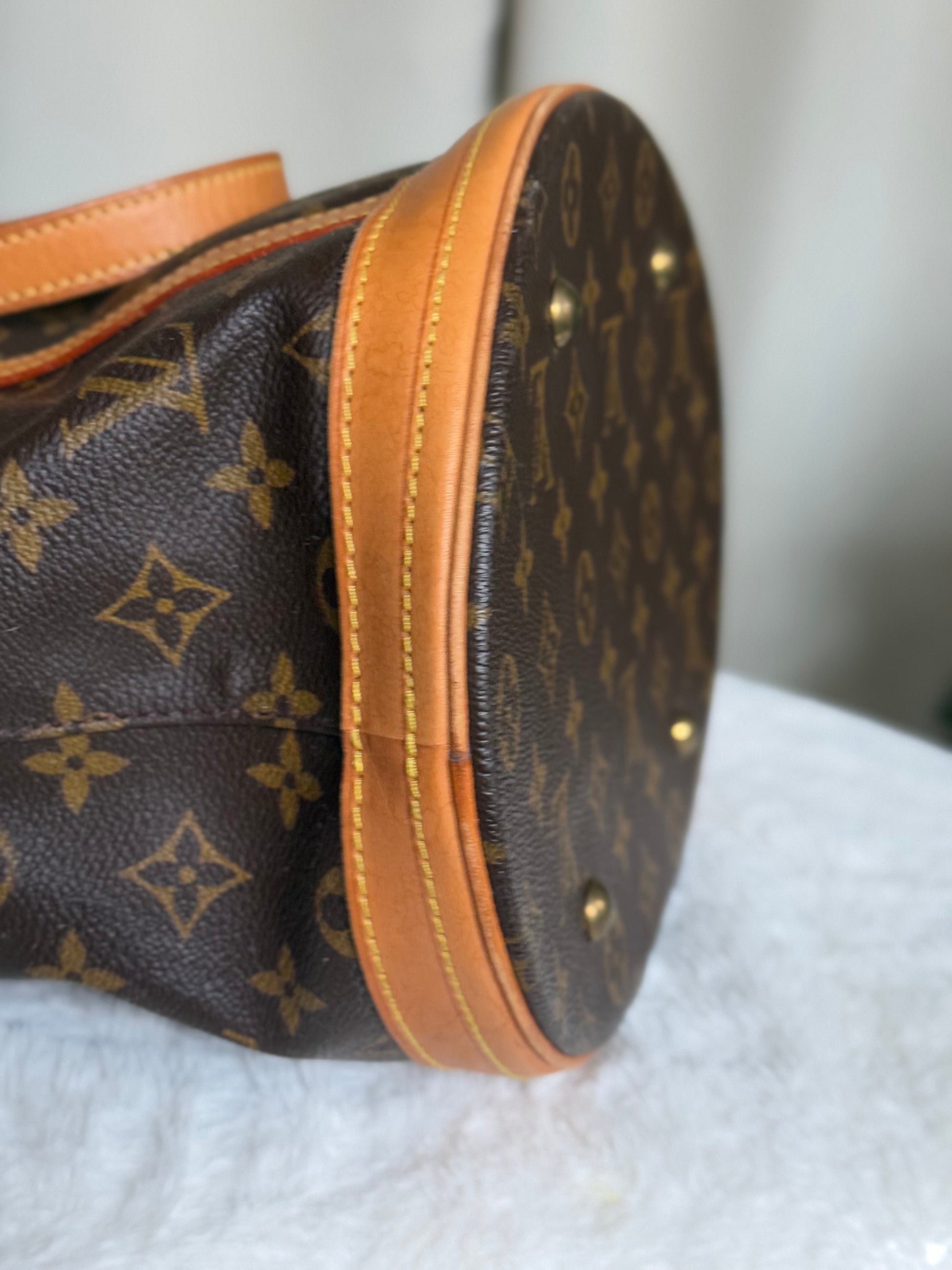 The bag is in EXCELLENT condition for her age of 25yo! No flaws on canvas: . Vachetta has lovely patina; trim is solid. Interior has no stickiness, just scuffs and stretched area due to use. Hardware is golden and no tarnish. No offensive odors, comes from pet and smoke free home.