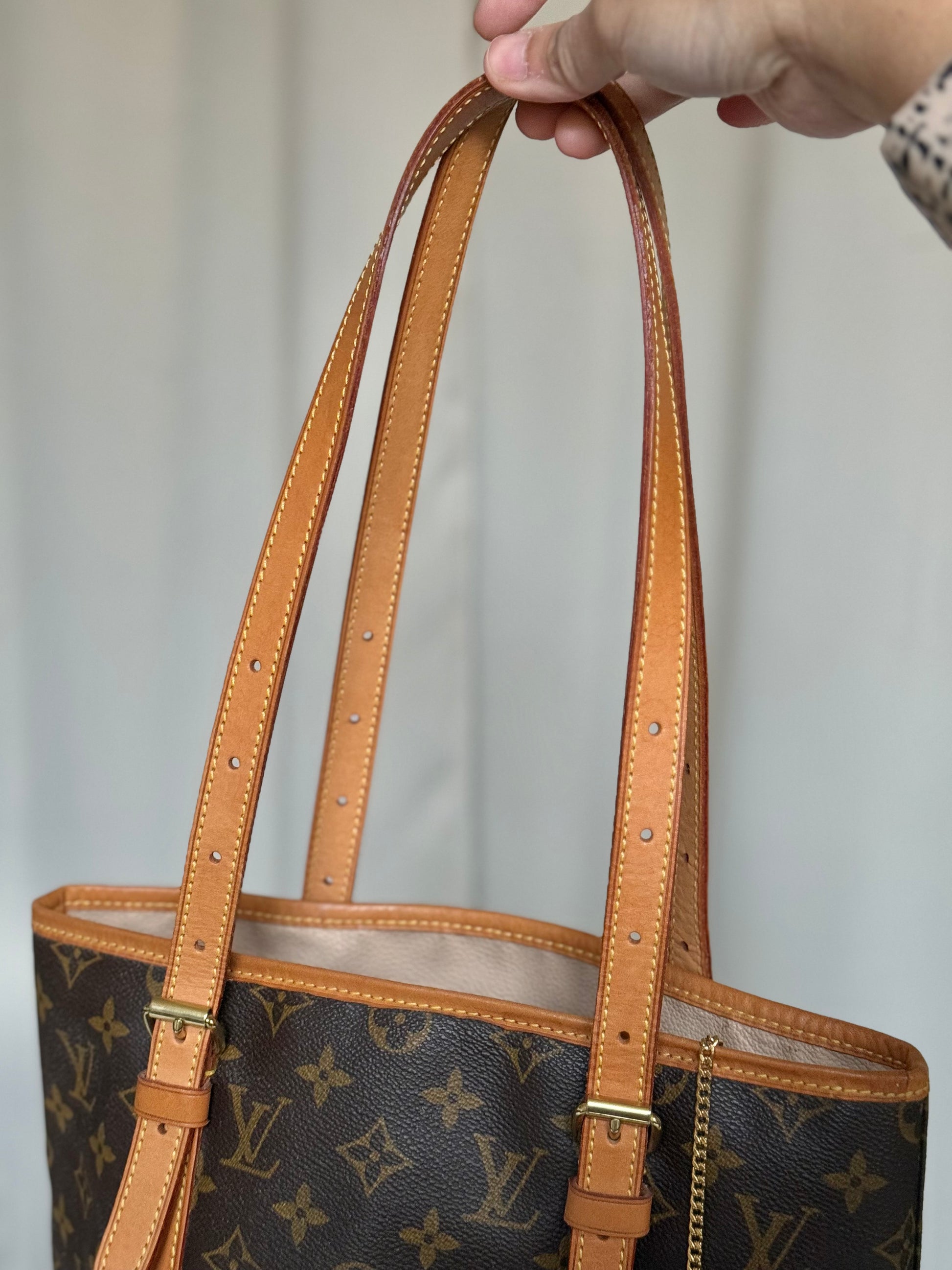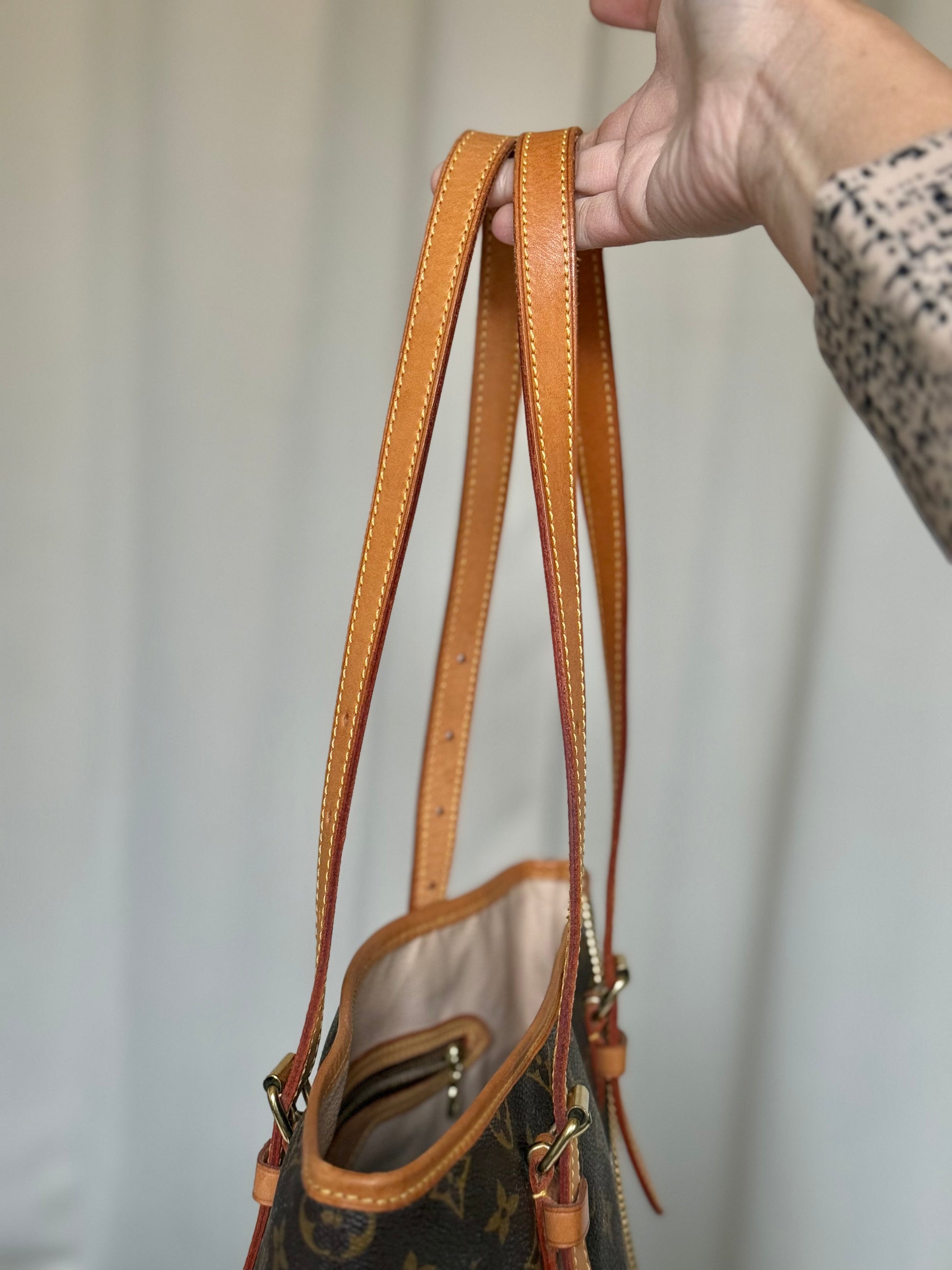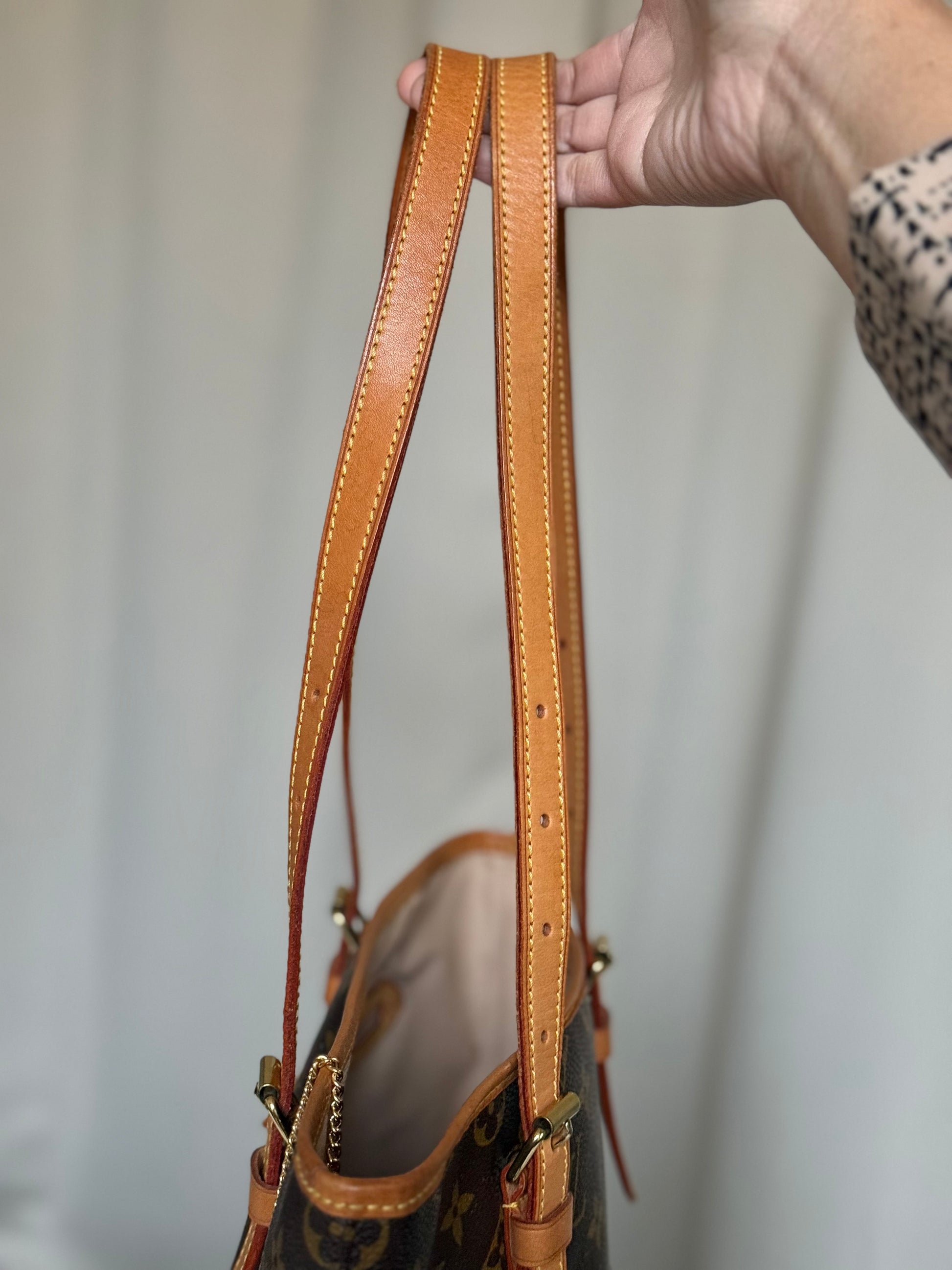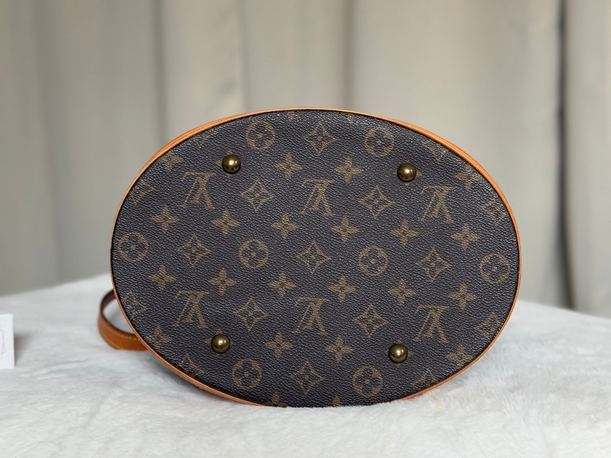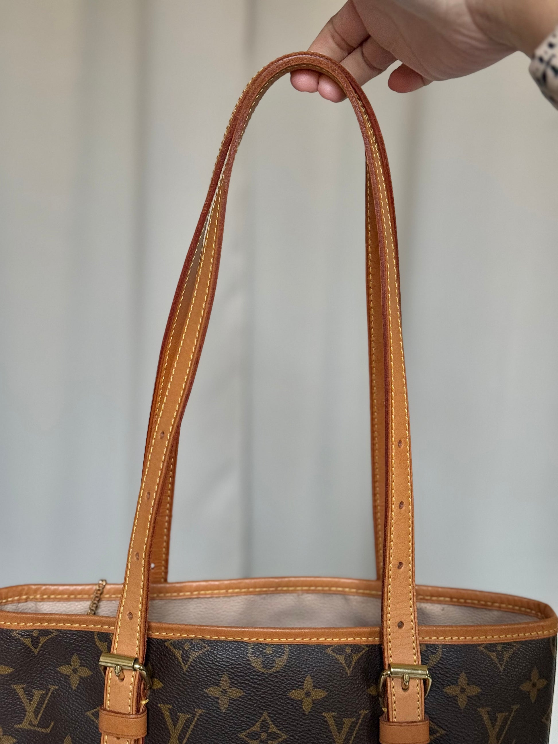 The bag is in EXCELLENT condition for her age of 25yo! No flaws on canvas: . Vachetta has lovely patina; trim is solid. Interior has no stickiness, just scuffs and stretched area due to use. Hardware is golden and no tarnish. No offensive odors, comes from pet and smoke free home.