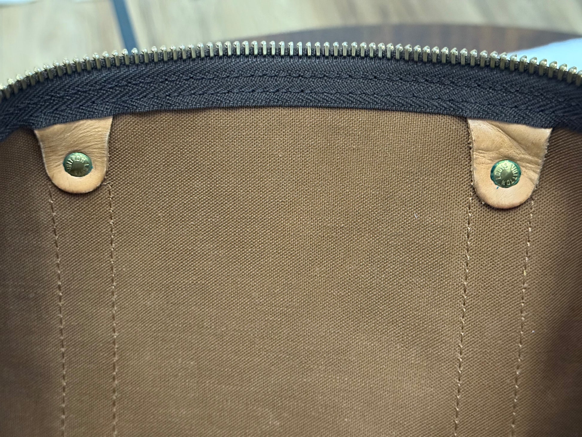 The bag is in EXCELLENT vintage condition! Canvas is bright and clean with no flaws. Vachetta leather is still solid and in great vintage shape but with marks as shown. Hardware has tarnish. Interior is clean with vintage smell. Glazing is still solid. Crossbody vachetta strap is visibly lighter than the bag’s vachetta. It will be shipped folded. No offensive smell, comes from pet and smoke free home.