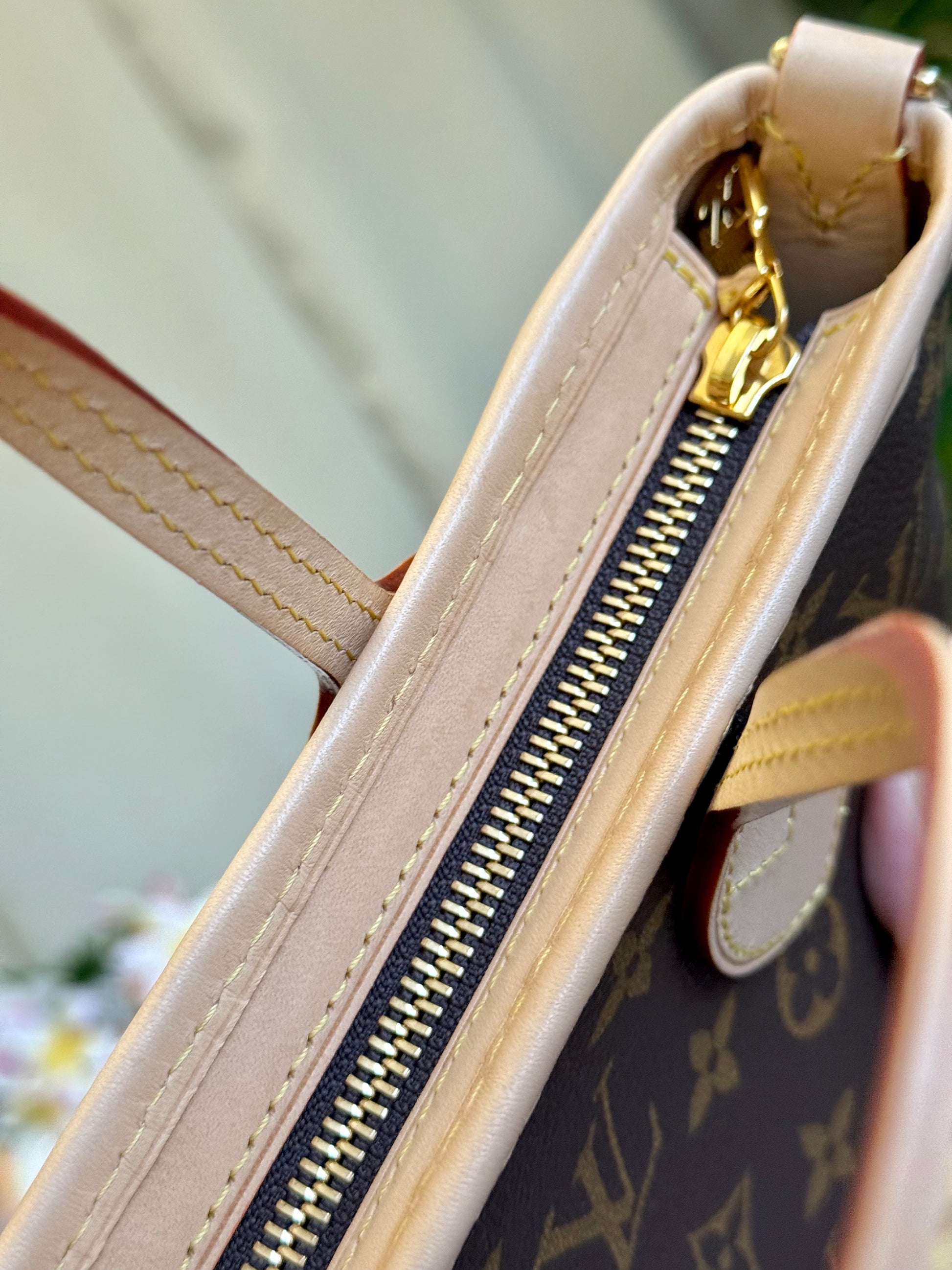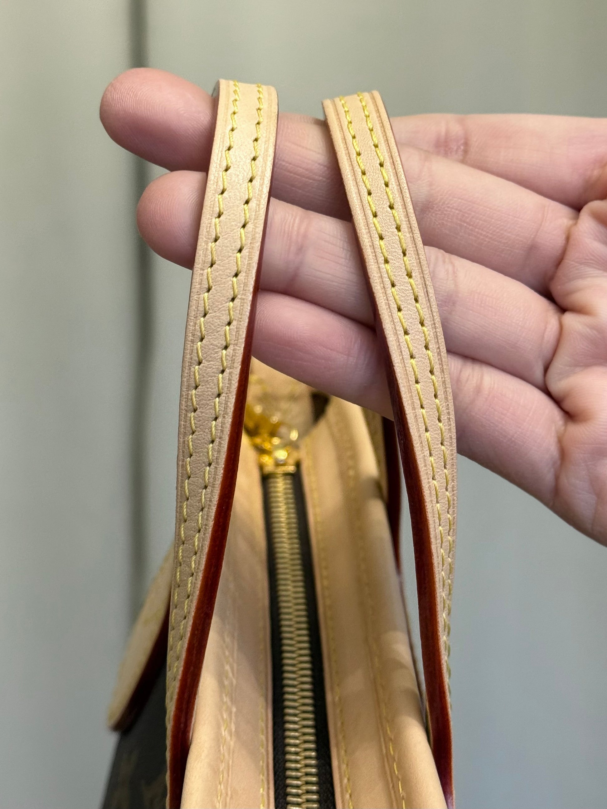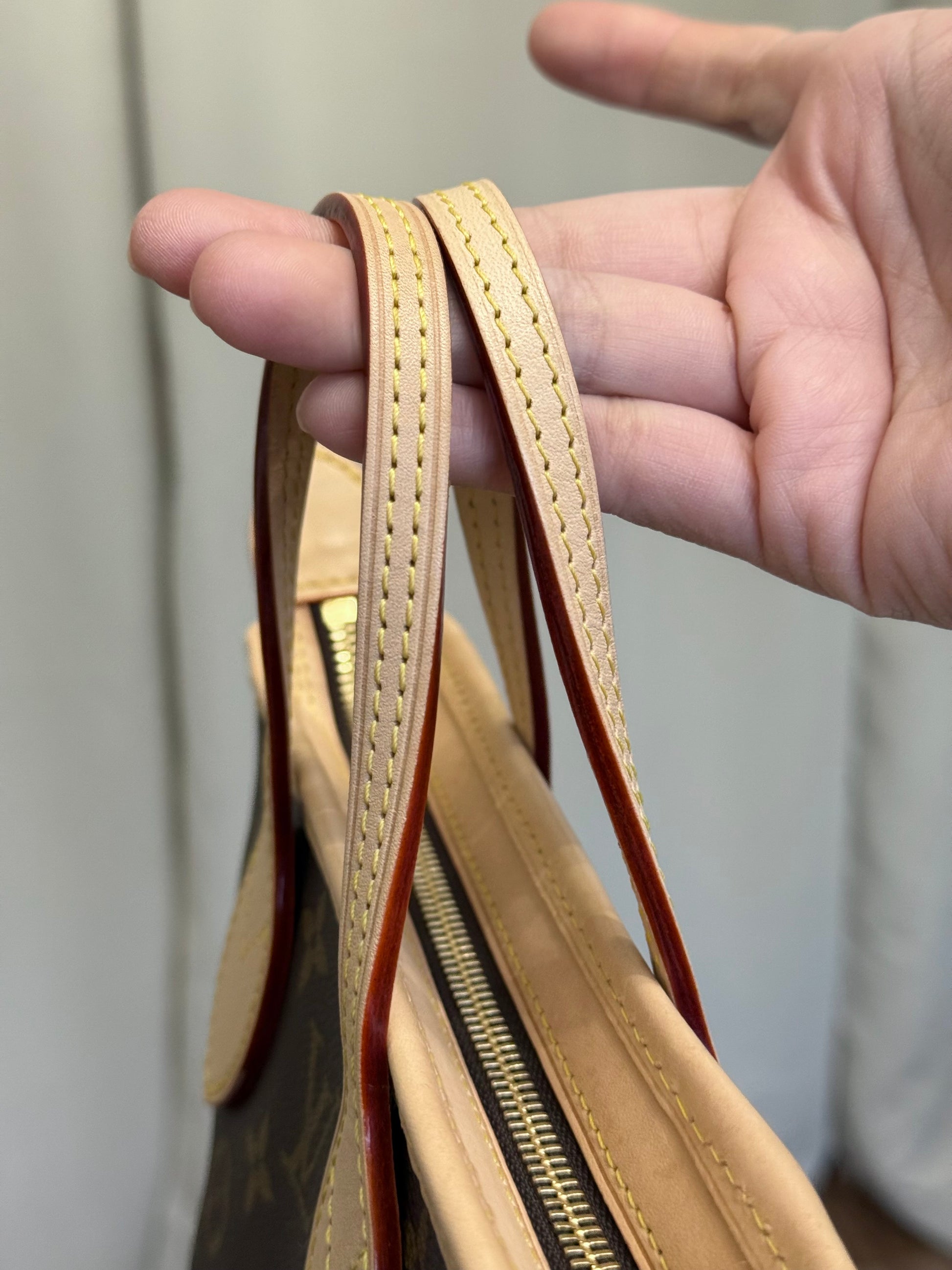 The bagis in PRISTINE/like new condition! Canvas is bright and clean and no flaws. Vachetta has light patina with faint marks, please see pics. Beige interior is clean with faint marks. Pocket is clean. Hardware is shiny and golden. No offensive odors, comes from pet and smoke free home.