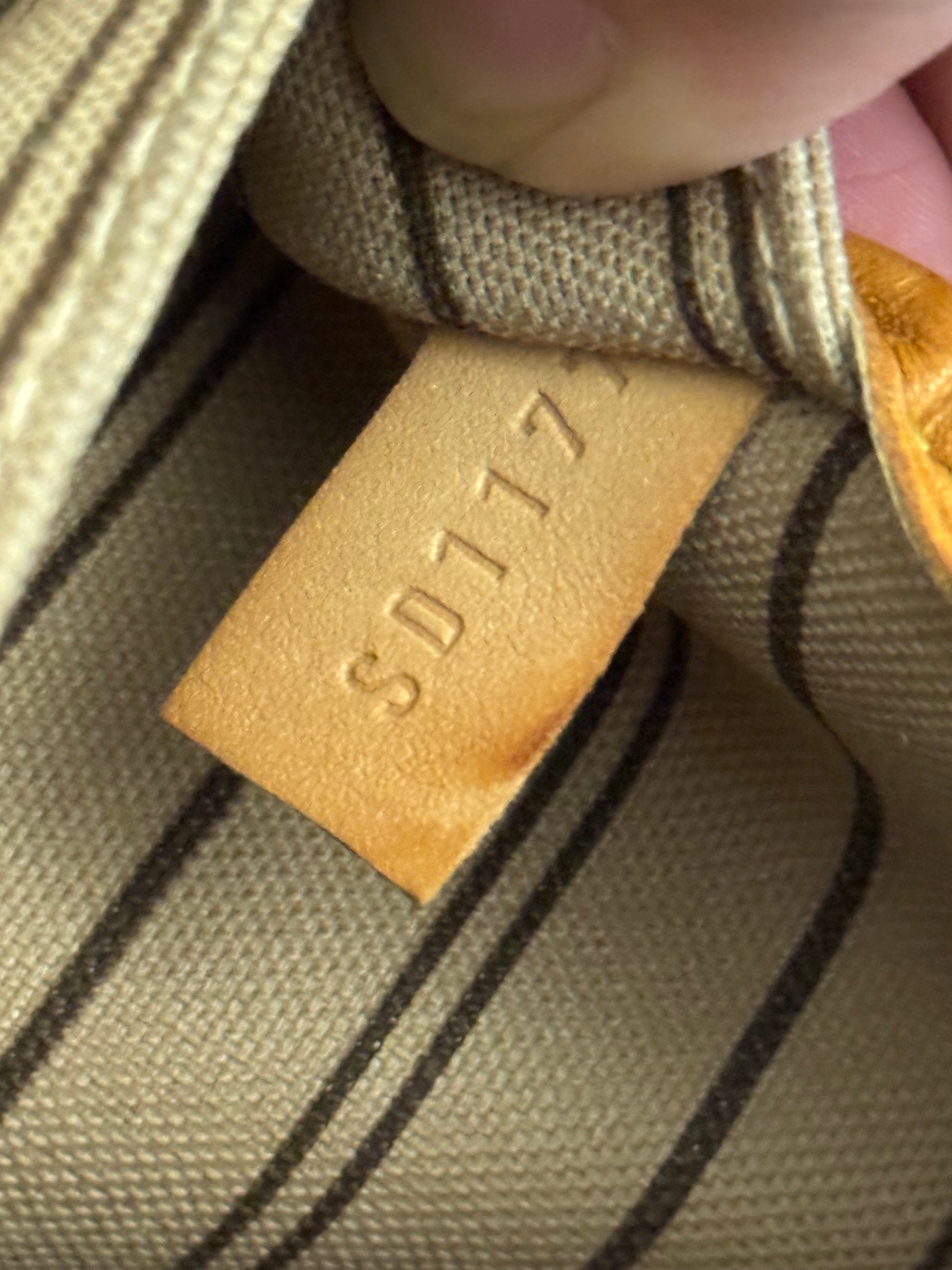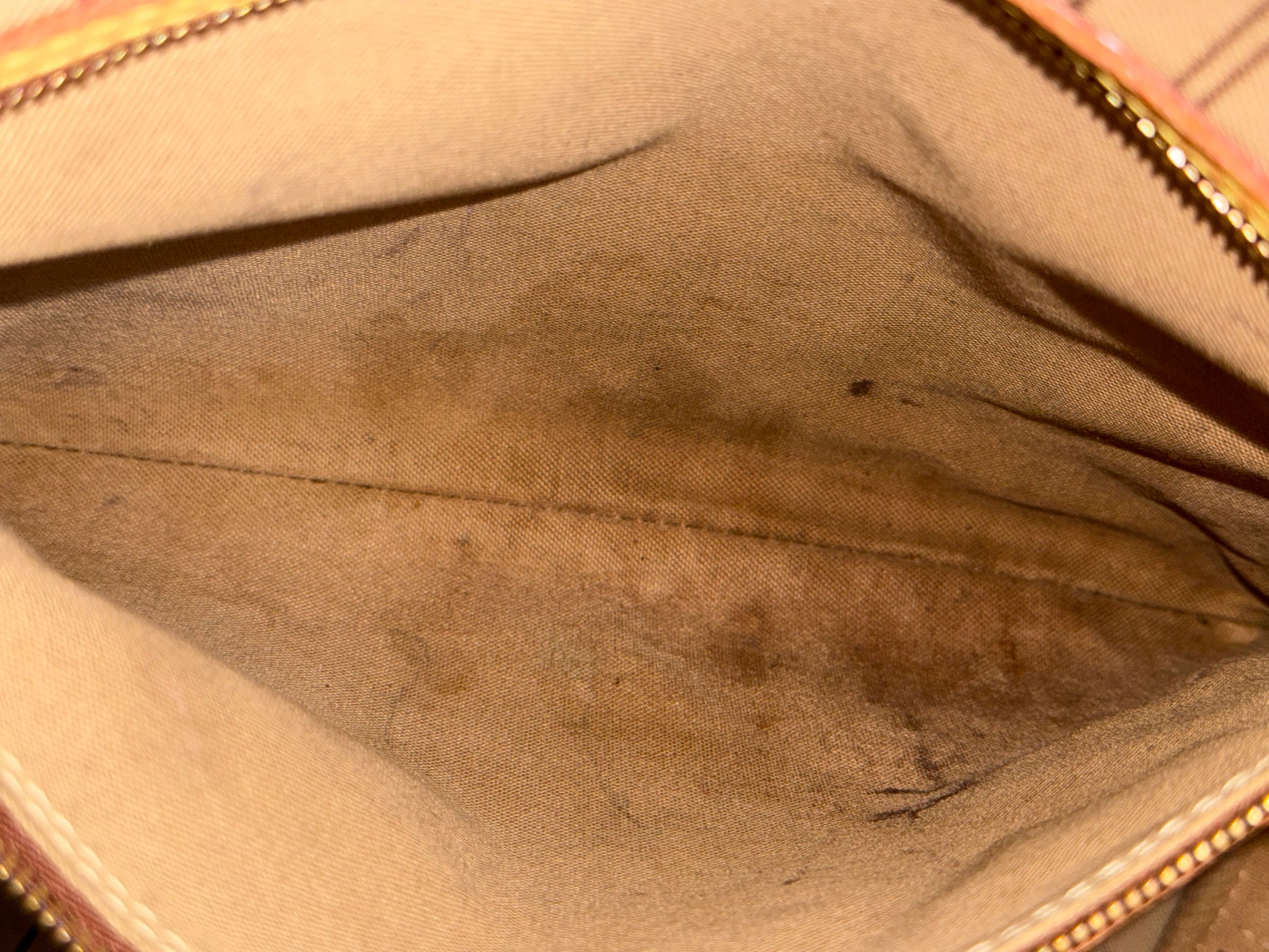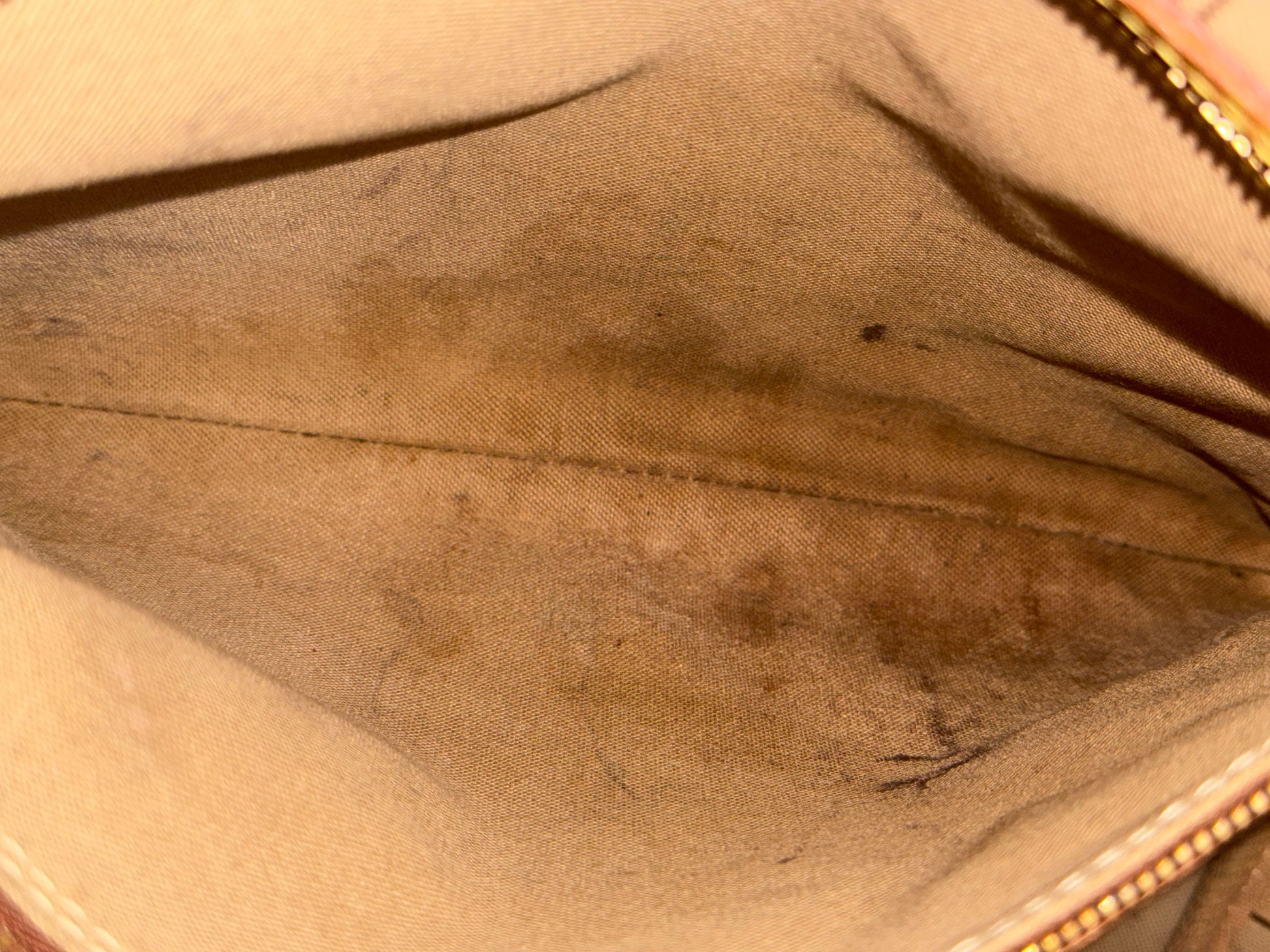Exterior wise the bag is in excellent condition! Canvas has no cracks, bottom corners have minor scuffs. Vachetta trim is solid with marks, vachetta strap is in great shape with patina as well. Interior has marks and pocket has make up stains. Make up smell as well.
