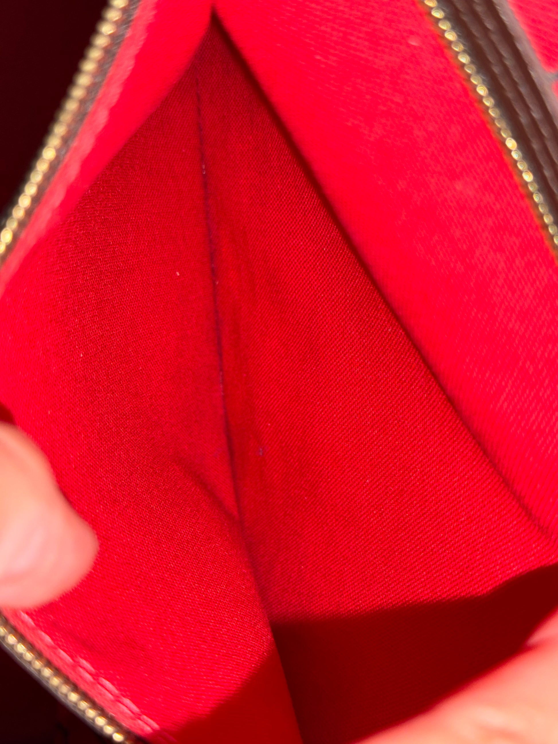 This bag is still in EXCELLENT condition with signs of use! Canvas is bright and beautiful. Exterior corners have minimal rubbing from use. Leather is in excellent and still stiff condition; top trim is still solid with minor scuffing. Hardware is shiny and golden. Interior is generally clean with no odors, it some spots and faint marks. No offensive odor, comes from pet and smoke free home.