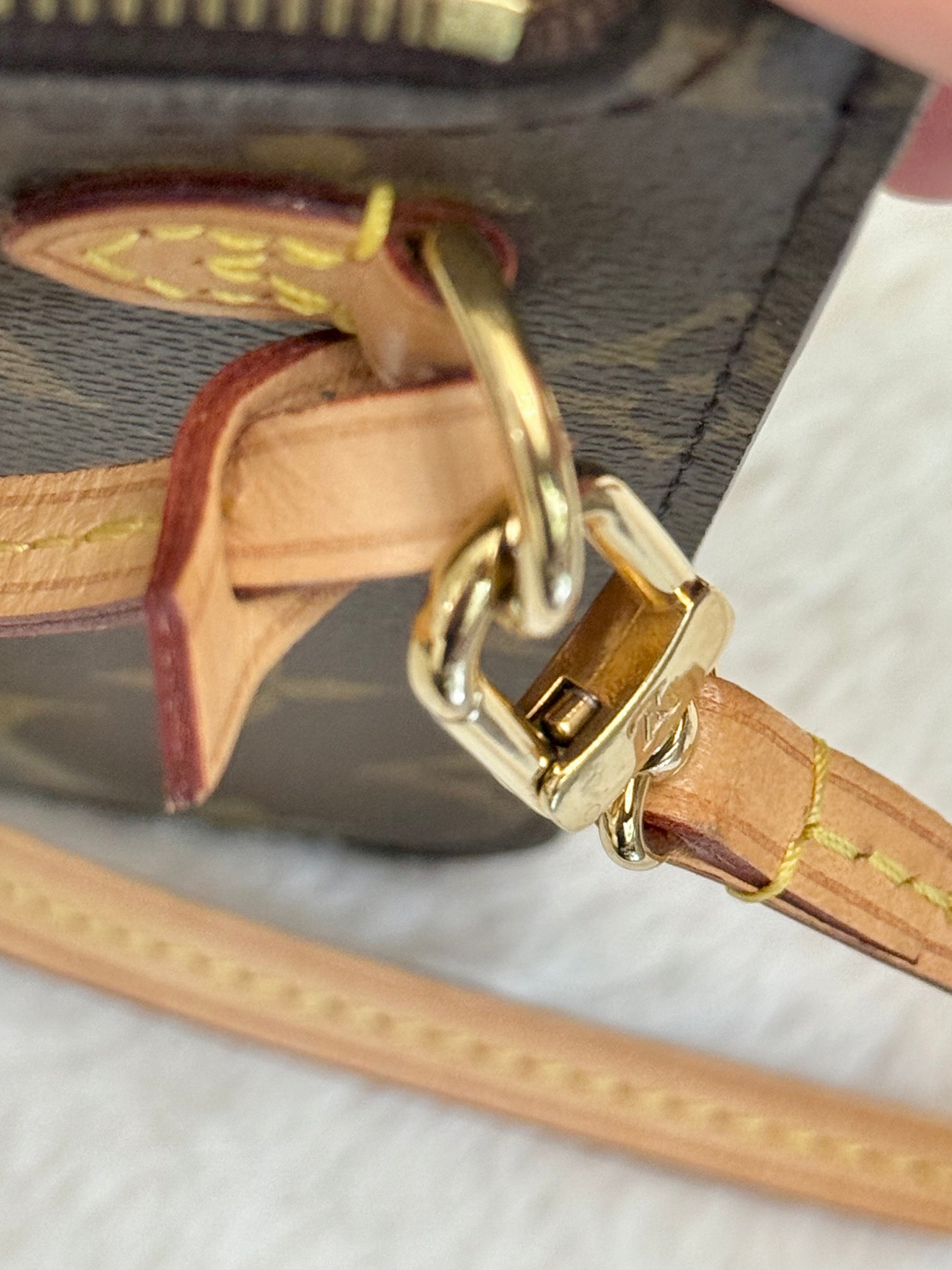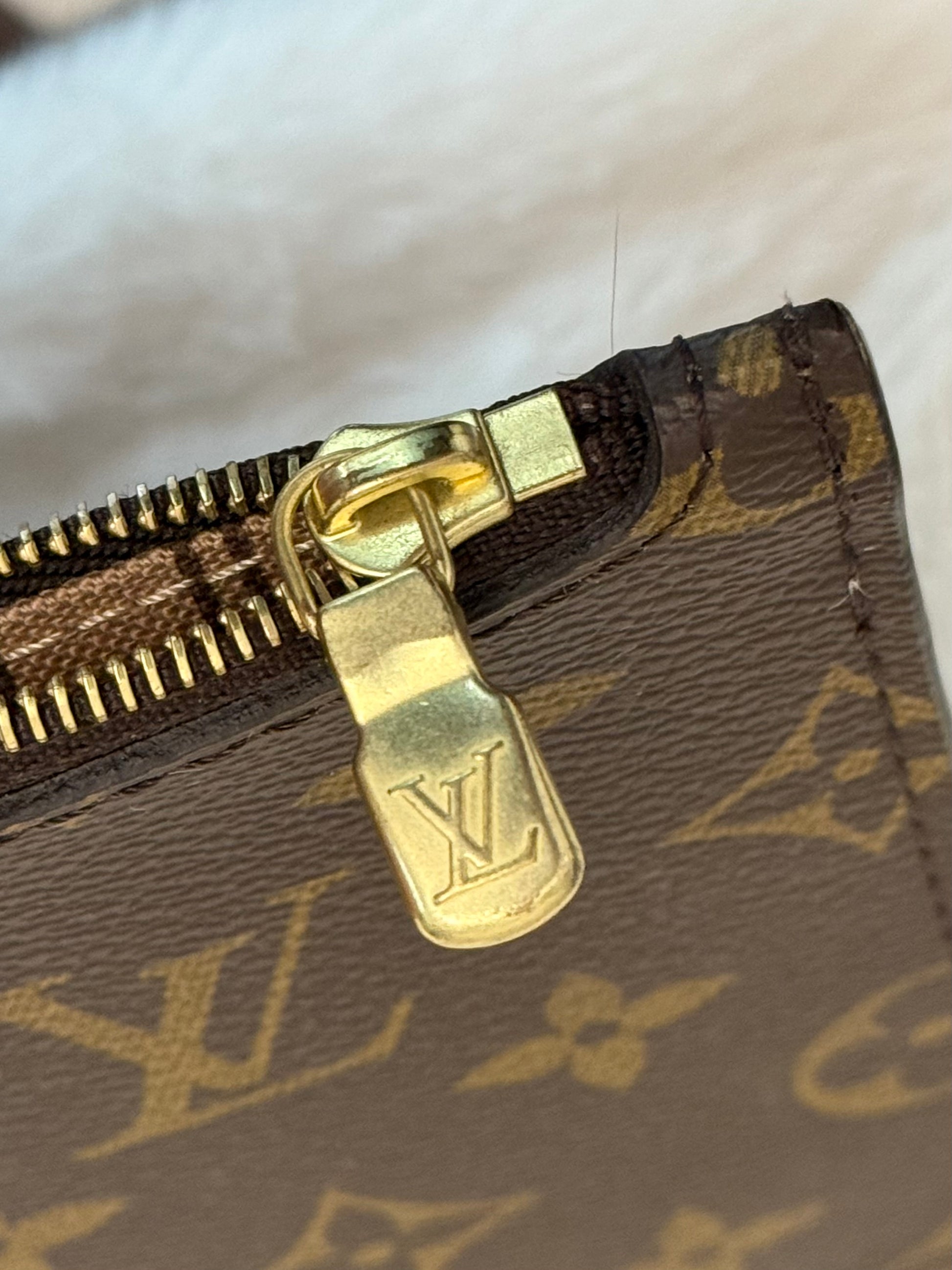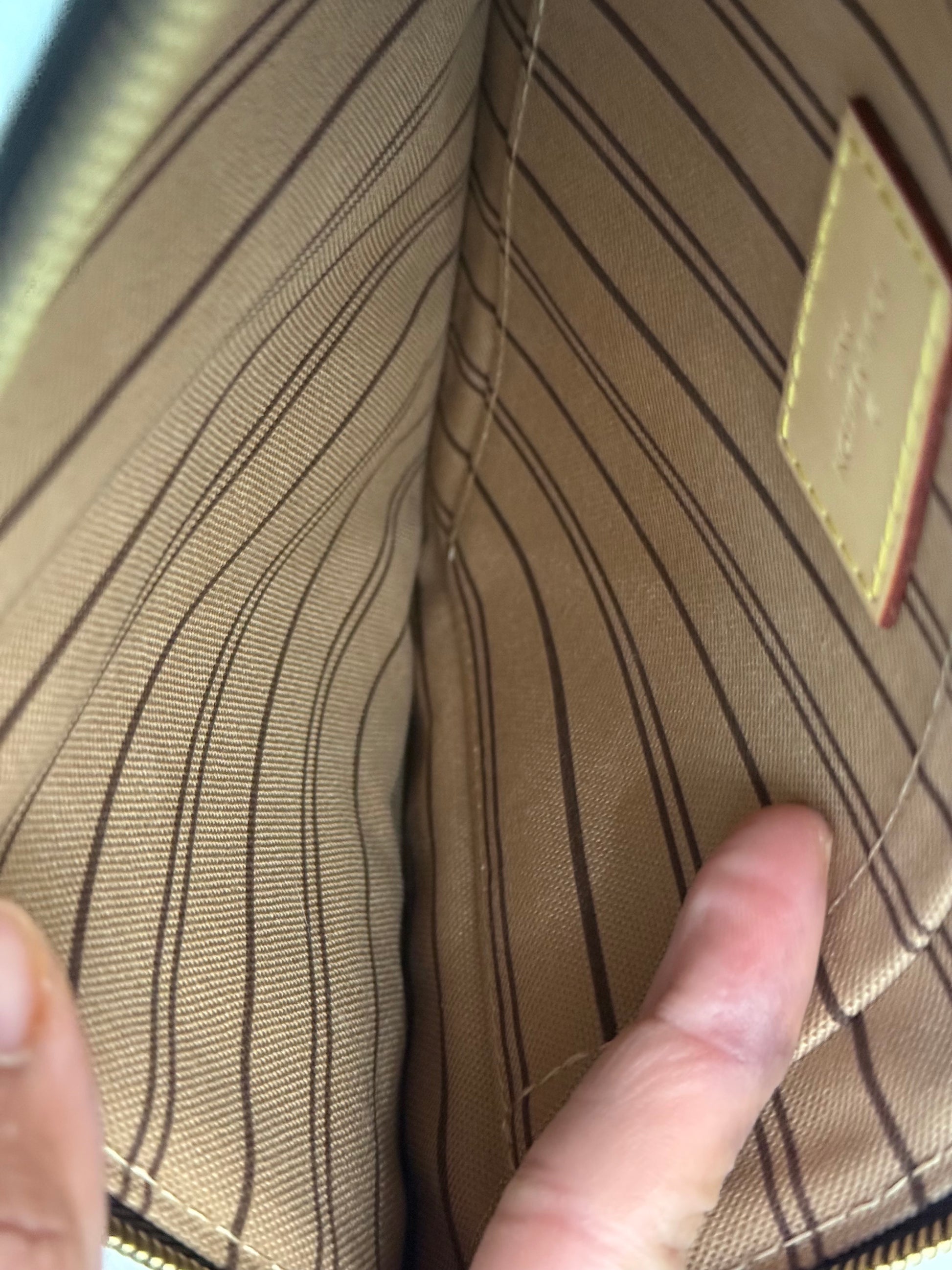 EXCELLENT condition! Canvas is in great shape with minimal scuffs on bottom corners. Vachetta all throughout the bag has light patina with marks. Interior has pen marks in one corner. Cinches are curled up due to previous owner cinched and gathered the leather when she used it. Pouch is in excellent condition. No offensive smell, comes from pet and smoke free home.