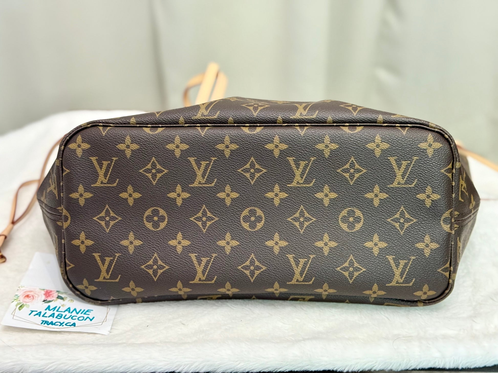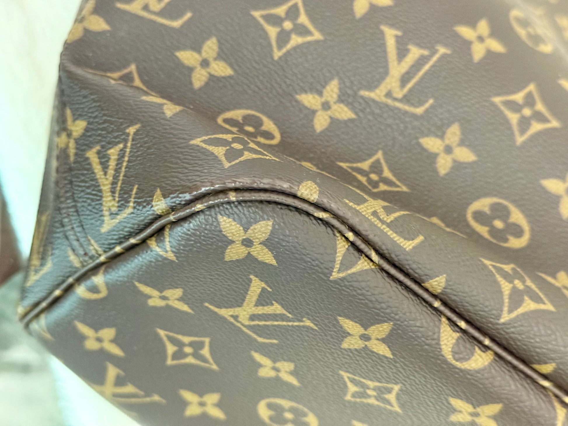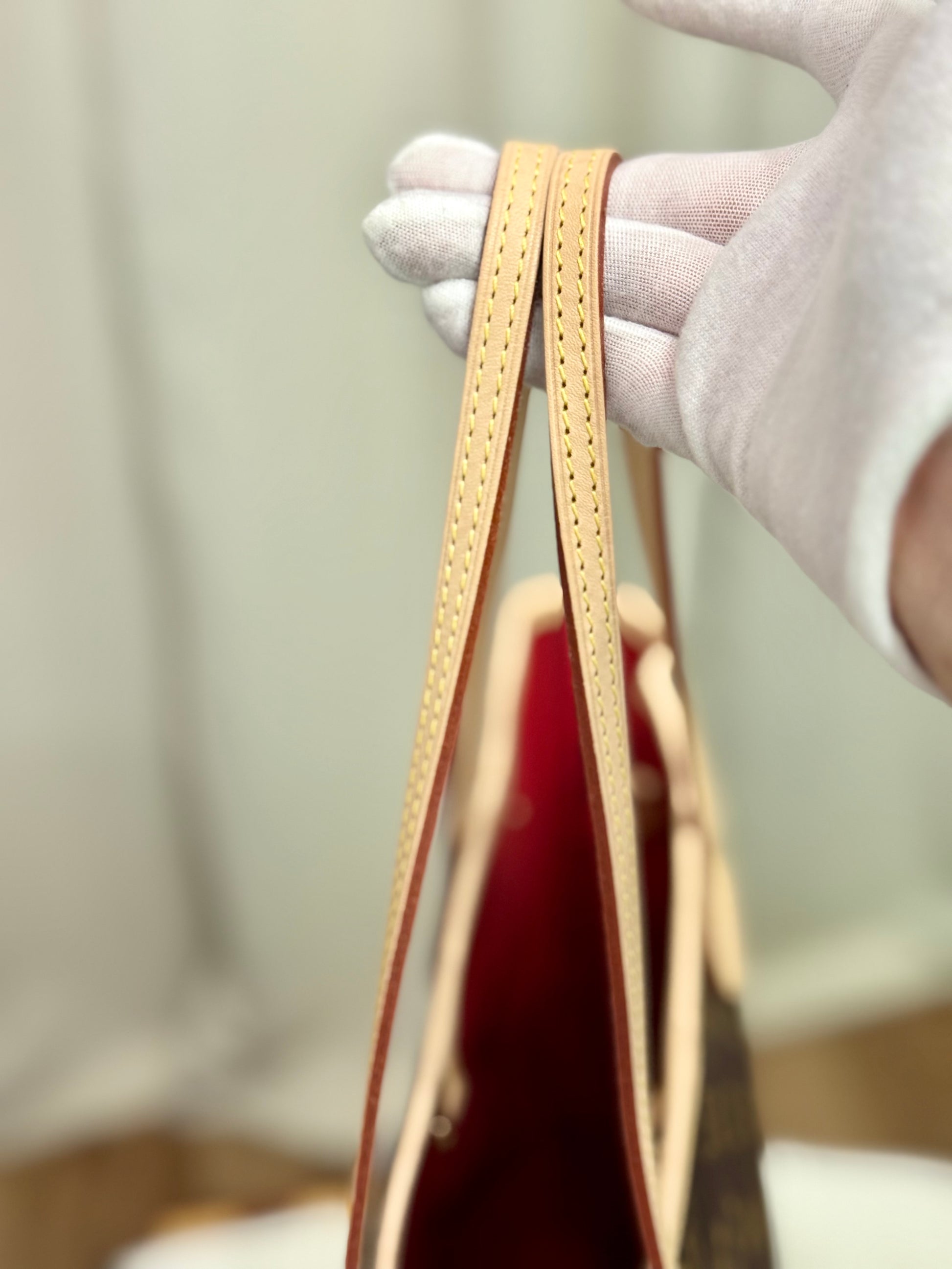 The bag is in LIKE NEW/PRISTINE condition! Canvas is bright and beautiful. Vachetta leather has no patina with faint marks on chaps. Hardware is shiny and golden. Interior is clean. No offensive odor, comes from pet and smoke free home.