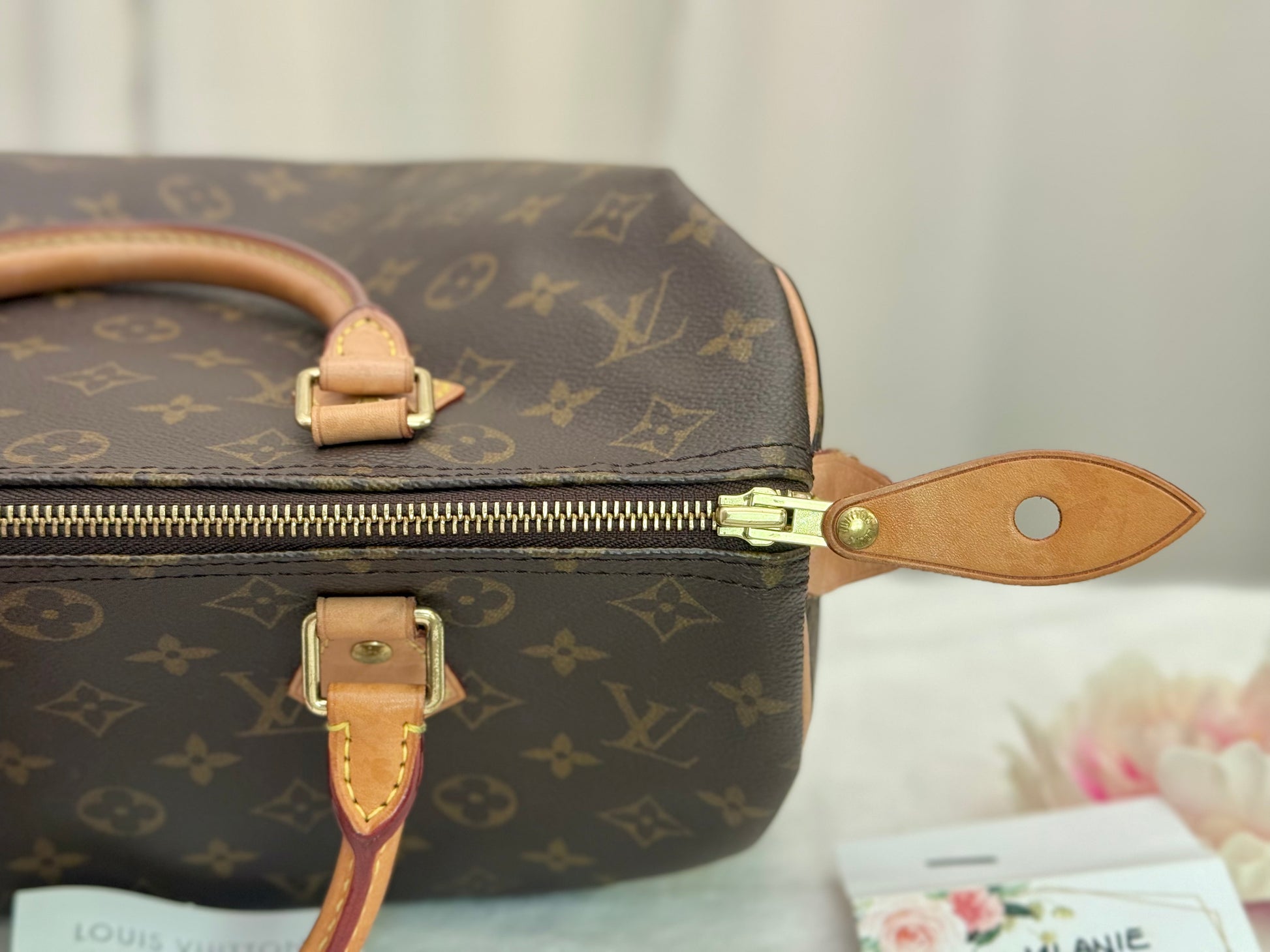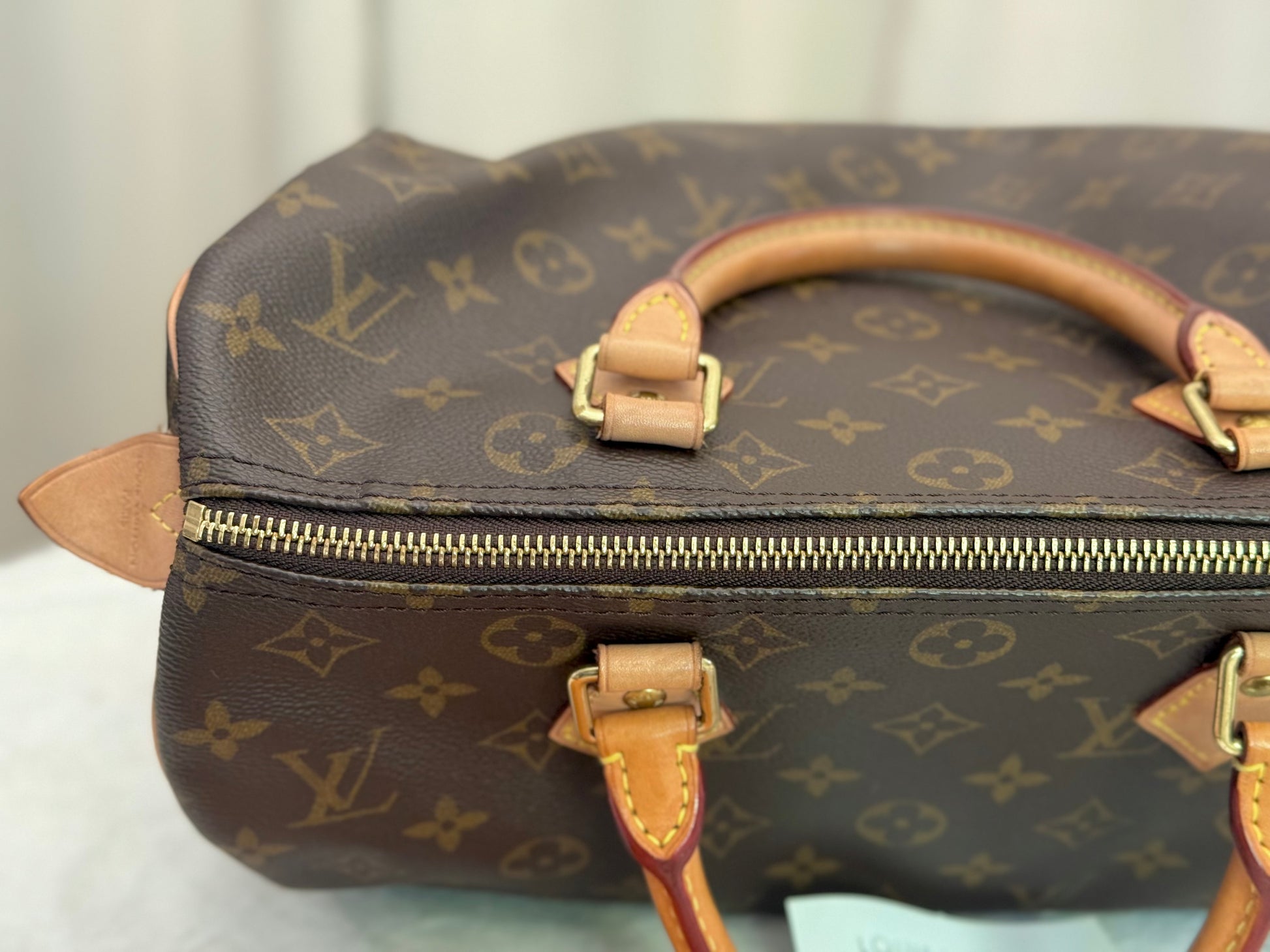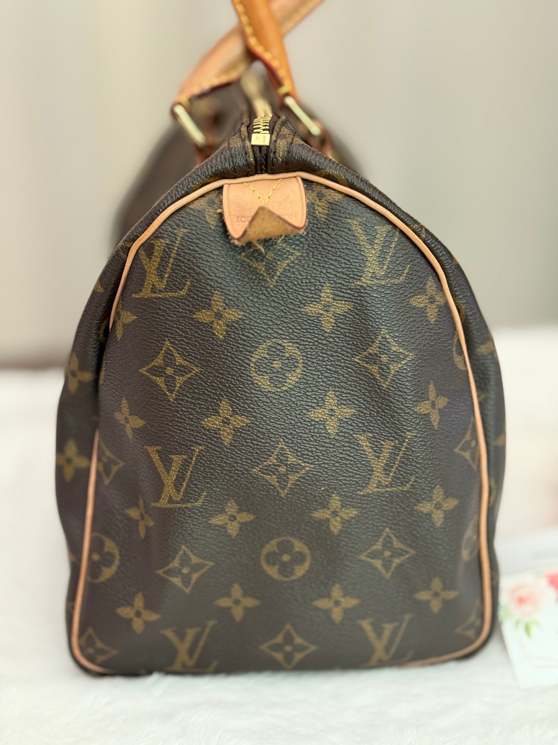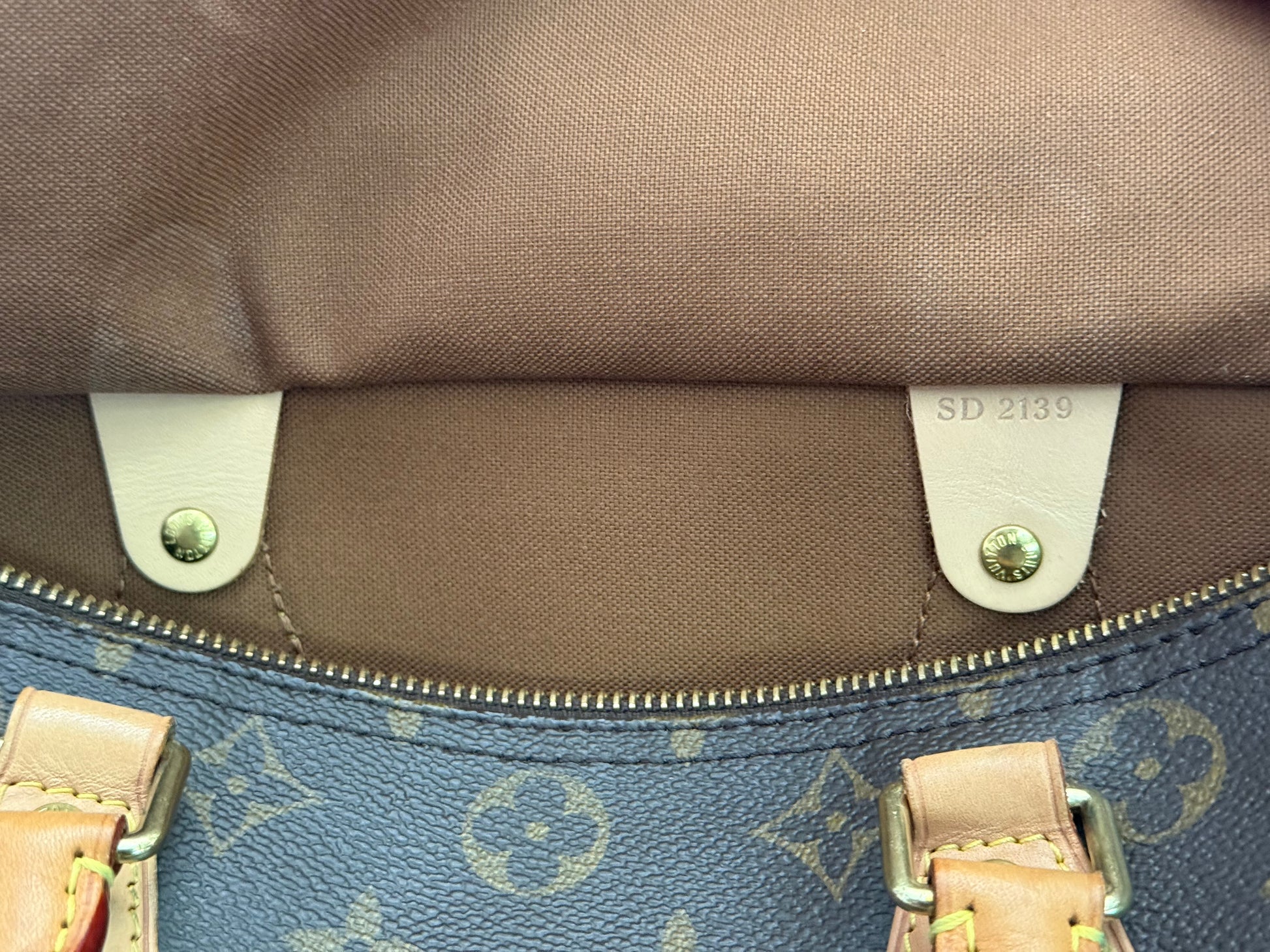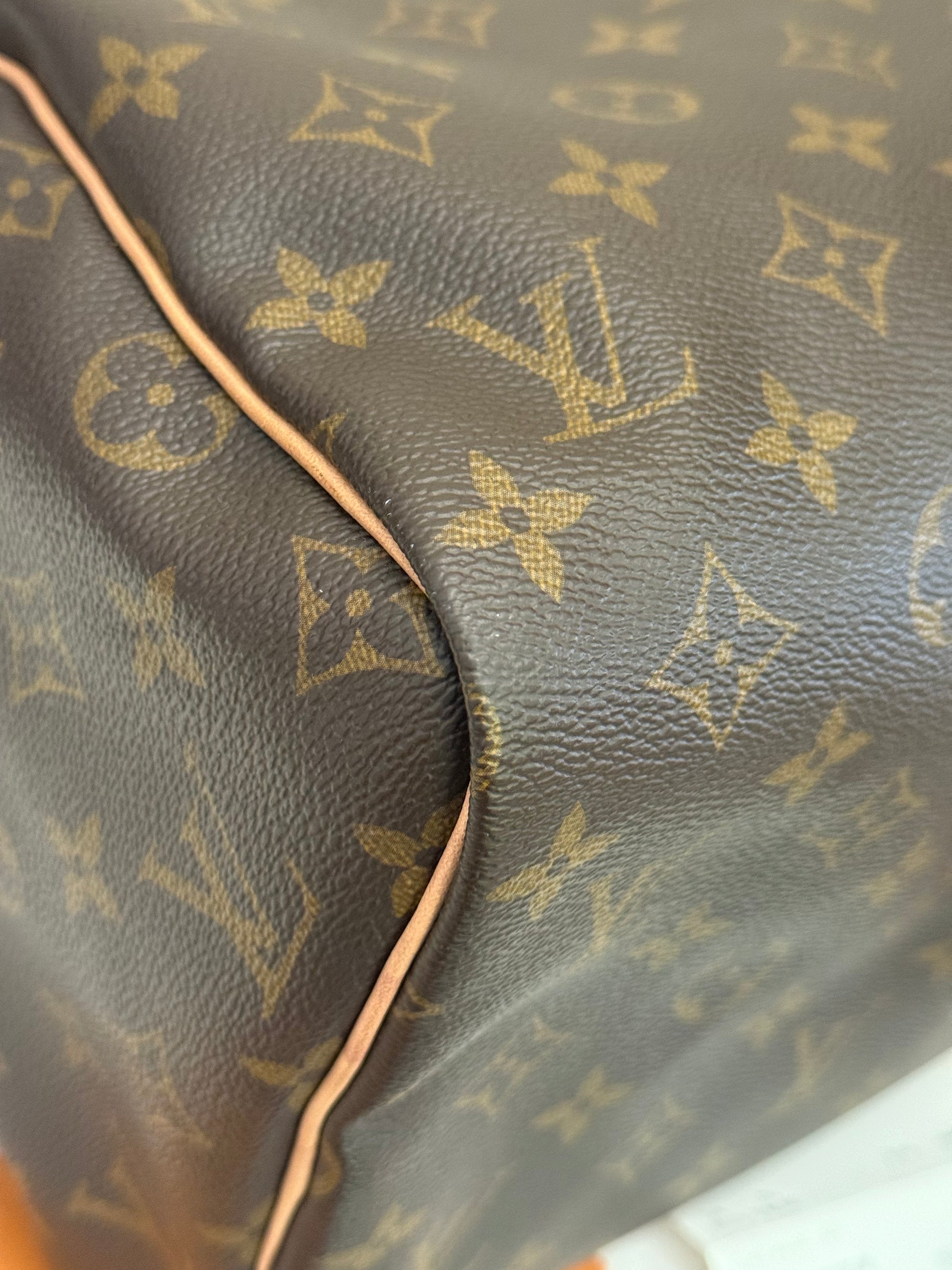 In EXCELLENT CONDITION! Canvas is bright and clean and no cracks. Hardware is still golden, zipper runs smooth. Vachetta has patina with marks, one handle is darker than the other one. Interior has minor marks. No offensive odors, comes from smoke and pet free home. It will shipped folded.