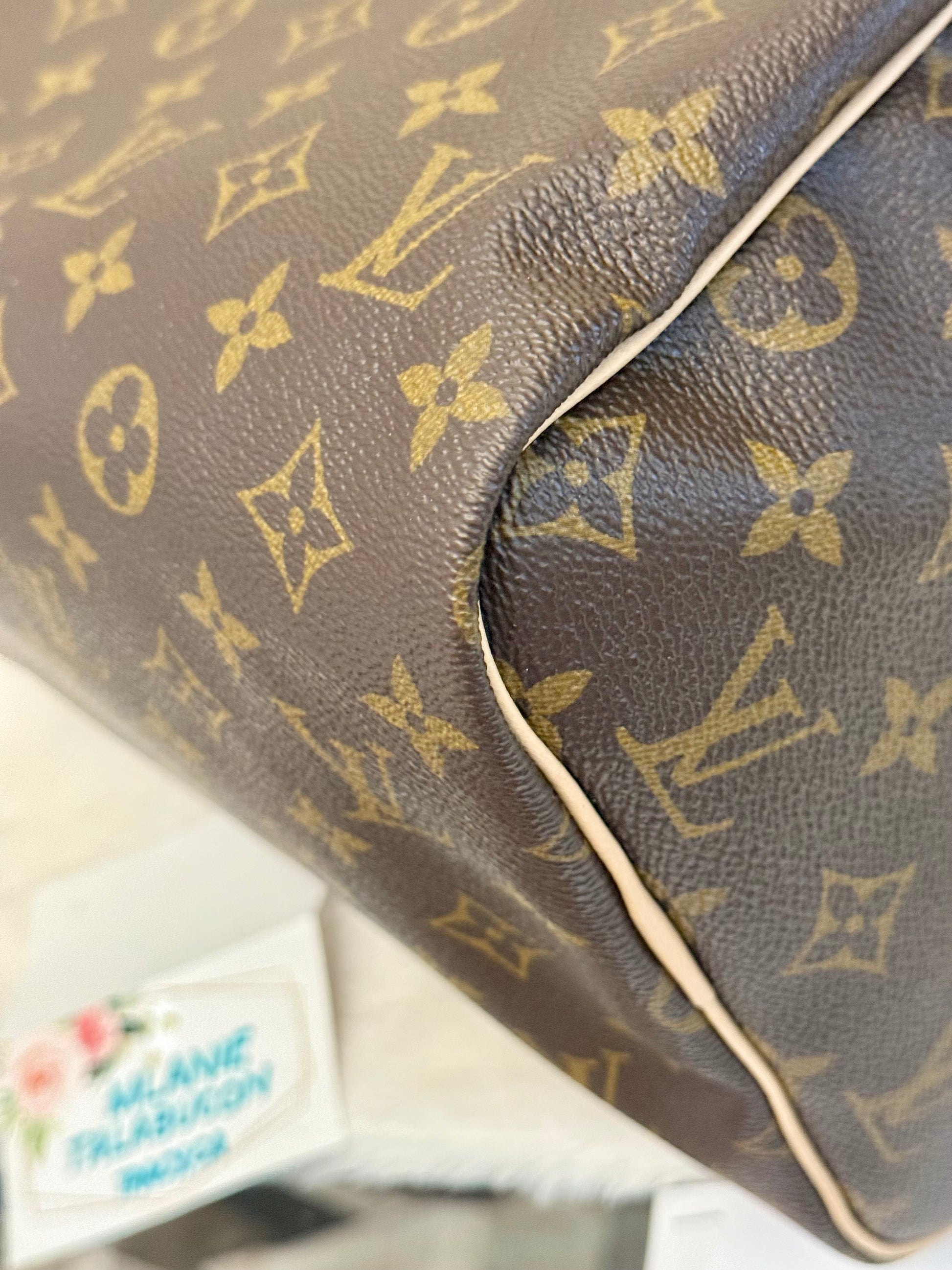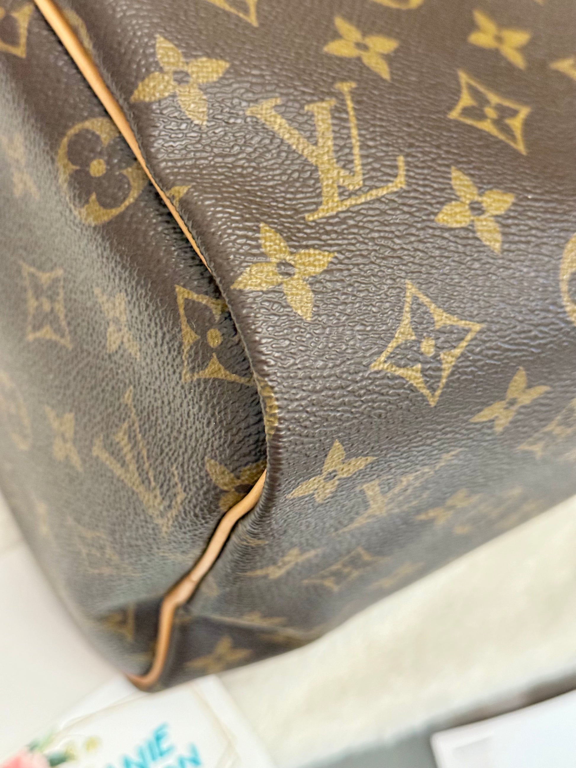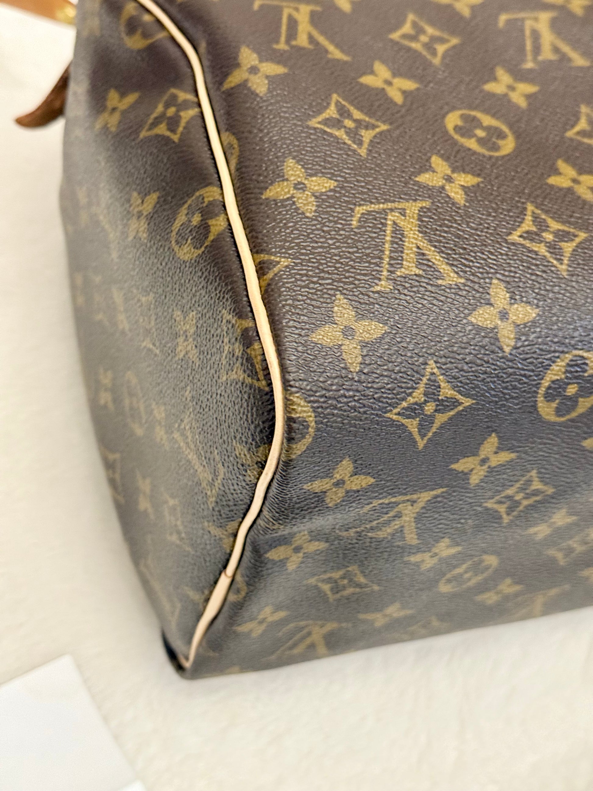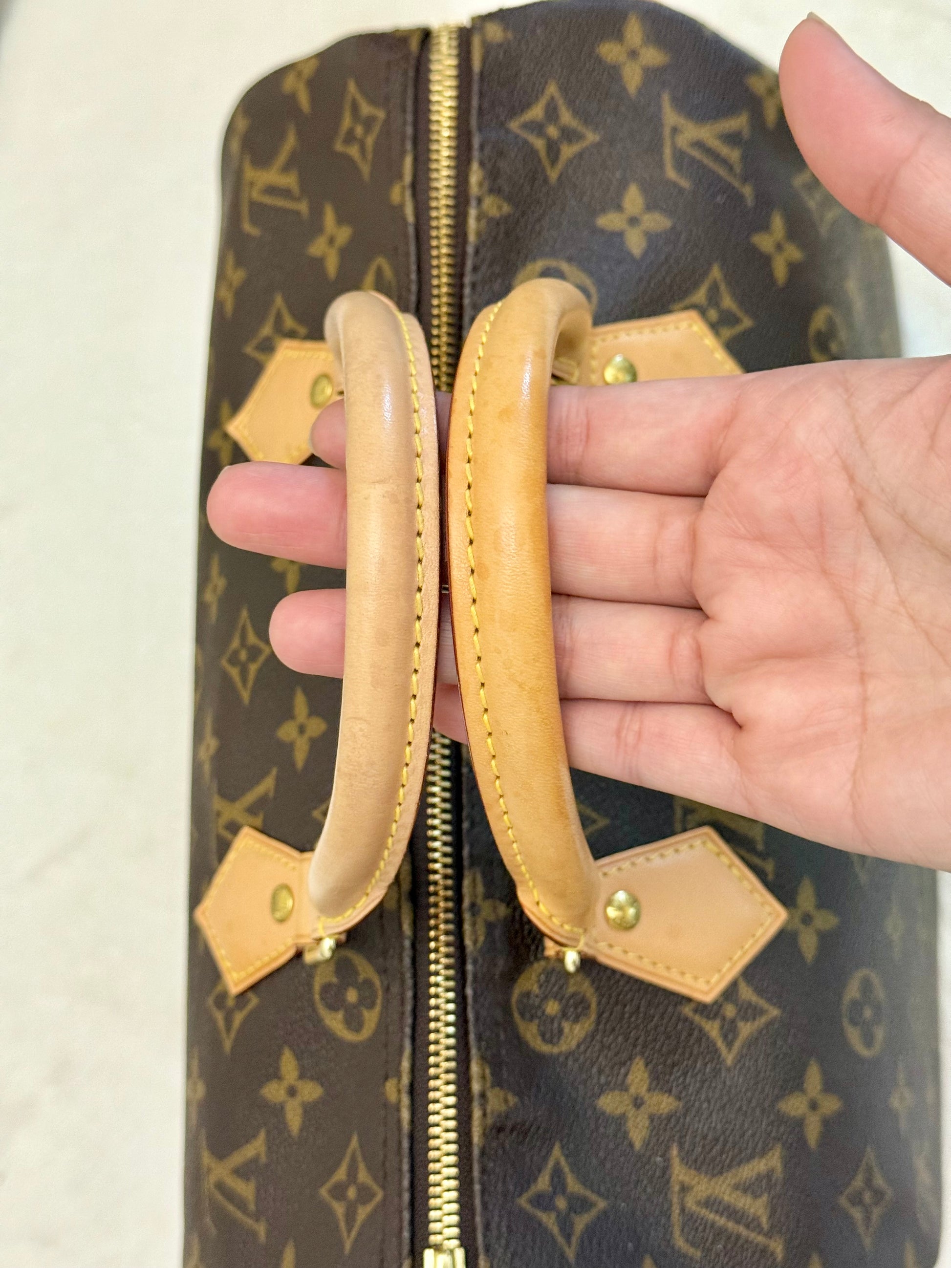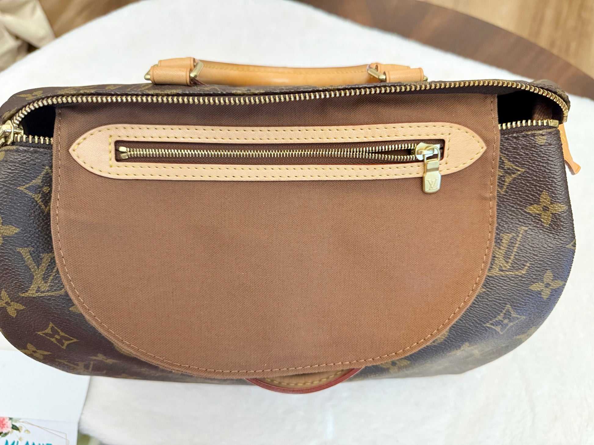 In EXCELLENT CONDITION! Clean inside and out! Canvas is bright and clean and no cracks. Hardware is golden, zipper runs smooth. Vachetta has patina, one handle has more than the other. Interior is clean. No offensive odors, comes from smoke and pet free home. It will shipped folded.