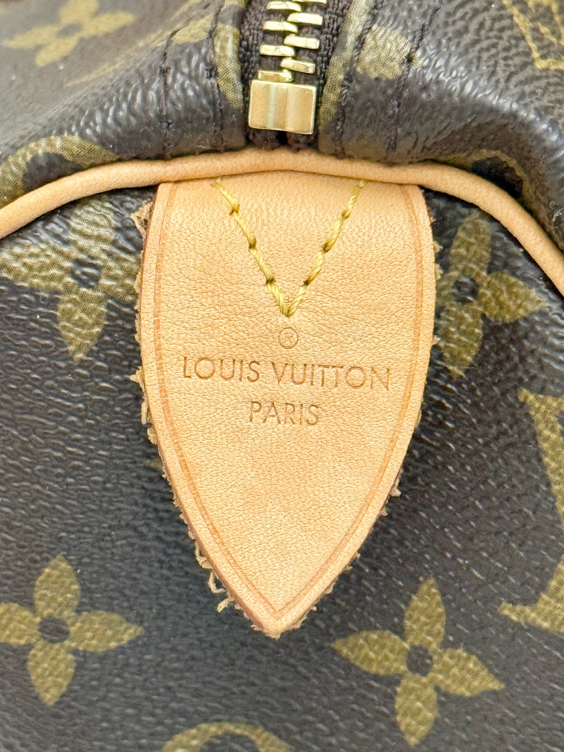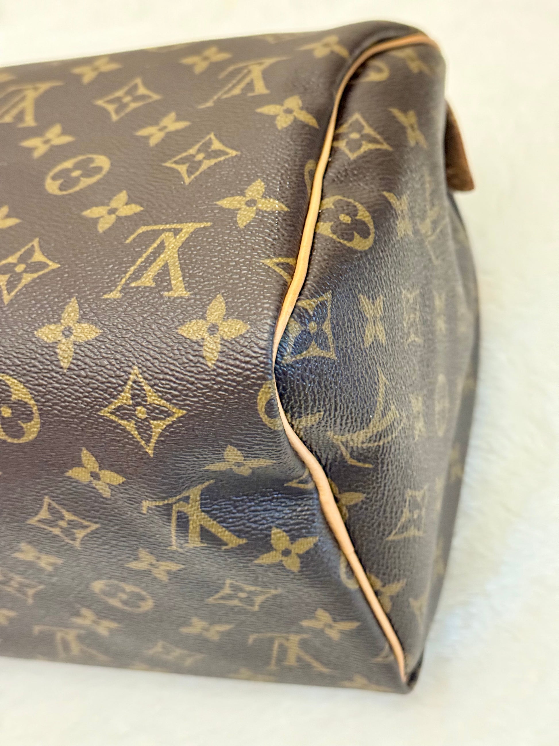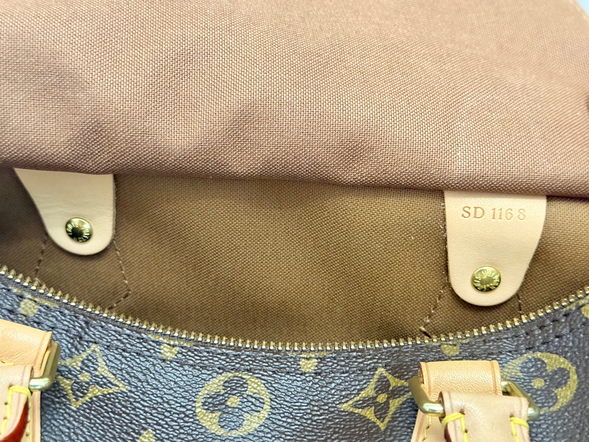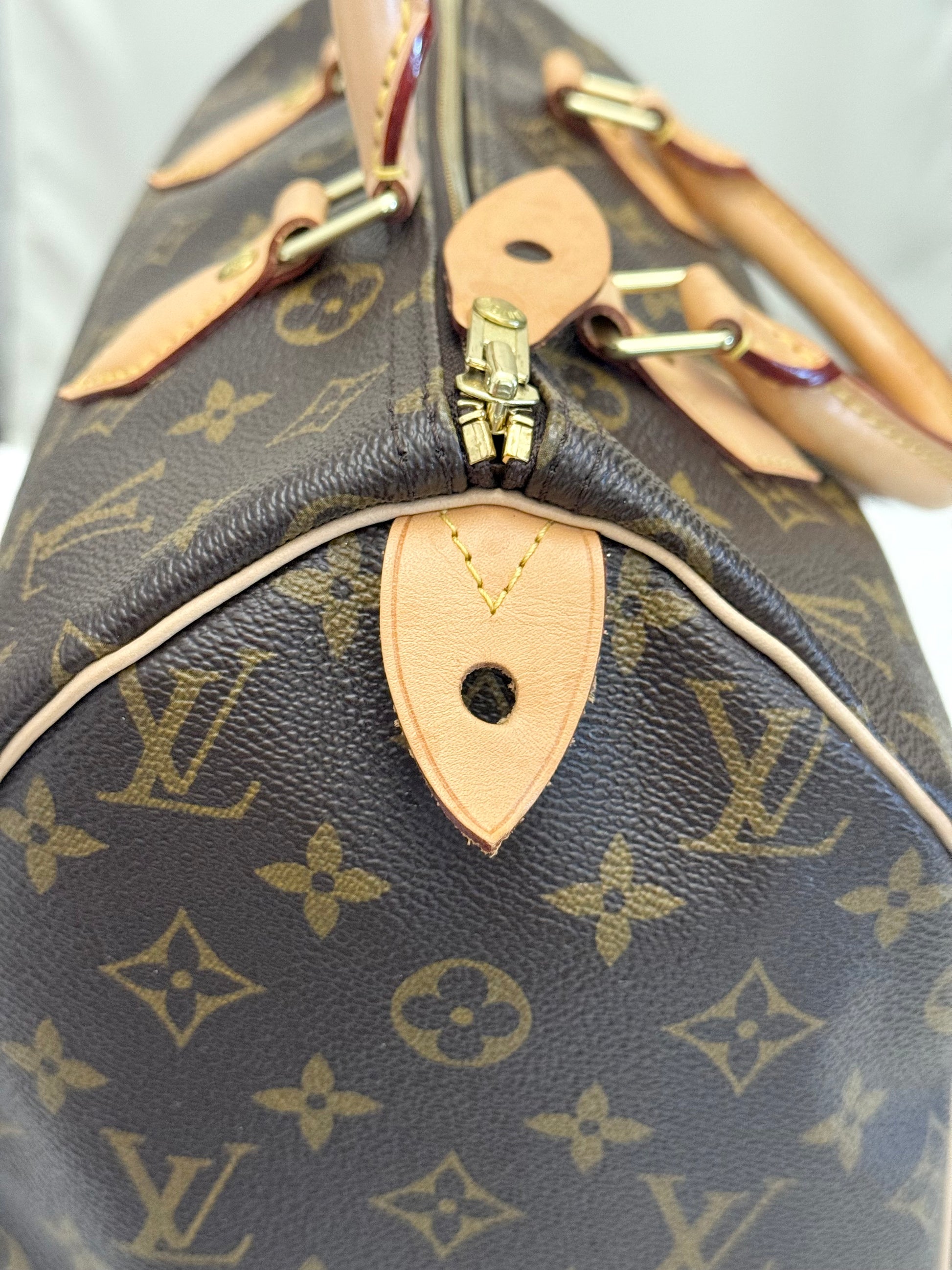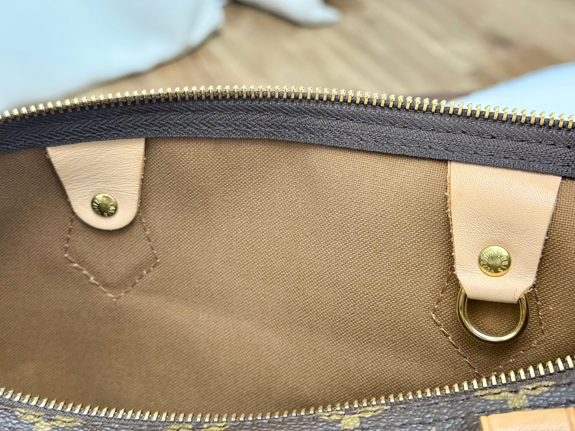 In EXCELLENT CONDITION! Clean inside and out! Canvas is bright and clean and no cracks. Hardware is golden, zipper runs smooth. Vachetta has patina, one handle has more than the other. Interior is clean. No offensive odors, comes from smoke and pet free home. It will shipped folded.