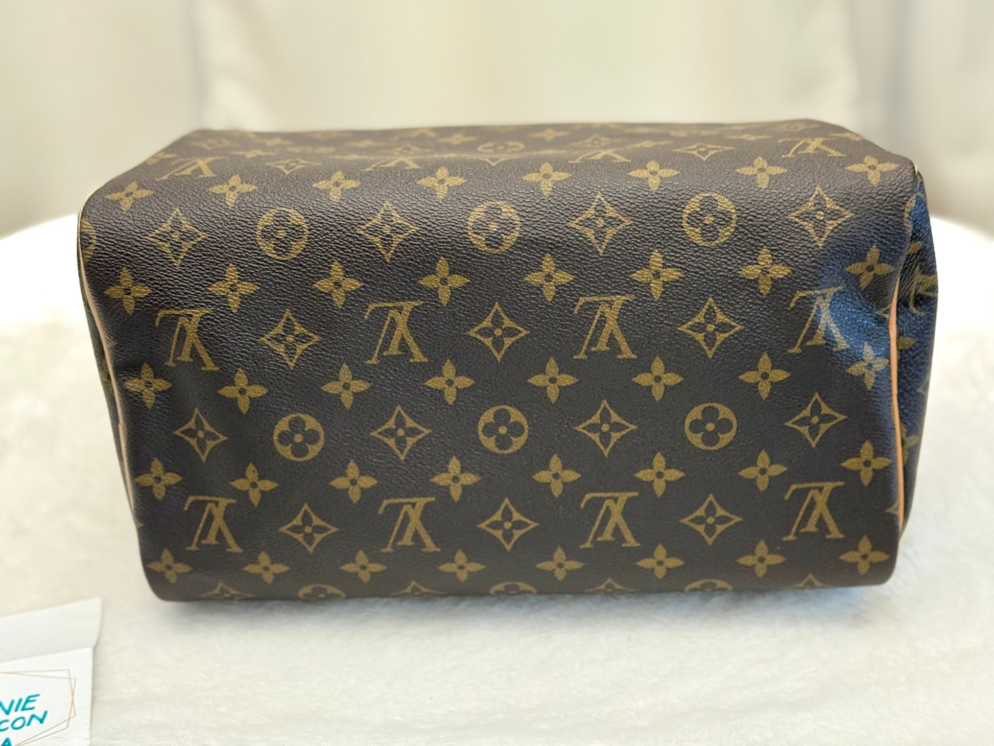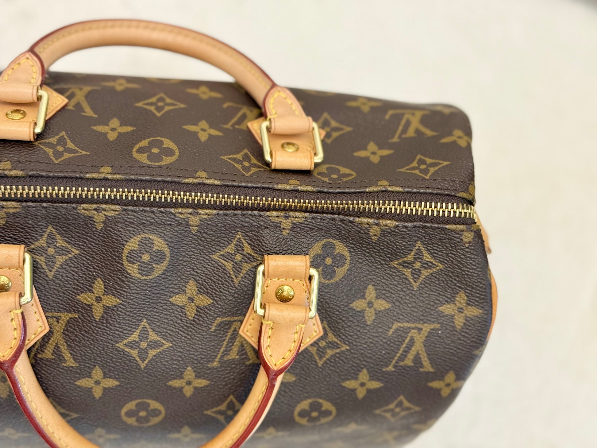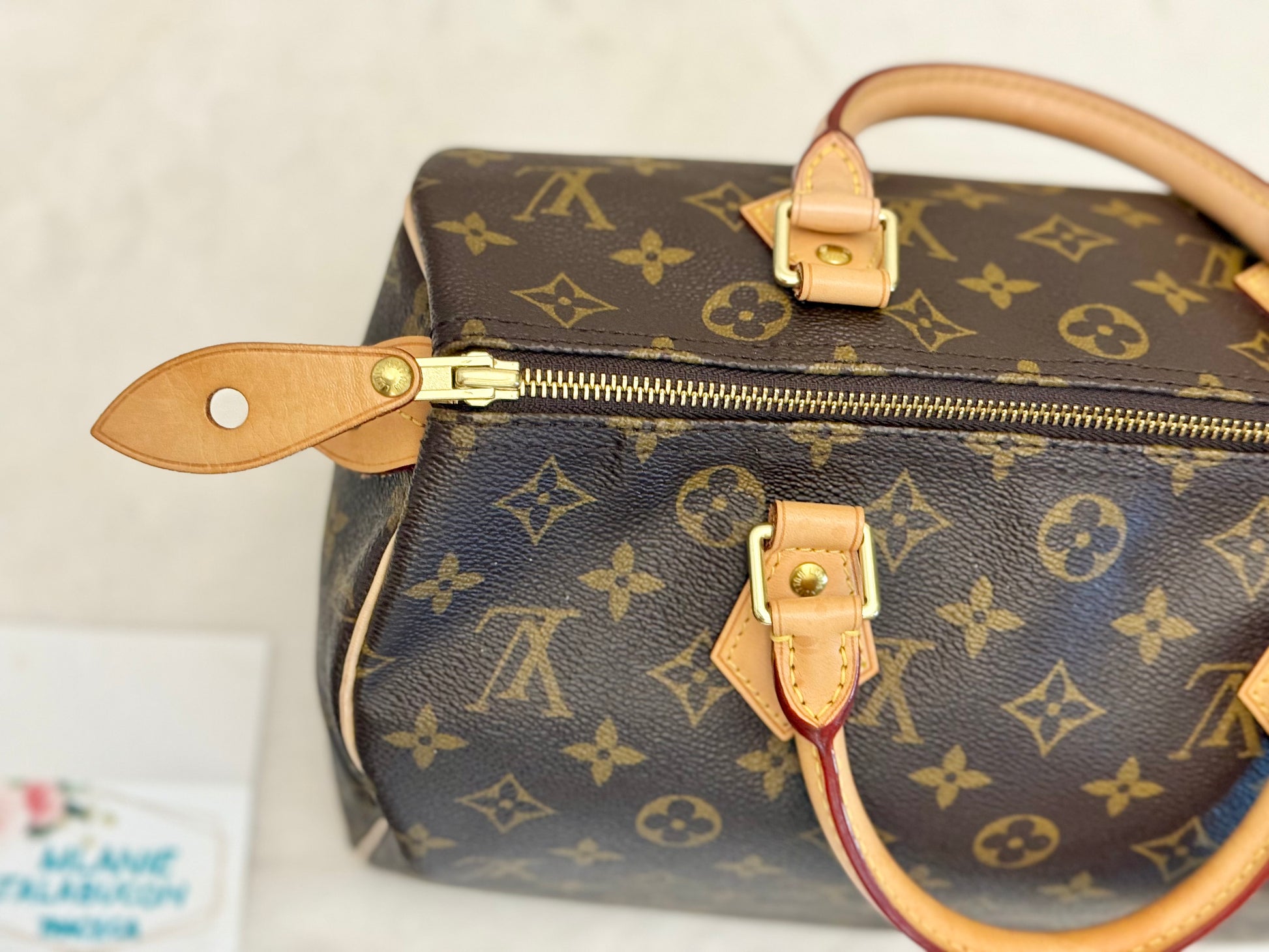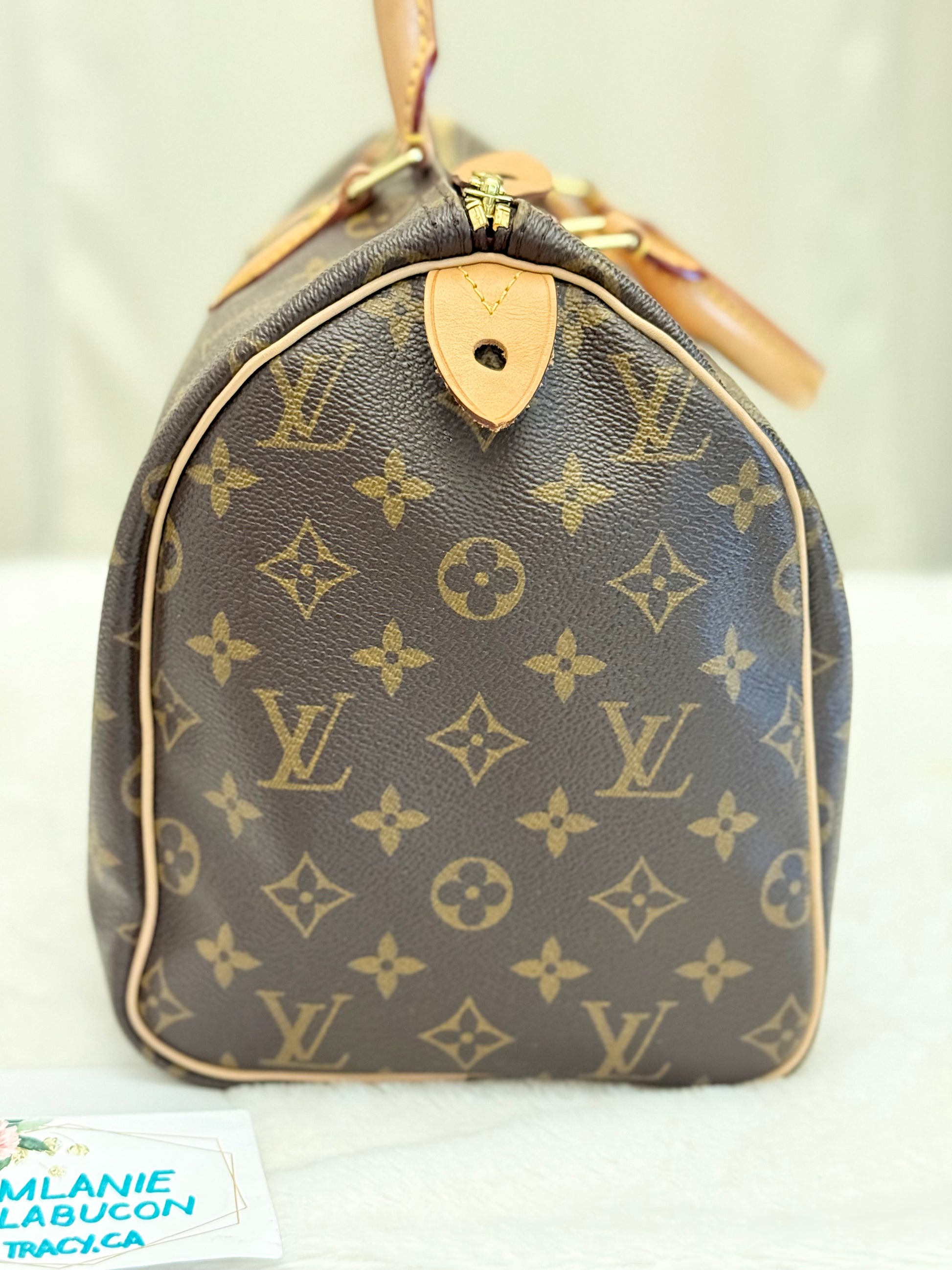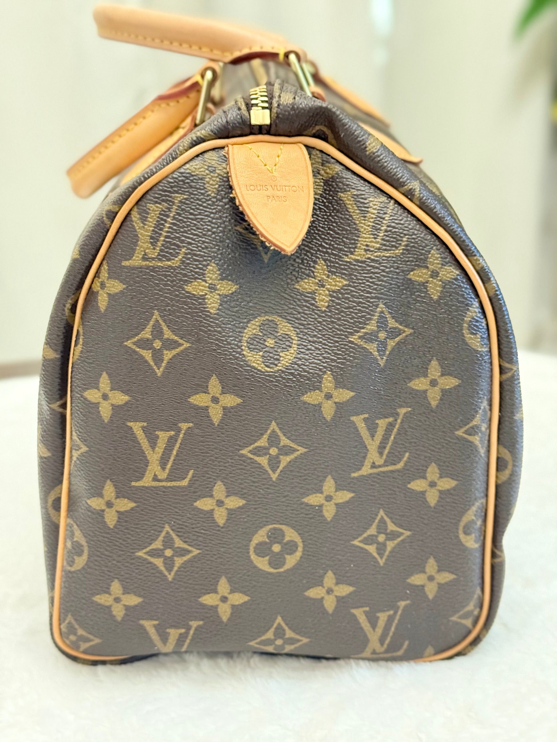 In EXCELLENT CONDITION! Clean inside and out! Canvas is bright and clean and no cracks. Hardware is golden, zipper runs smooth. Vachetta has patina, one handle has more than the other. Interior is clean. No offensive odors, comes from smoke and pet free home. It will shipped folded.