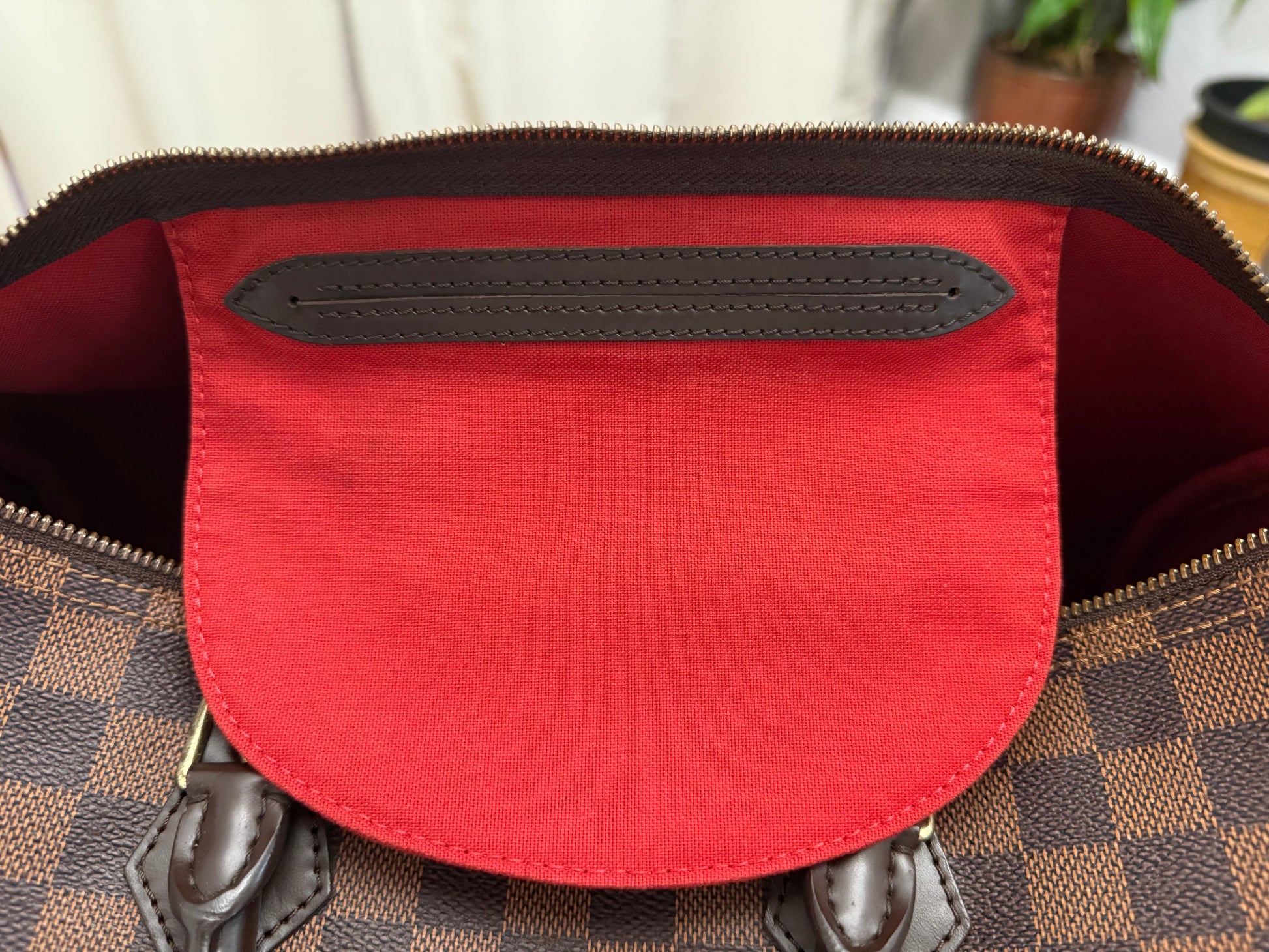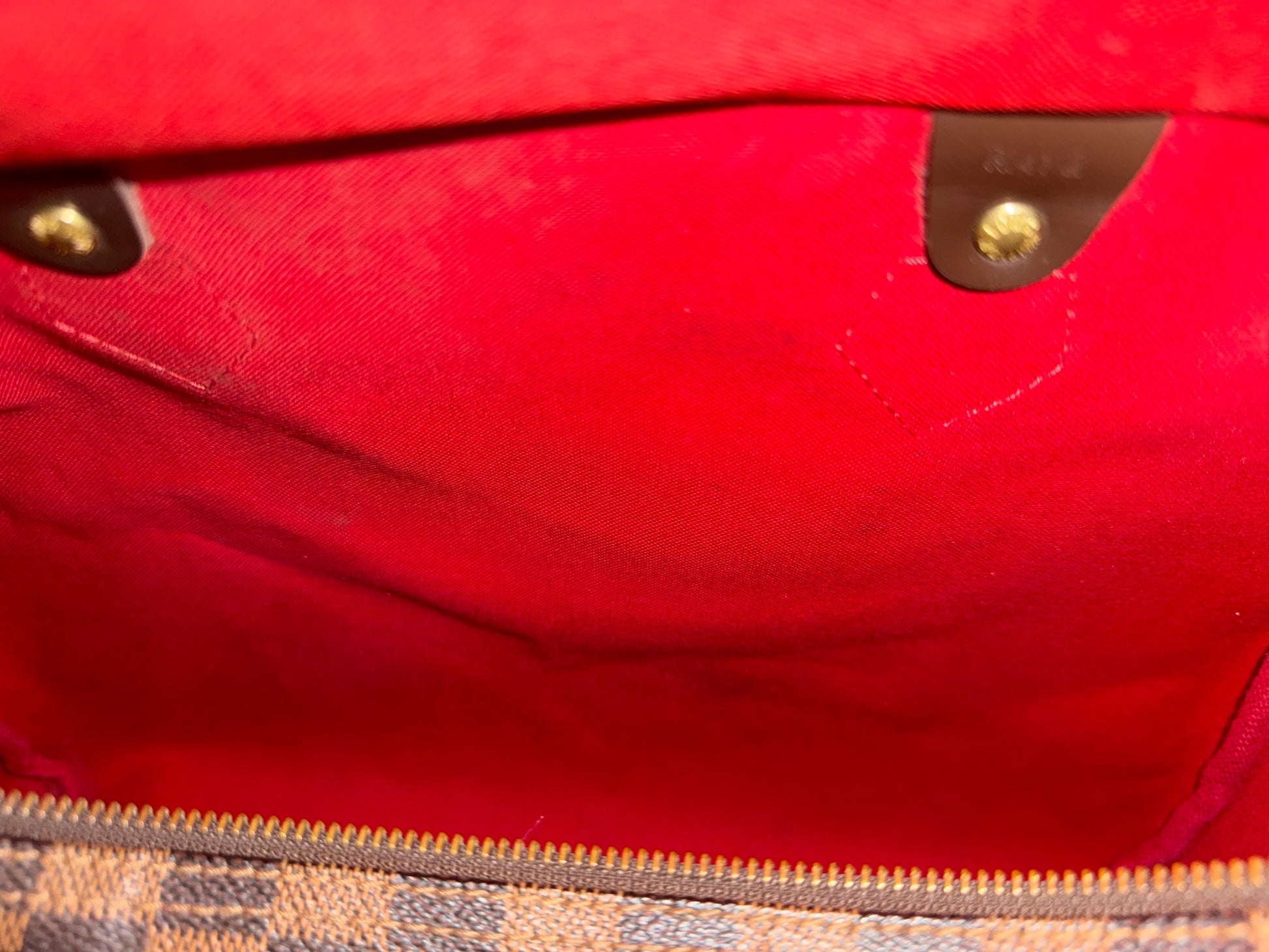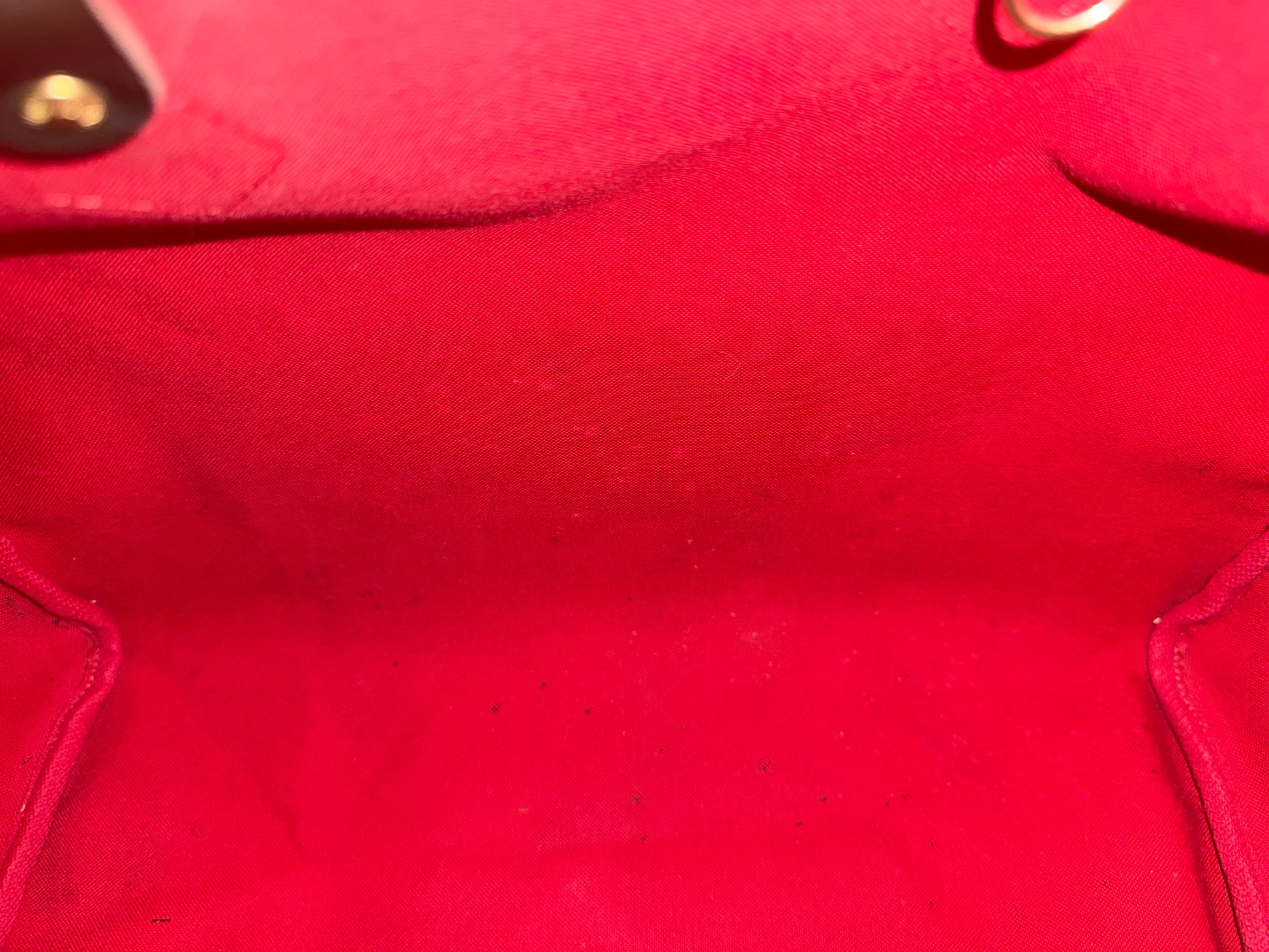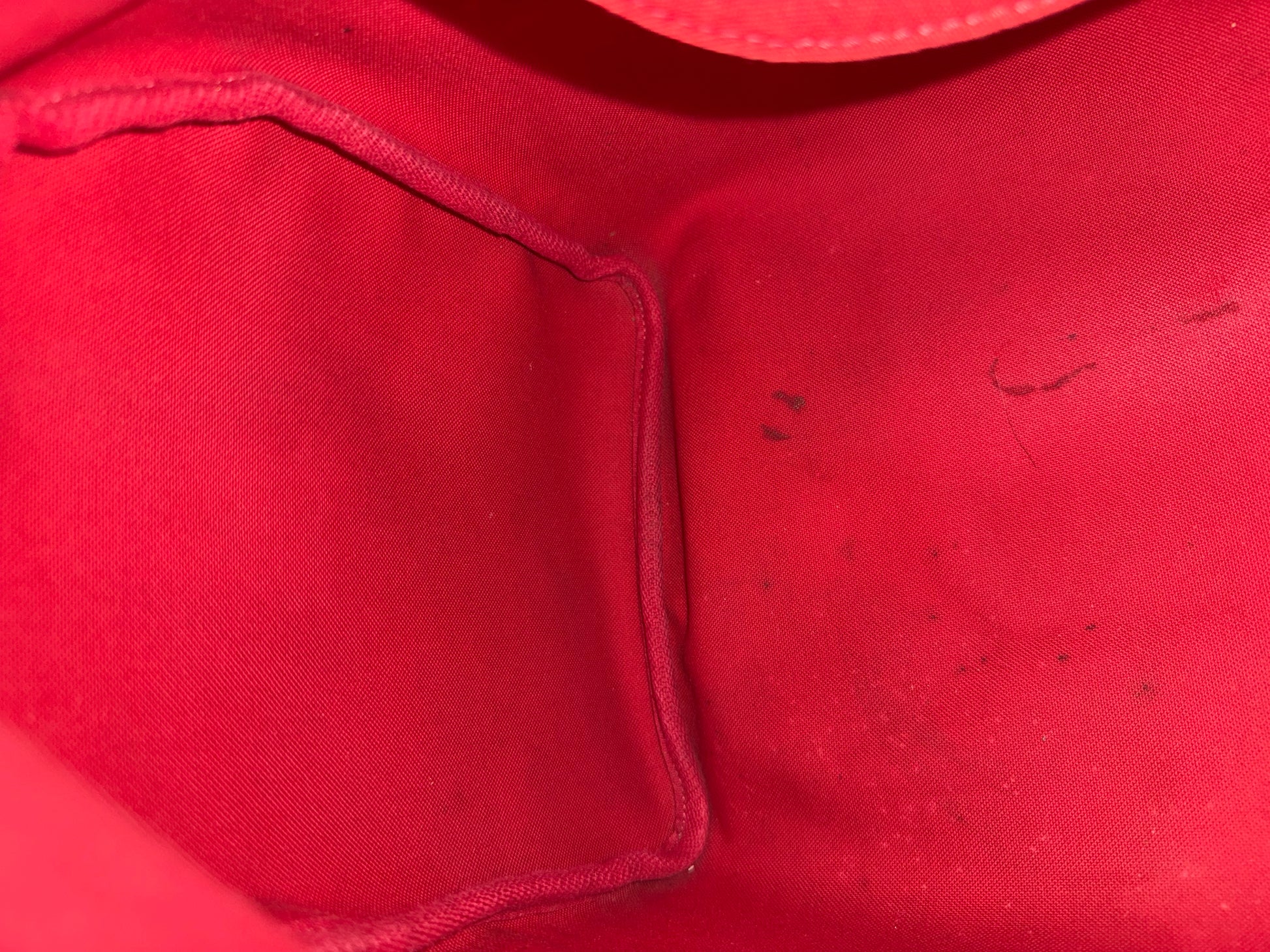The bag is still in excellent condition! Canvas is bright and clean with no cracks. Minor rubbing in canvas on the edges. No exposed piping. Leather in the bag and strap are in great condition, still shiny. Interior has marks, including organizer. No stickiness in the interior pocket. Hardware has tarnish. No offensive odors, comes from pet and smoke free home.