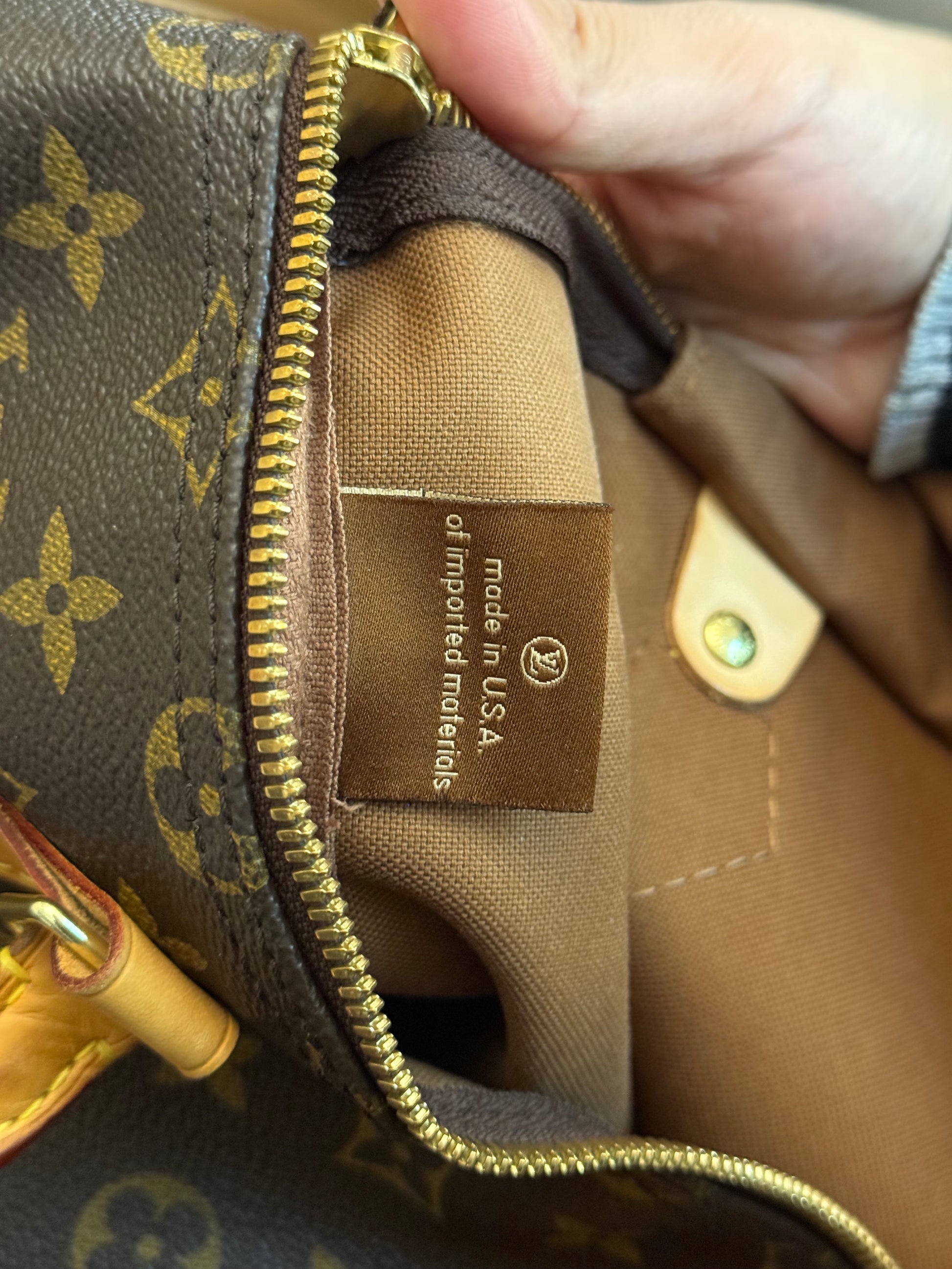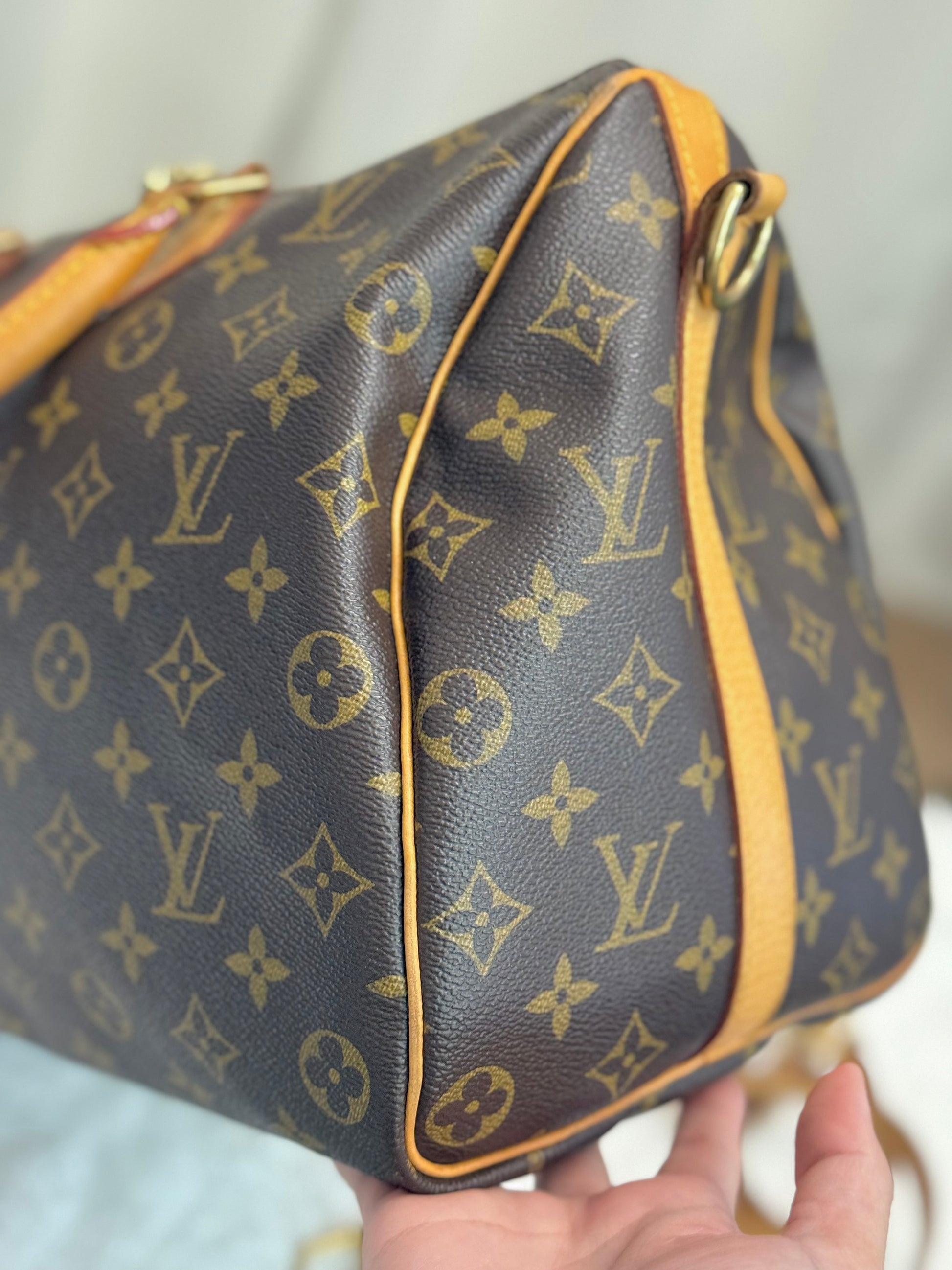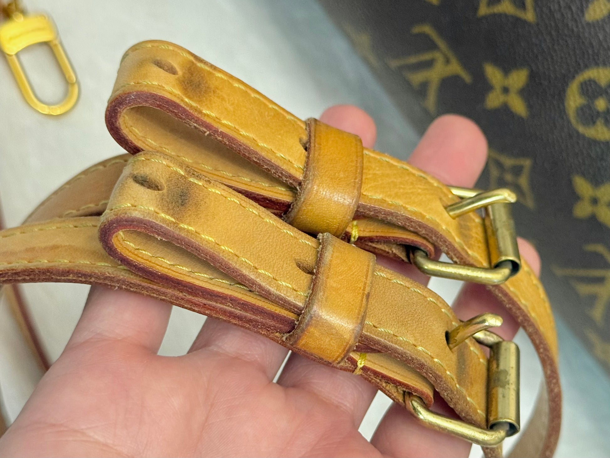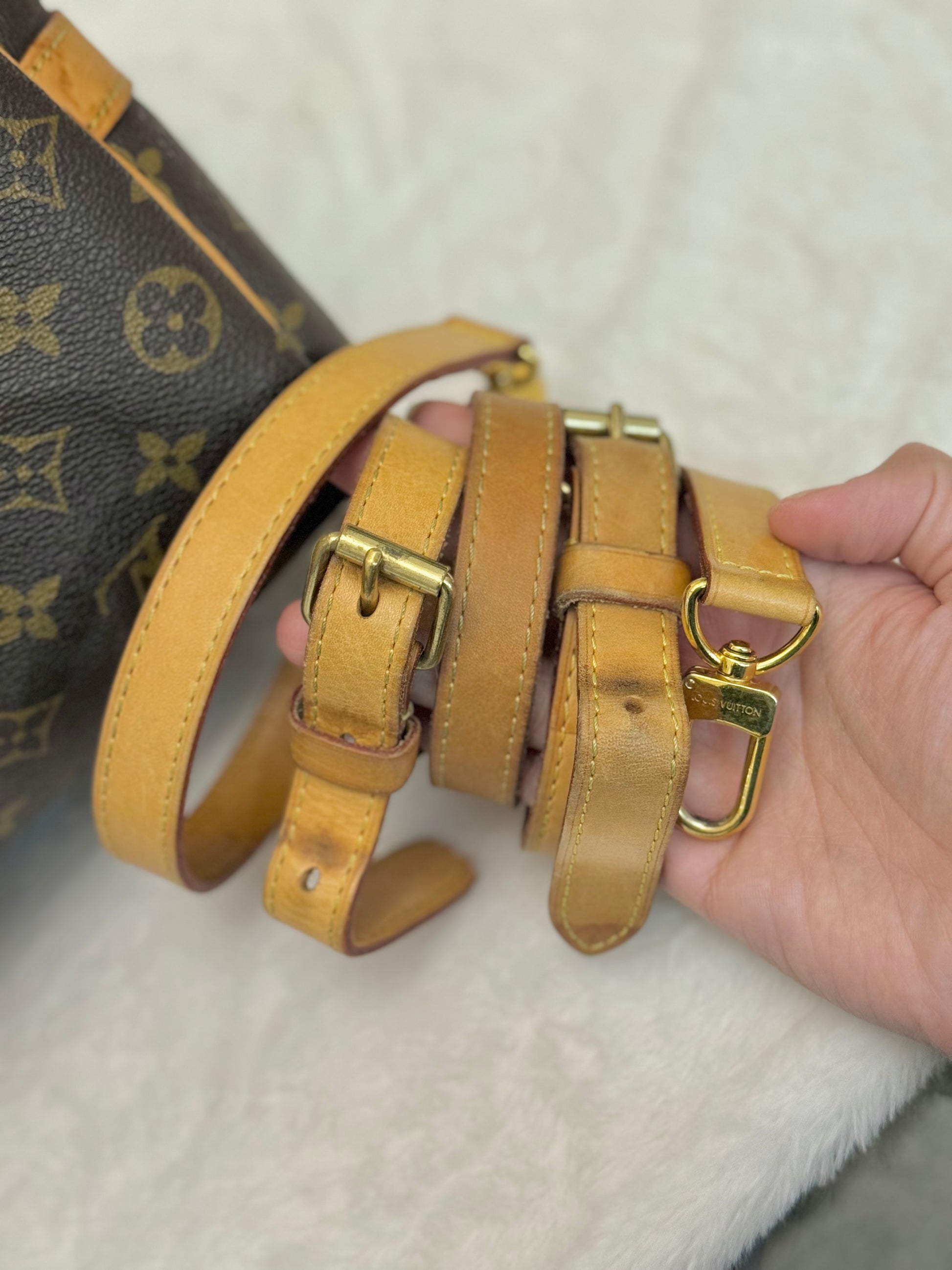 The bag is in VERY GOOD preowned condition! Canvas is bright and clean. Vachetta has light patina with marks. Uneven patina is seen on handle straps and bandouliere strap. Interior has small marks but can still be considered clean. Interior pocket is clean as well. Hardware is still golden. Glazing and piping are both in great condition.No offensive odors, comes from smoke and pet free home.