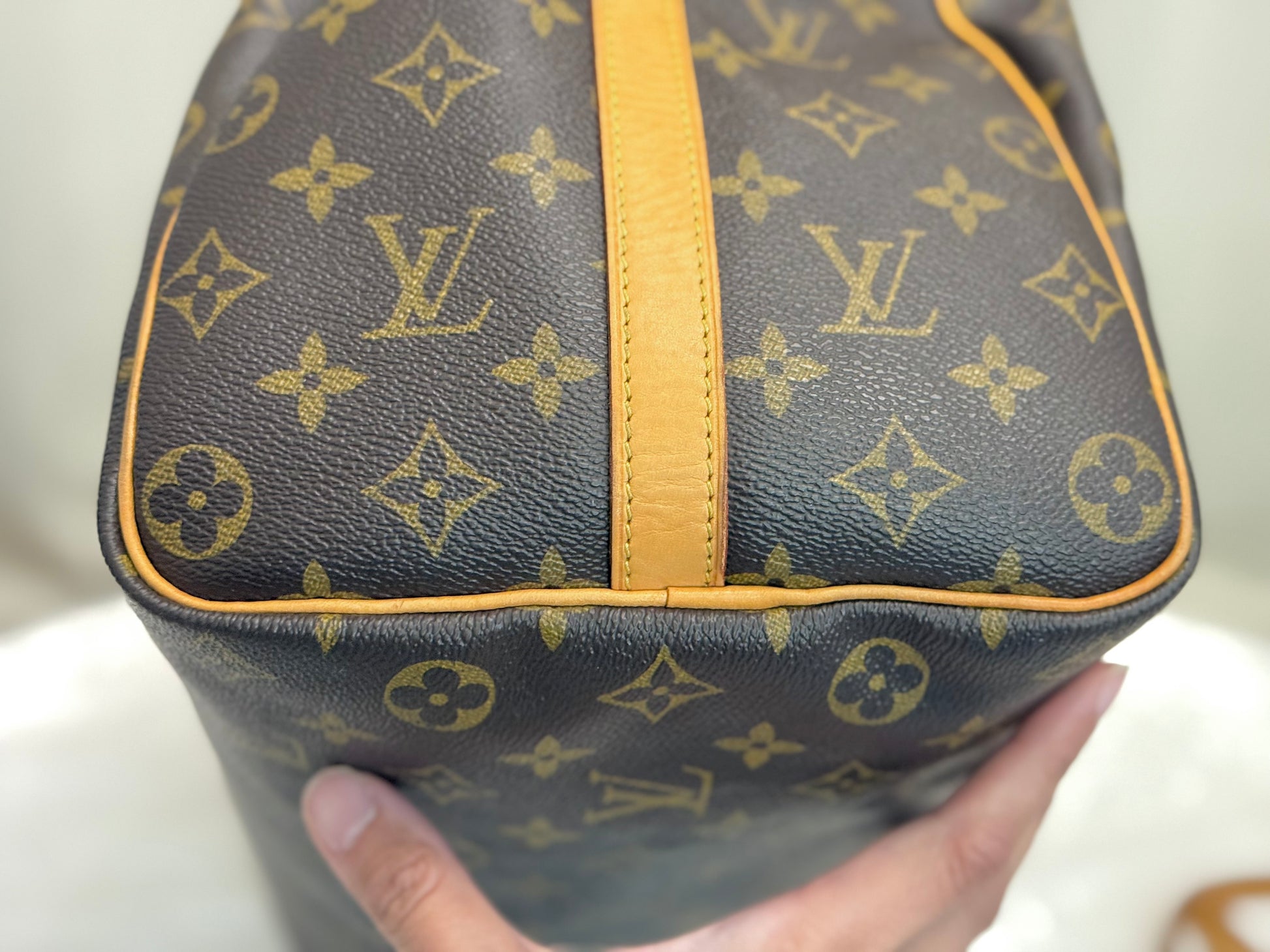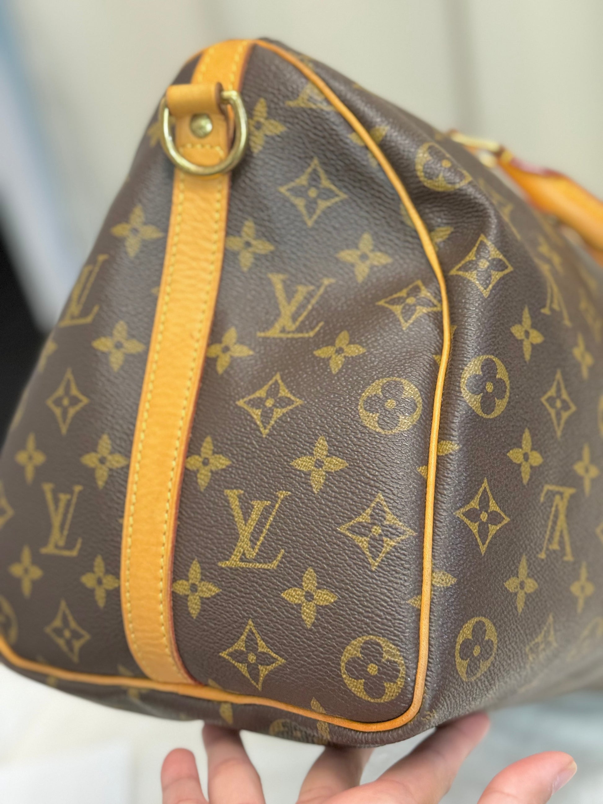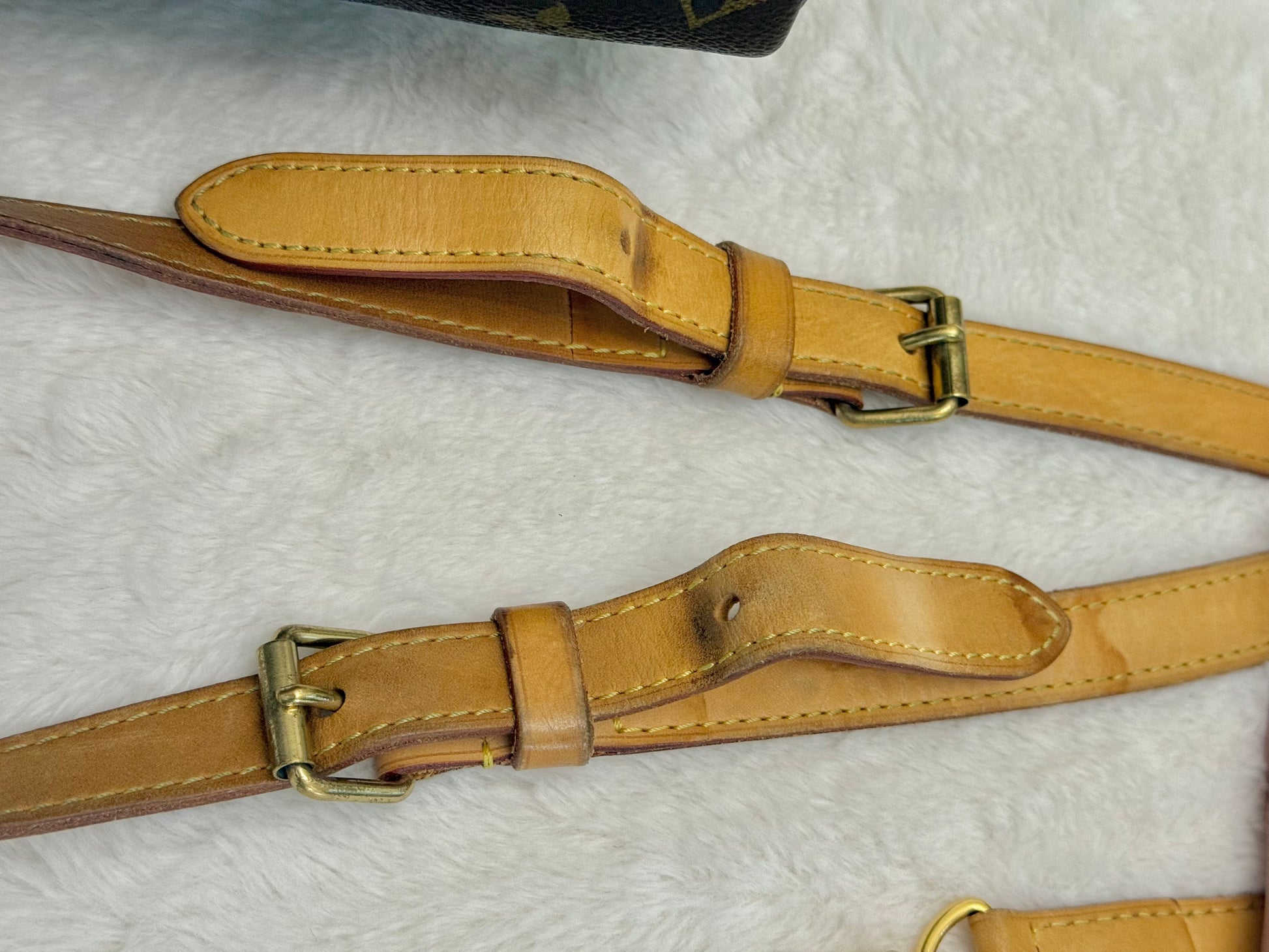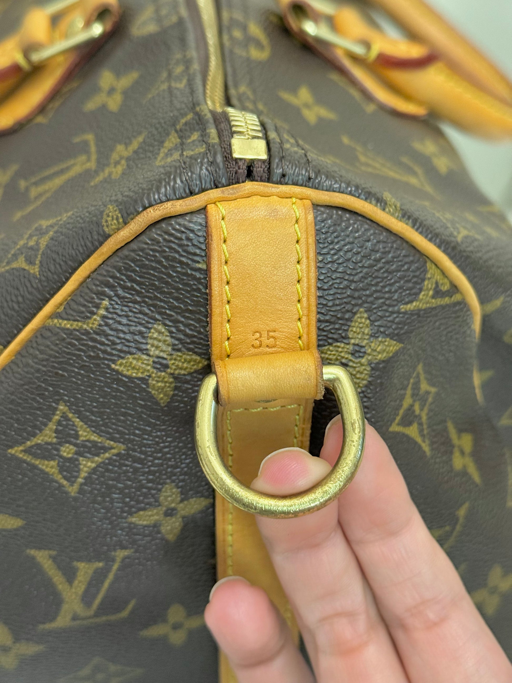 The bag is in VERY GOOD preowned condition! Canvas is bright and clean. Vachetta has light patina with marks. Uneven patina is seen on handle straps and bandouliere strap. Interior has small marks but can still be considered clean. Interior pocket is clean as well. Hardware is still golden. Glazing and piping are both in great condition.No offensive odors, comes from smoke and pet free home.