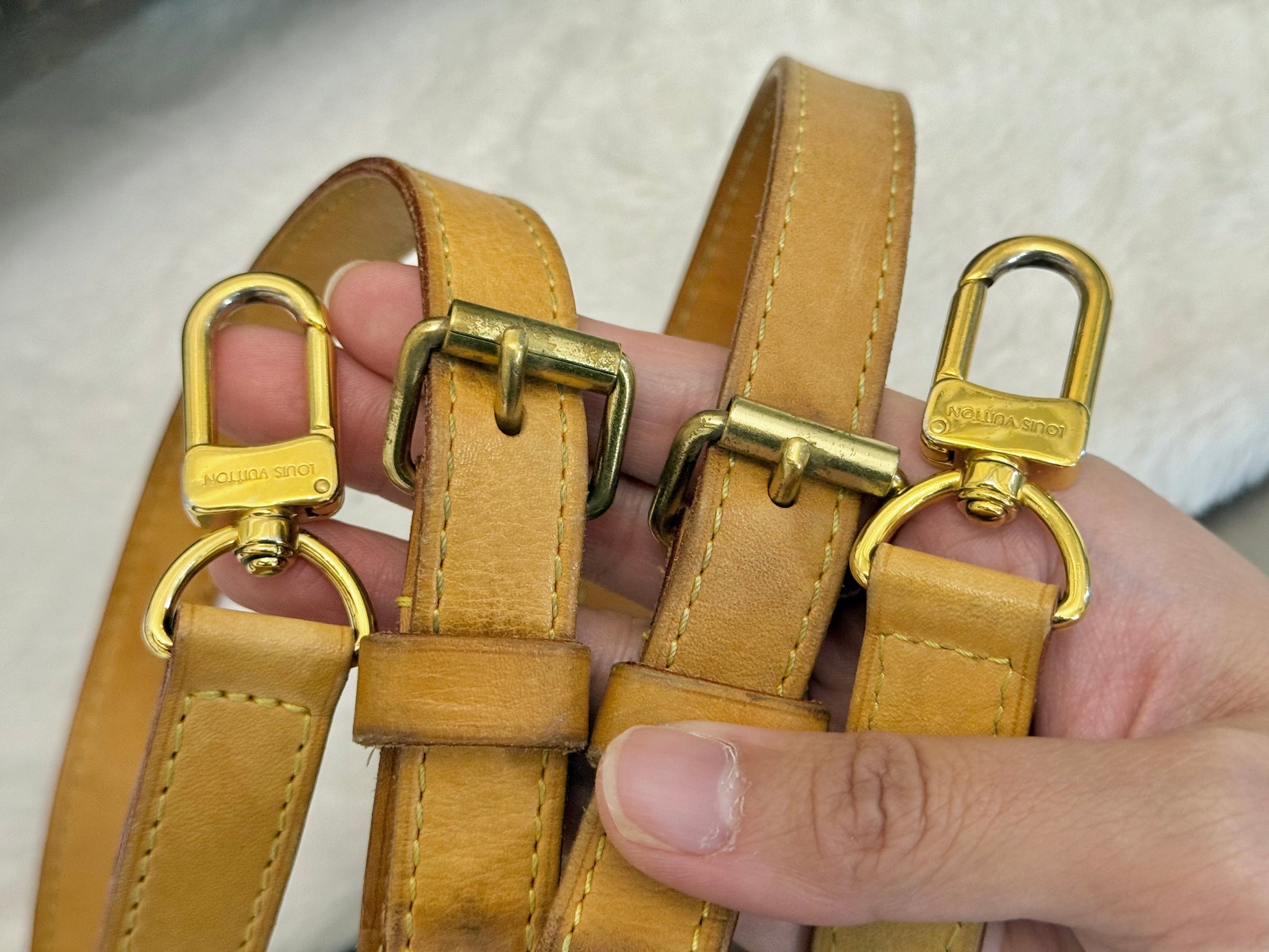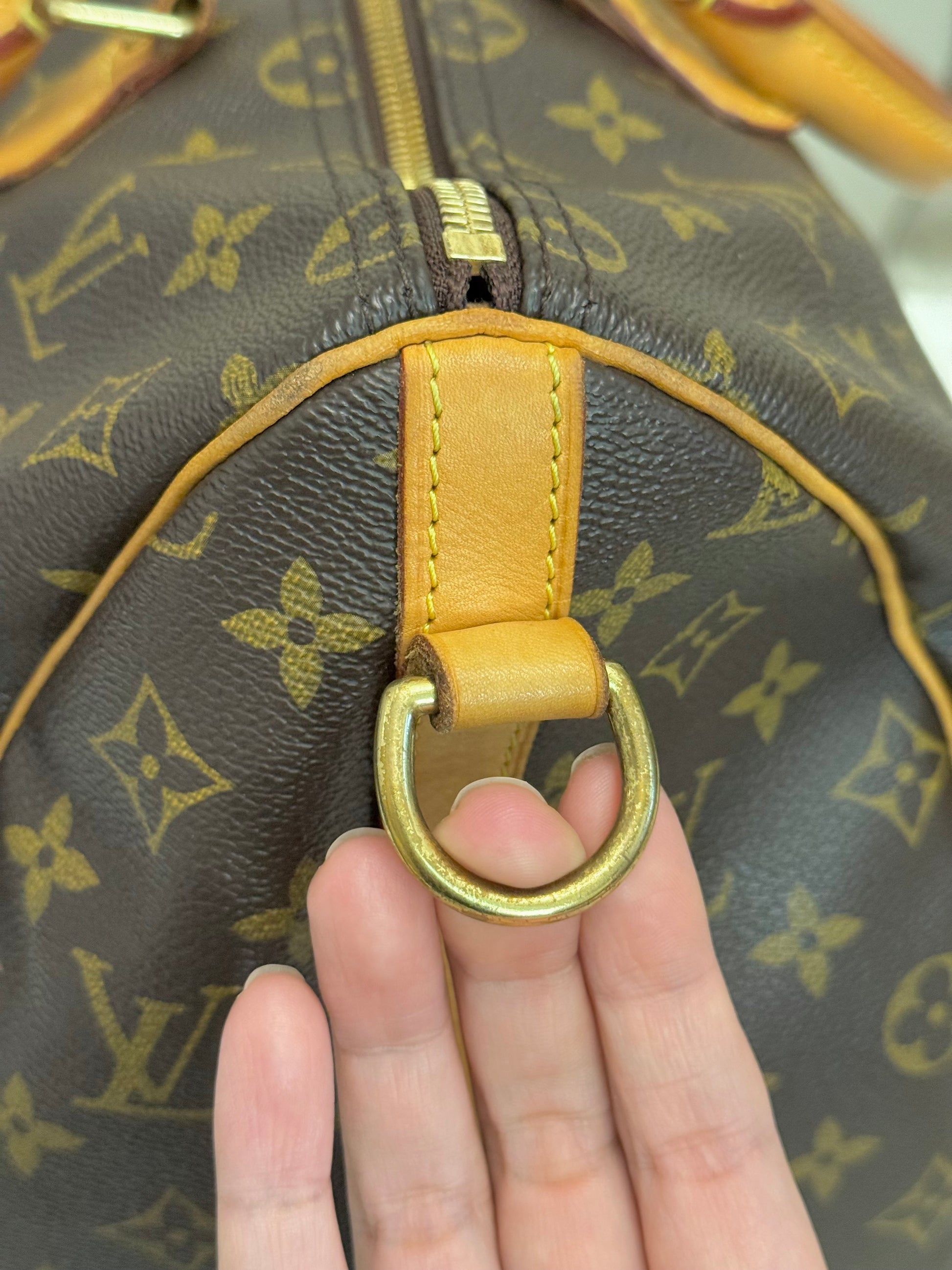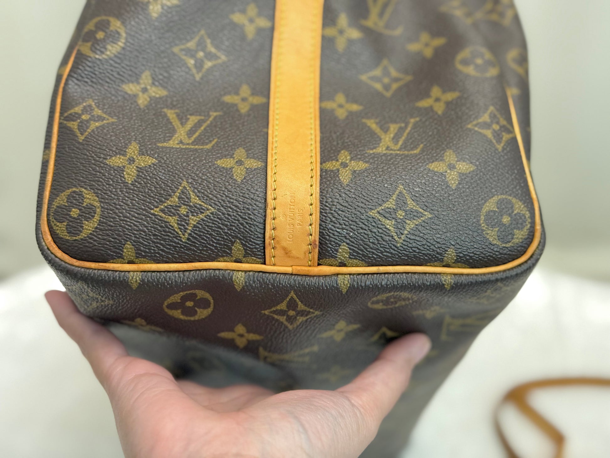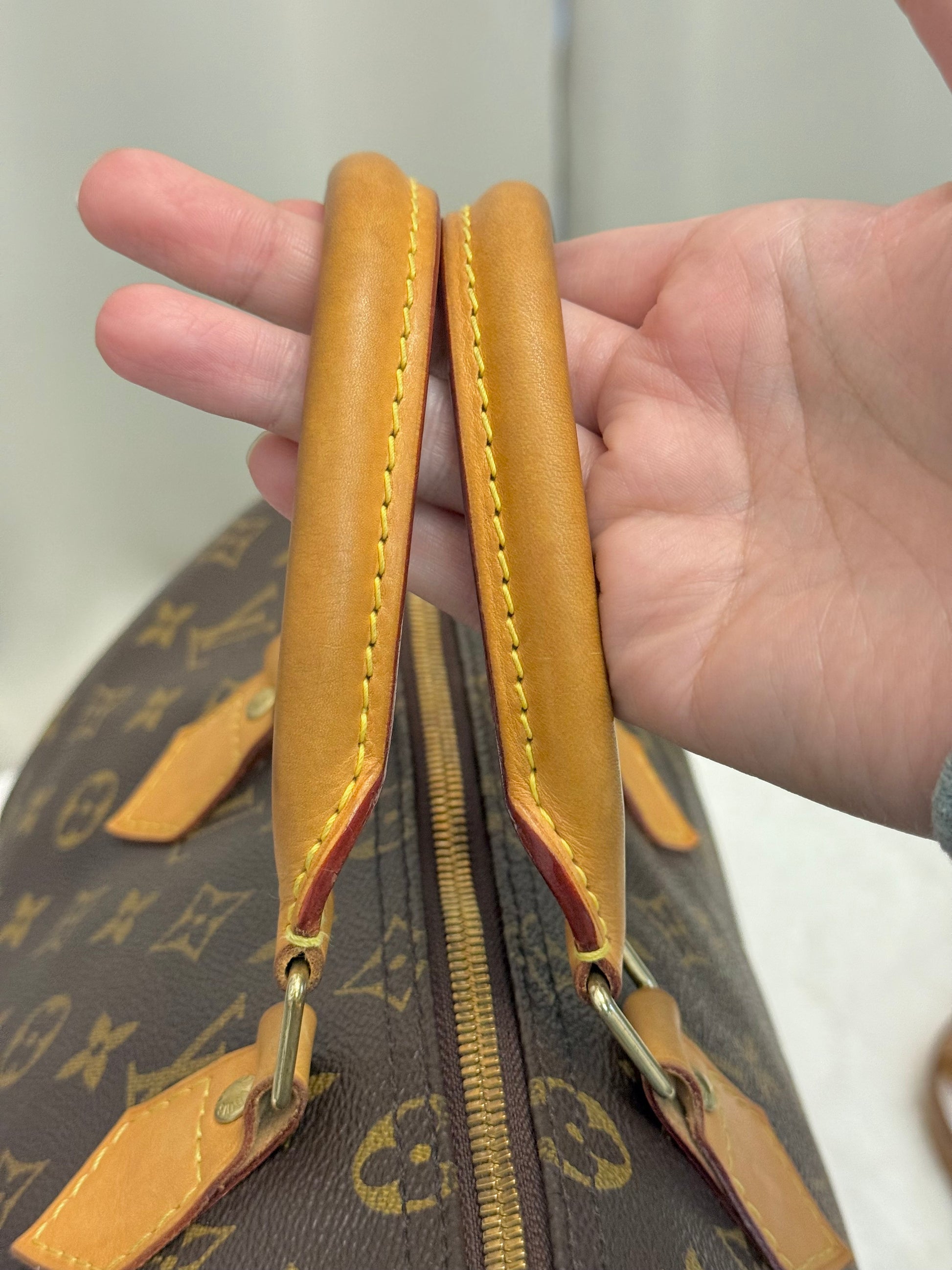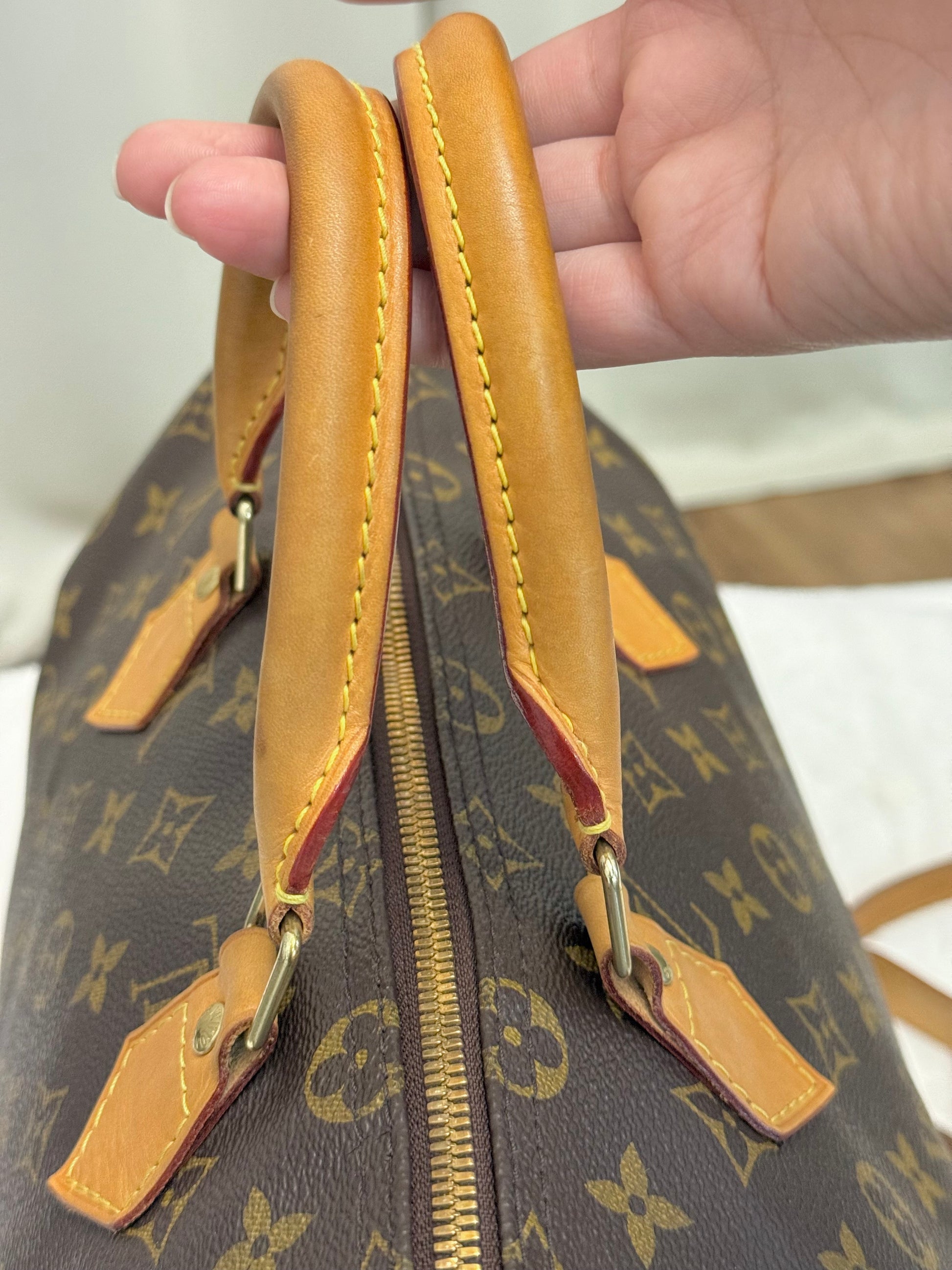 The bag is in VERY GOOD preowned condition! Canvas is bright and clean. Vachetta has light patina with marks. Uneven patina is seen on handle straps and bandouliere strap. Interior has small marks but can still be considered clean. Interior pocket is clean as well. Hardware is still golden. Glazing and piping are both in great condition.No offensive odors, comes from smoke and pet free home.