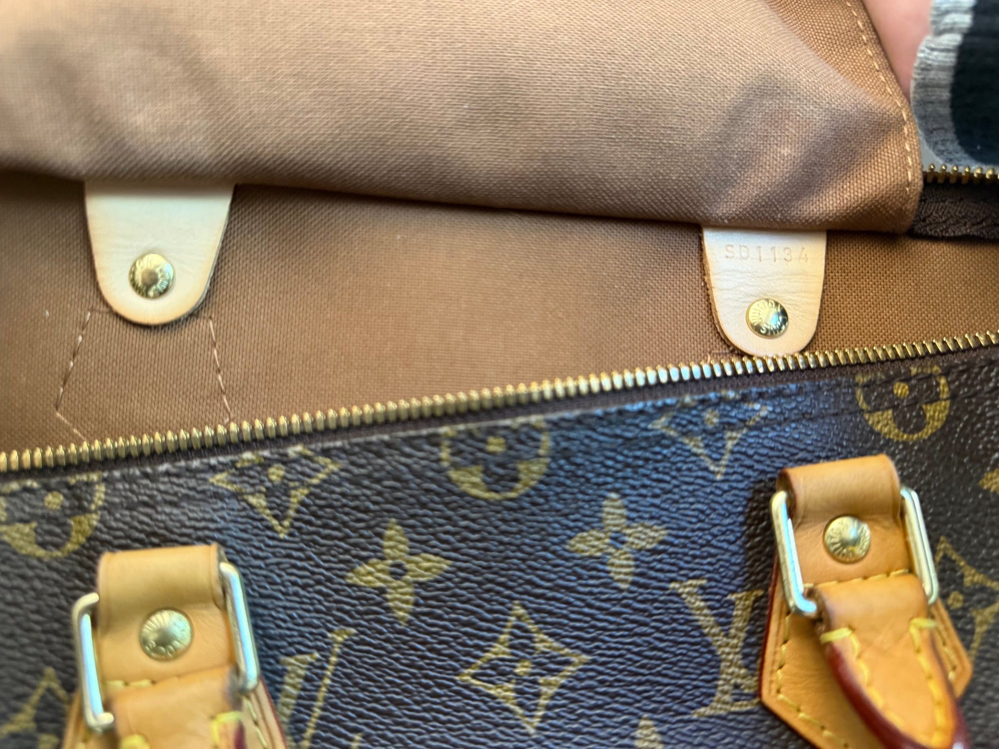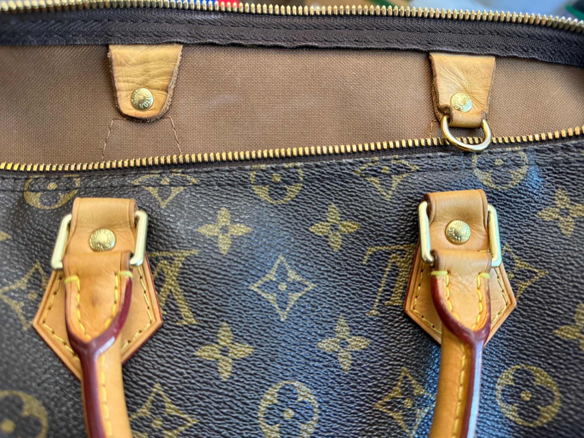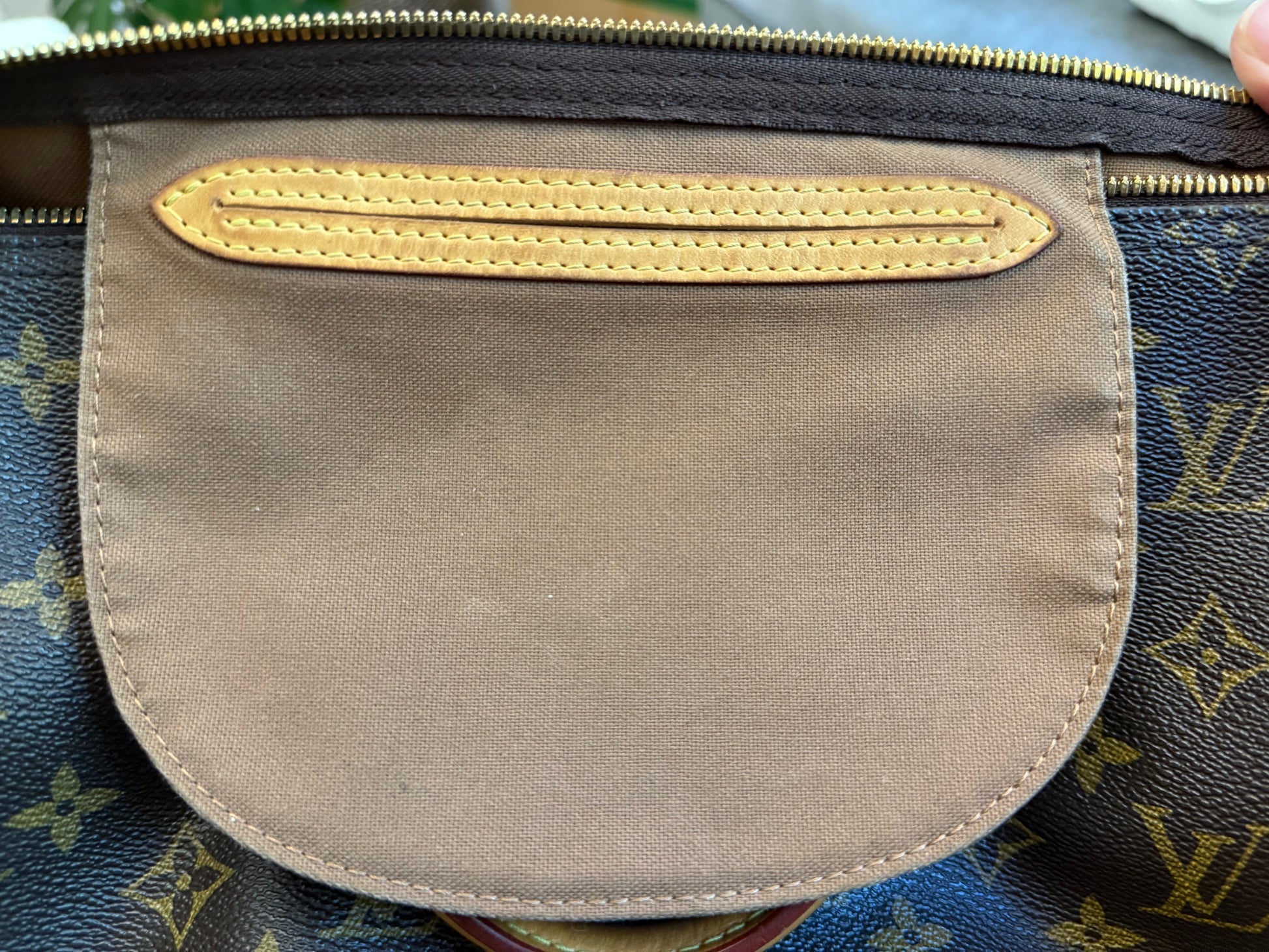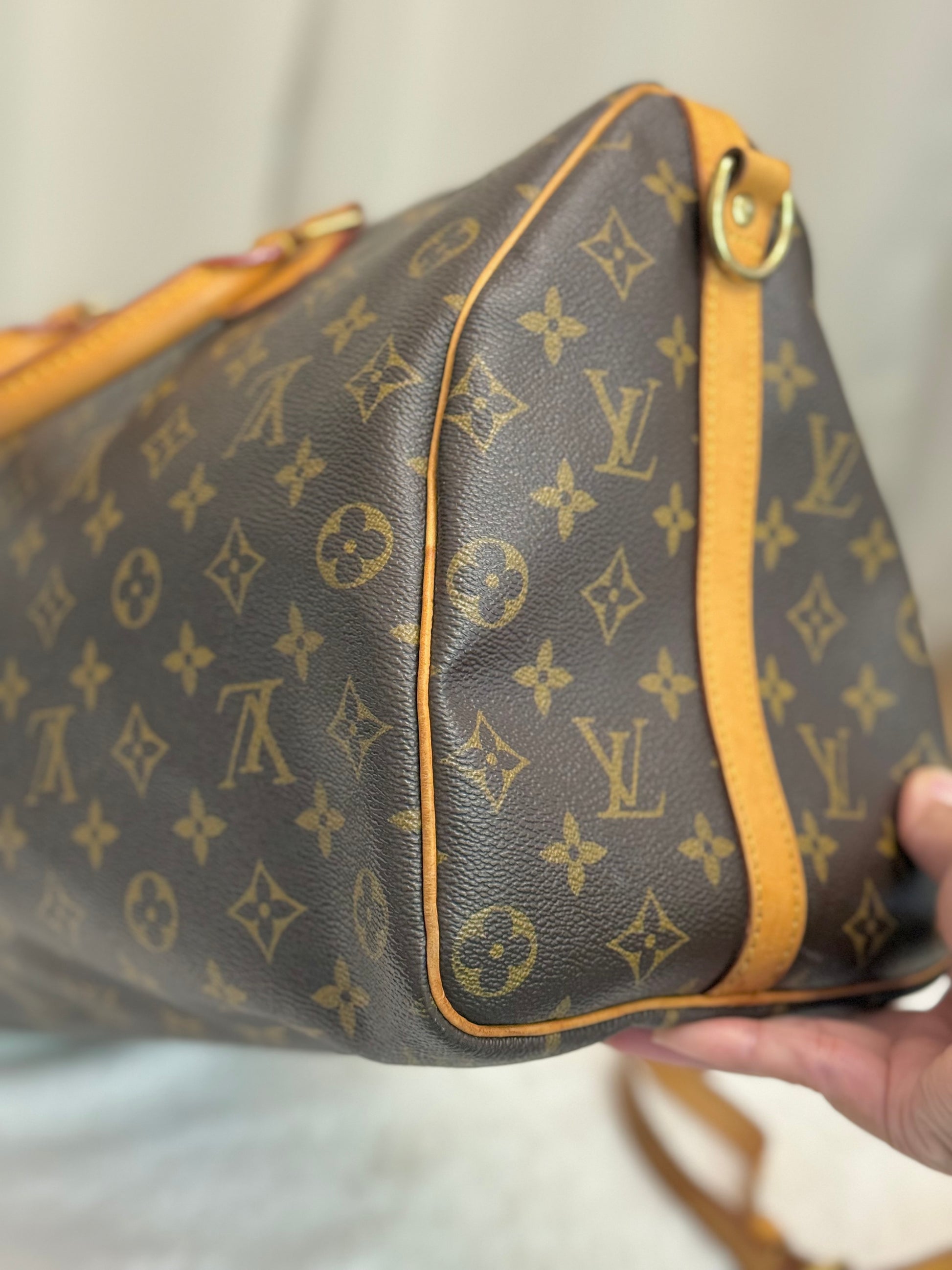 The bag is in VERY GOOD preowned condition! Canvas is bright and clean. Vachetta has light patina with marks. Uneven patina is seen on handle straps and bandouliere strap. Interior has small marks but can still be considered clean. Interior pocket is clean as well. Hardware is still golden. Glazing and piping are both in great condition.No offensive odors, comes from smoke and pet free home.
