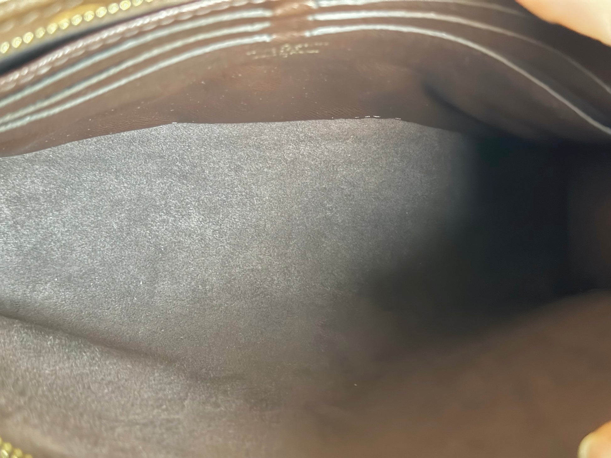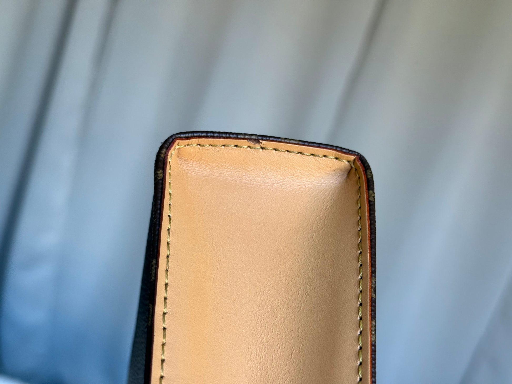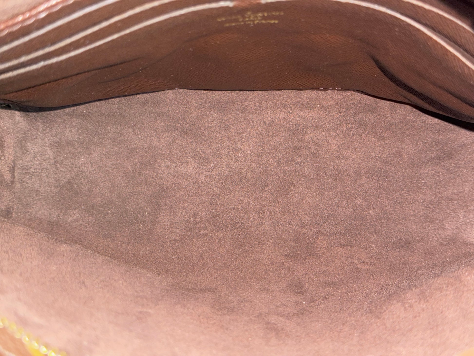 In EXCELLENT condition with signs of use. Canvas has no cracks. Treated vachetta sides re excellent with no major marks, just a small scrape on bottom, see pics. Interior is clean. Interior pocket is stretched but wont affect use. Hardware is golden. No offensive smell but has perfume smell: not strong but stating here if you are sensitive; comes from pet and smoke free home.