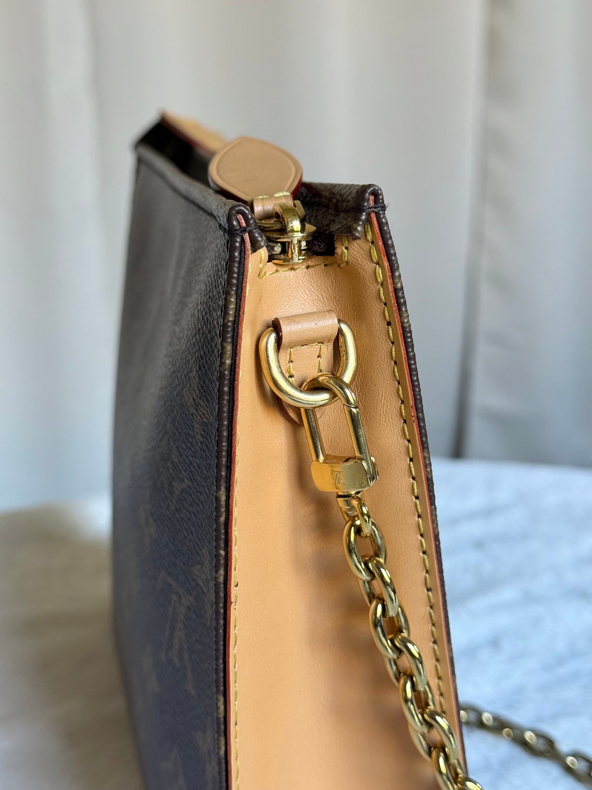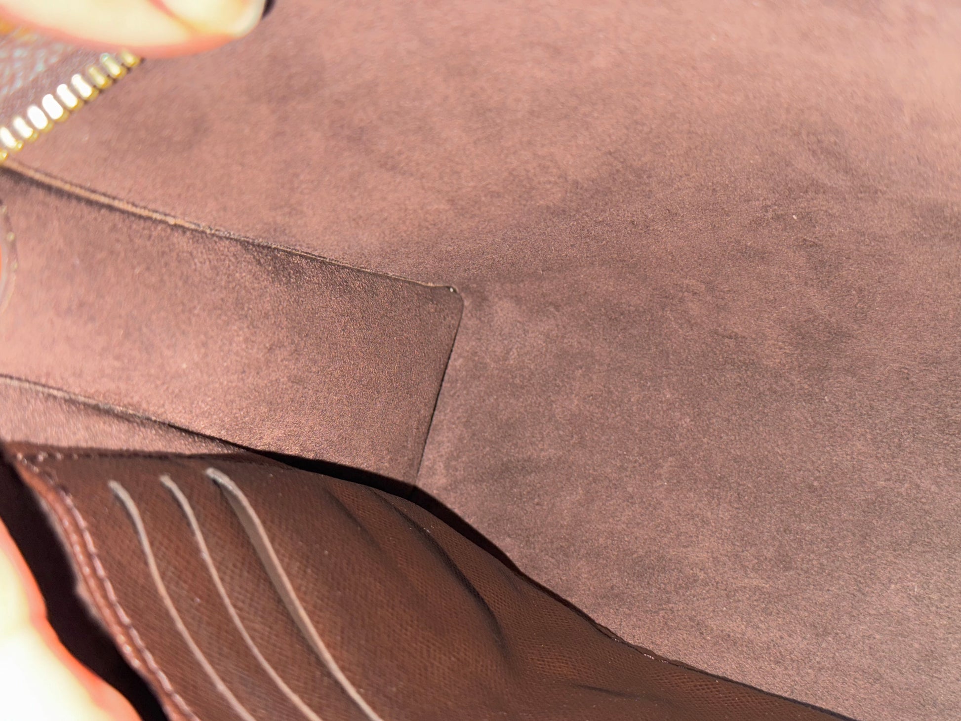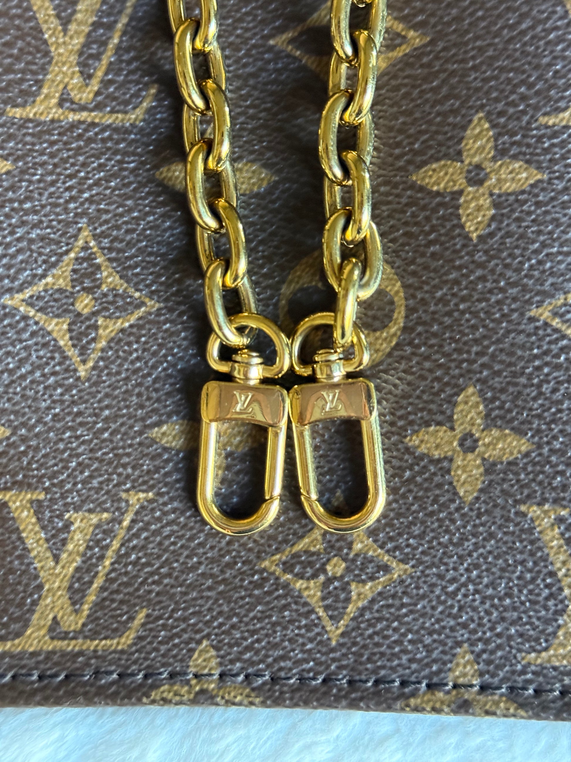 In EXCELLENT condition with signs of use. Canvas has no cracks. Treated vachetta sides re excellent with no major marks, just a small scrape on bottom, see pics. Interior is clean. Interior pocket is stretched but wont affect use. Hardware is golden. No offensive smell but has perfume smell: not strong but stating here if you are sensitive; comes from pet and smoke free home.