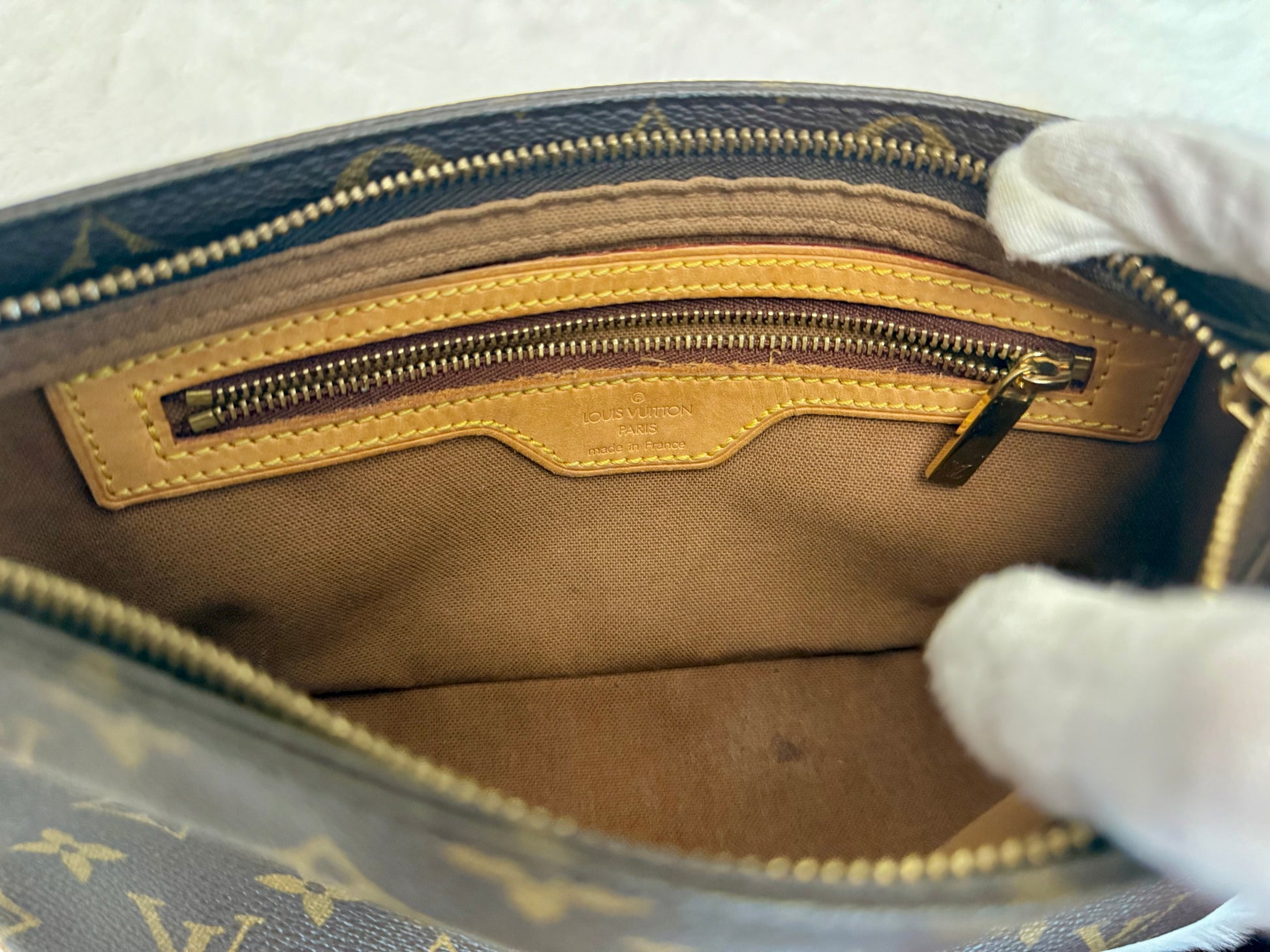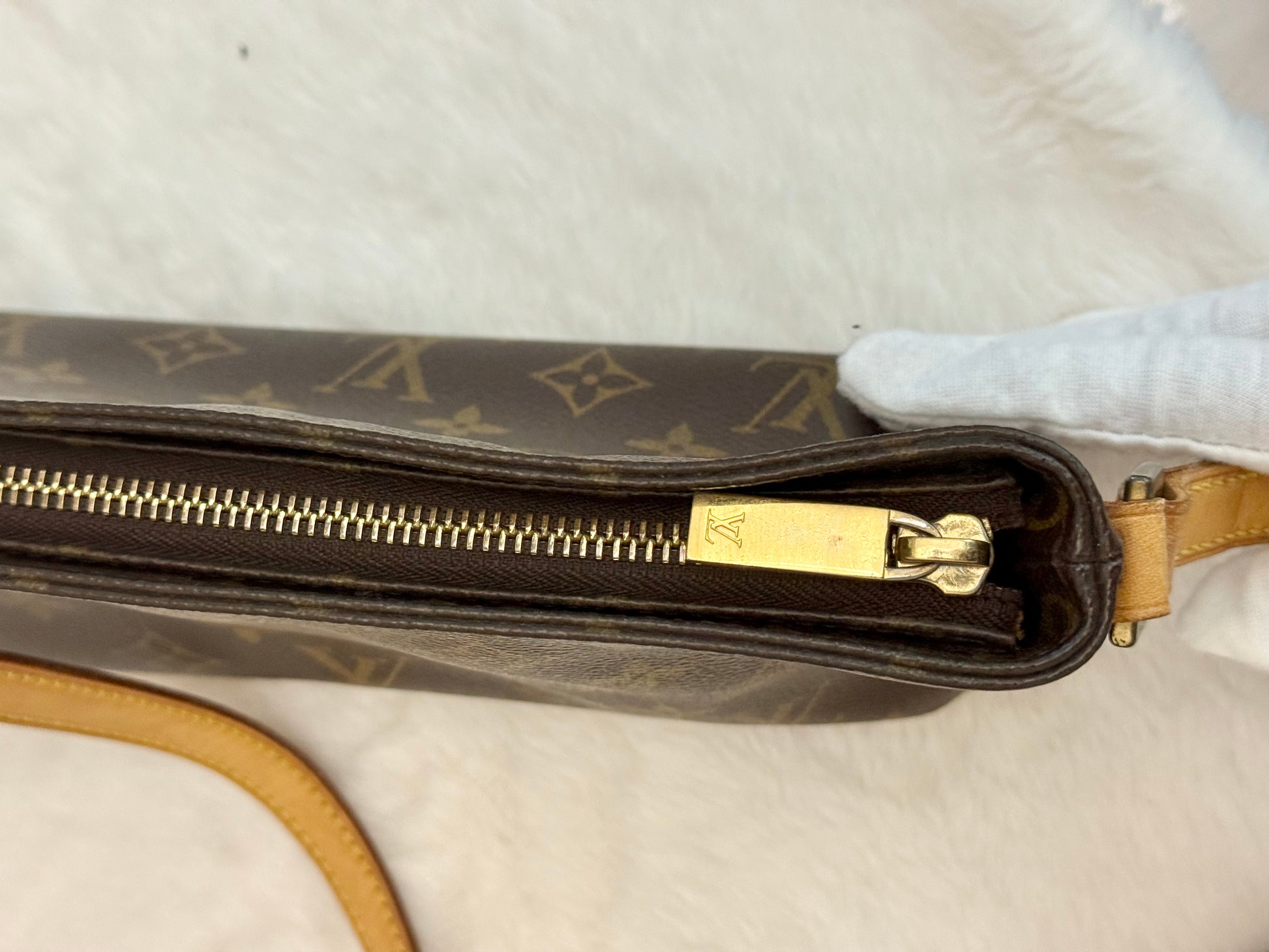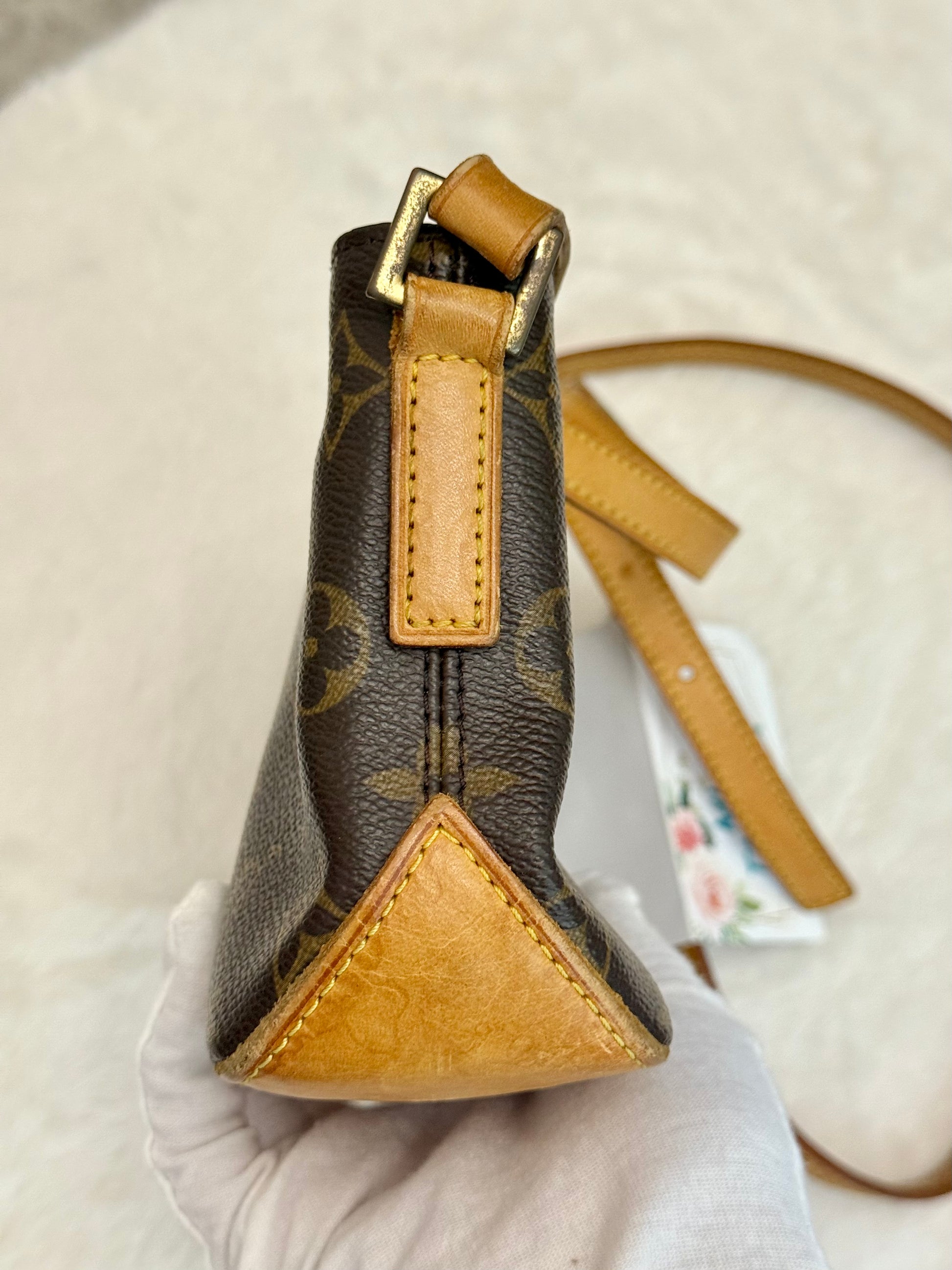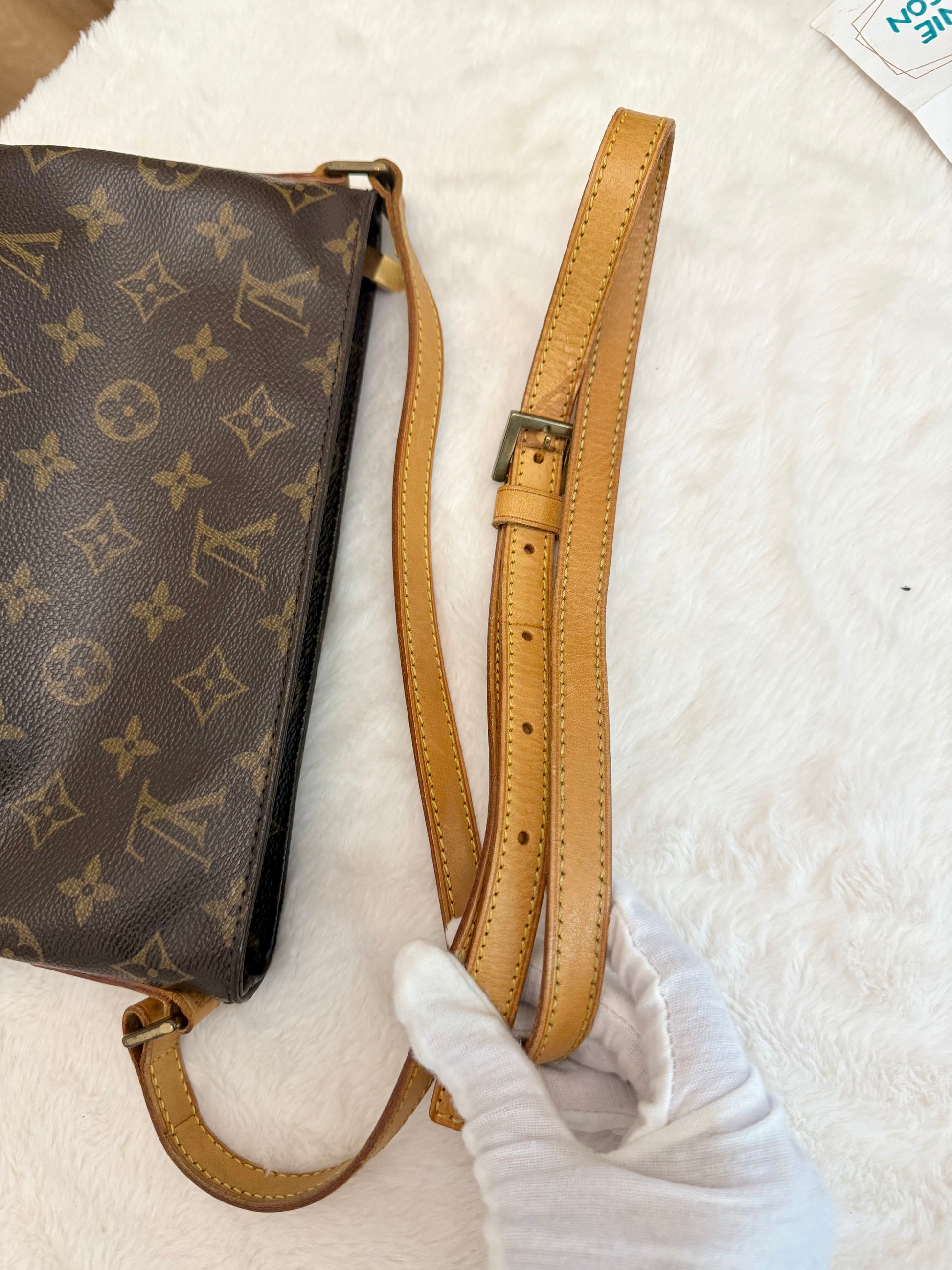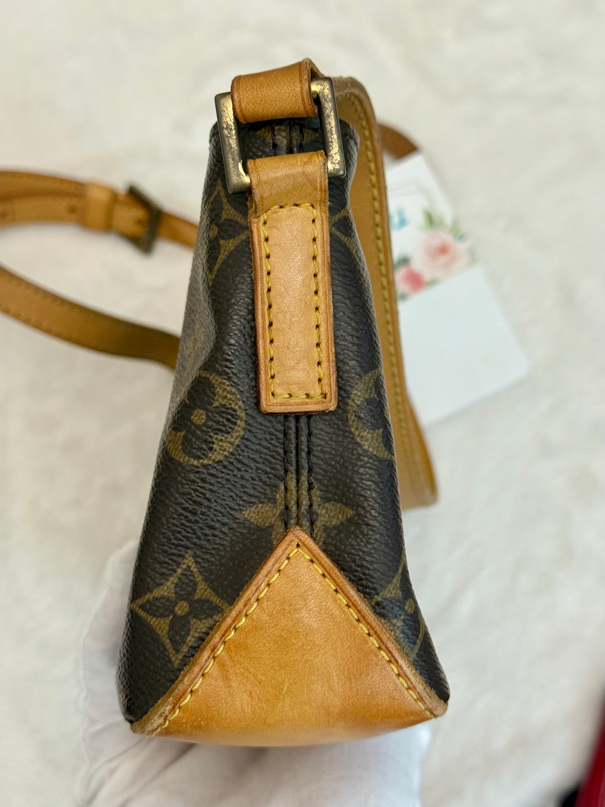 VERY GOOD preowned condition! Canvas is shiny and bright, no cracks on trims and corners. Vachetta has medium honey patina with marks vachetta, see pics. Vachetta strap is still strong on both sides, no signs of cracking. Hardware has fading and tarnish, pretty normal for vintage piece. Interior has marks. One missing strap keeper. No offensive smell, comes from pet and smoke free home.