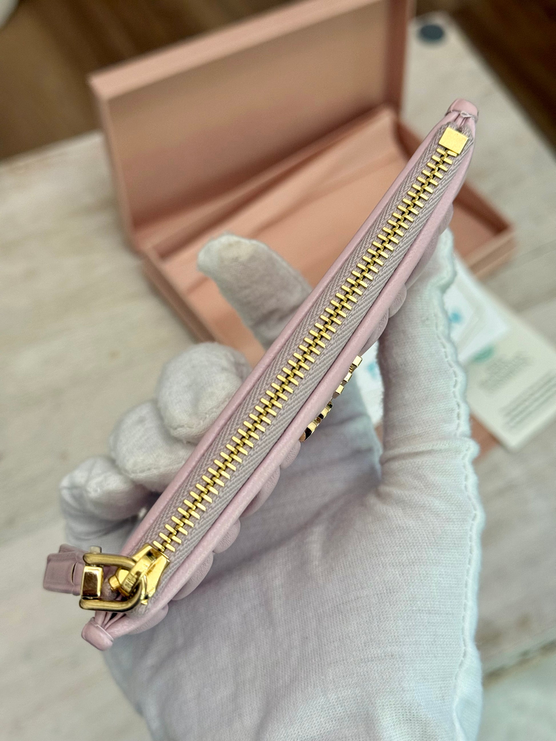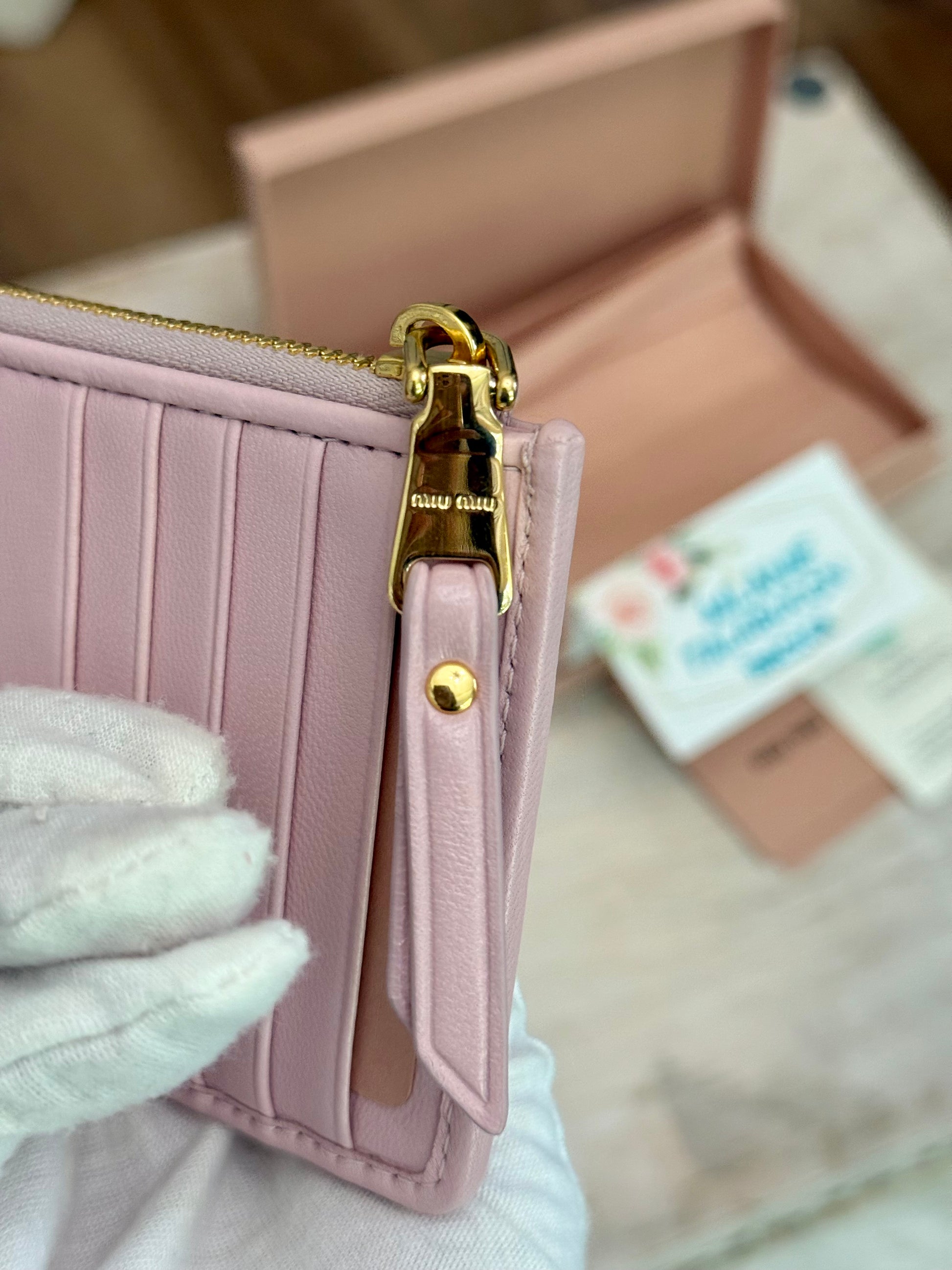 Compact wallet that can hold 5 credit cards and zipped compartment can hold cards and coins.