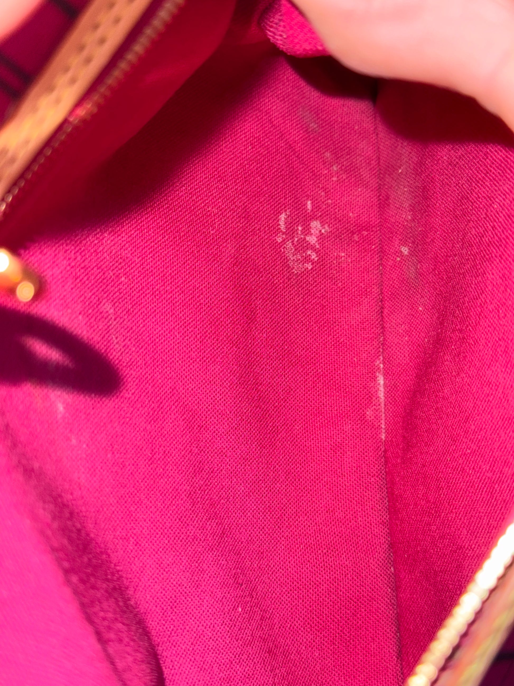 The bag is in EXCELLENT condition! Clean inside and out! Canvas has no flaws. Vachetta has light patina with faint water marks. Inside pocket has white marks, see pics. No offensive smell, comes from pet and smoke free home. No pouch.