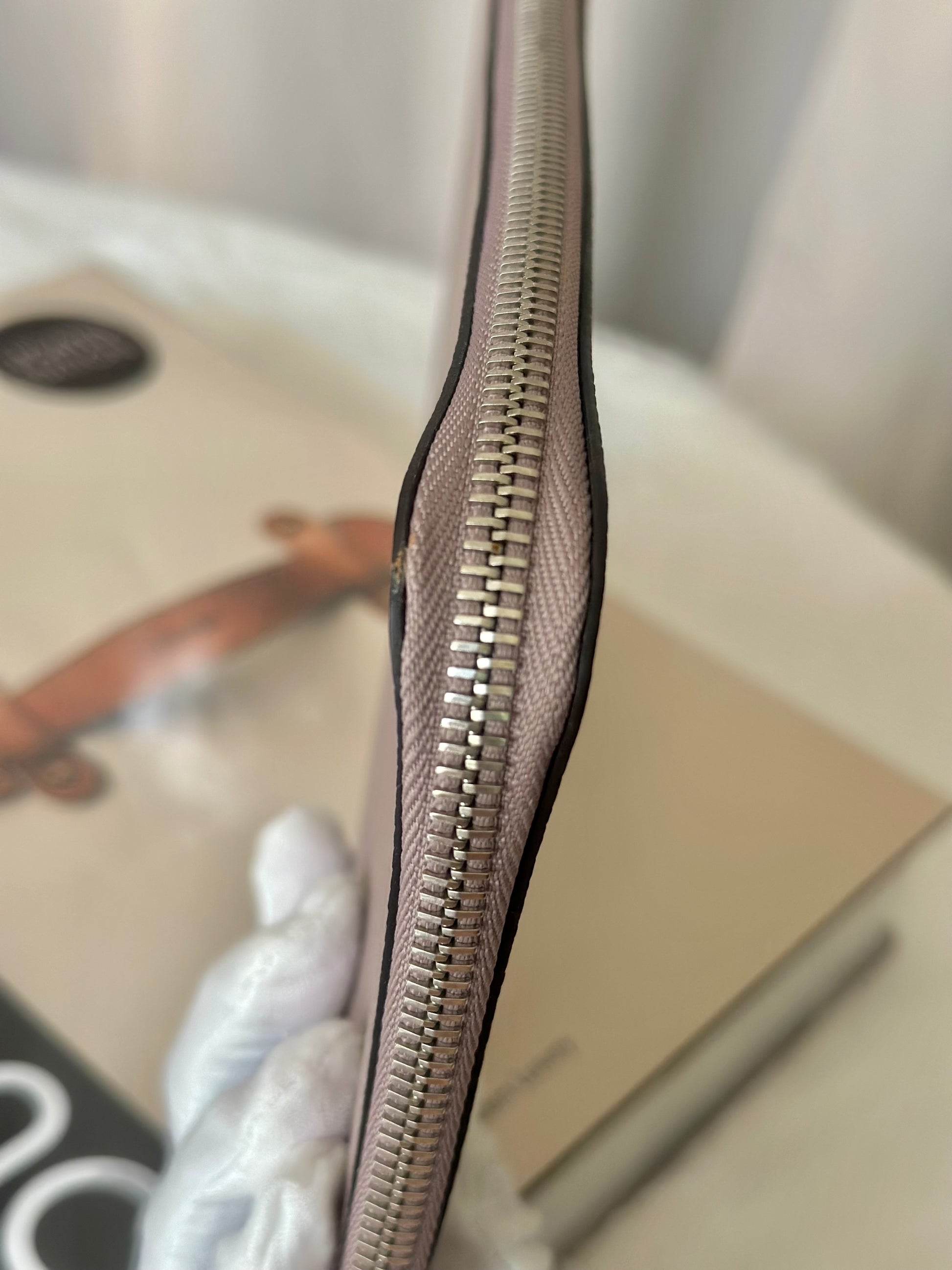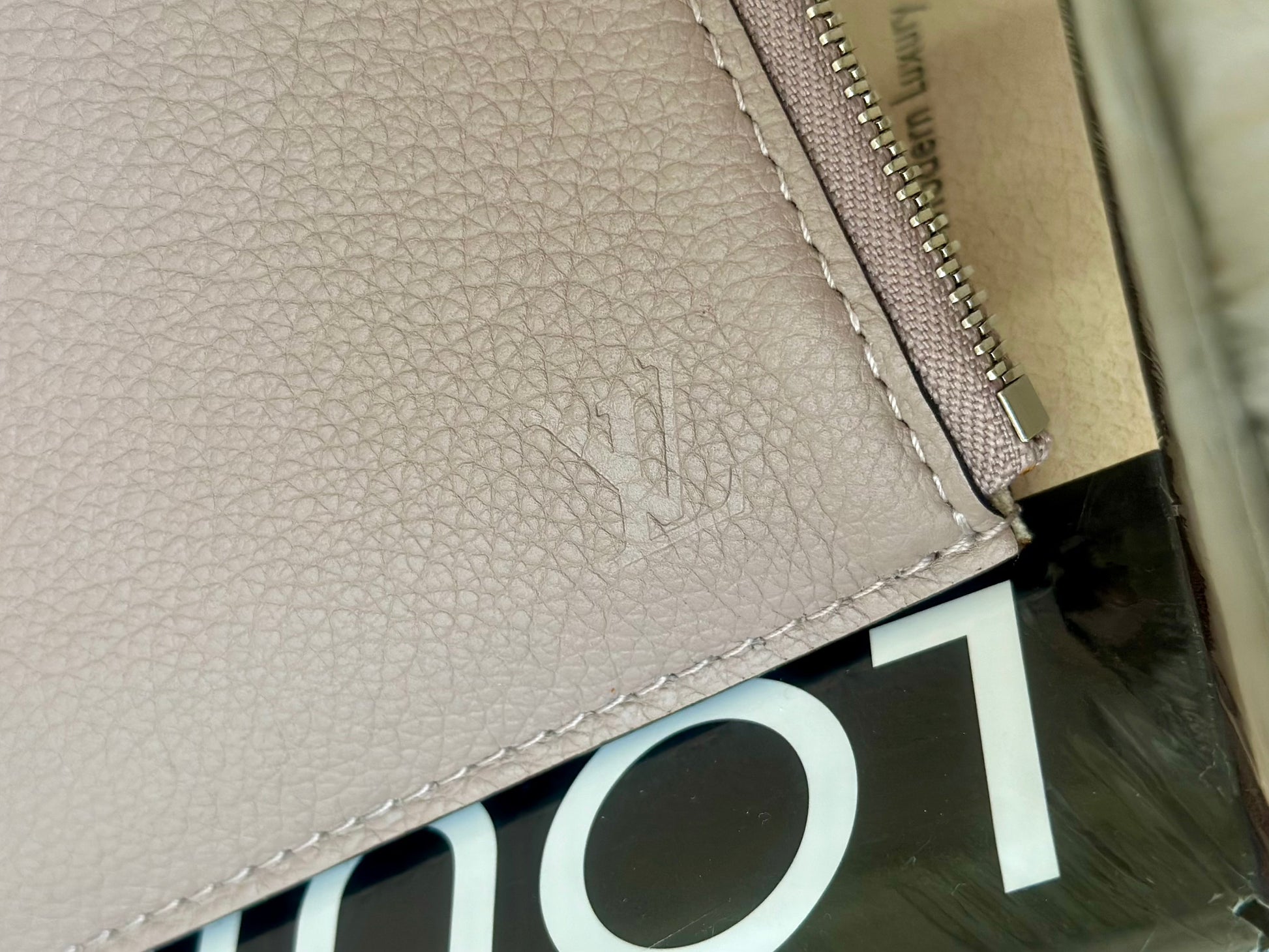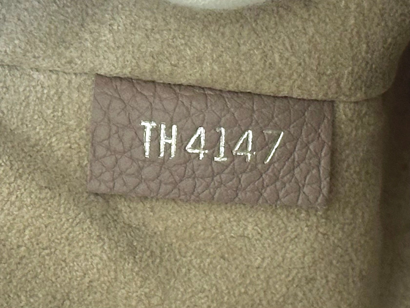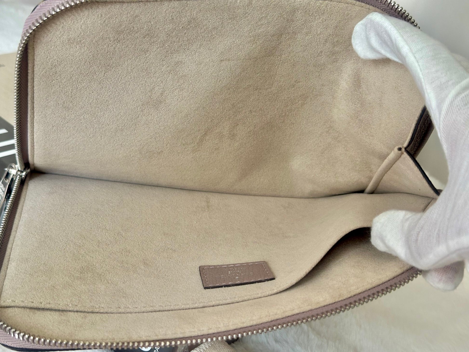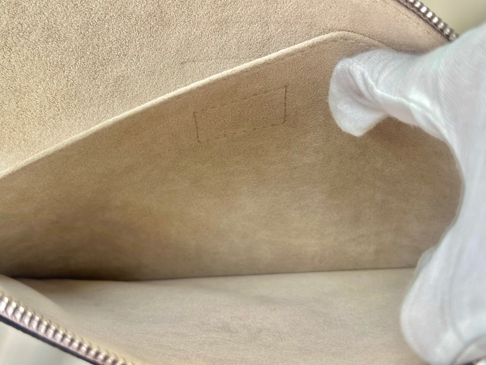EXCELLENT condition! Made from Taurillon leather in taupe that has no flaws. Silver hardware is still shiny, zipper runs smooth. Interior alcantara lining and interior pocket are both clean. No offensive smell, comes from pet and smoke free home.