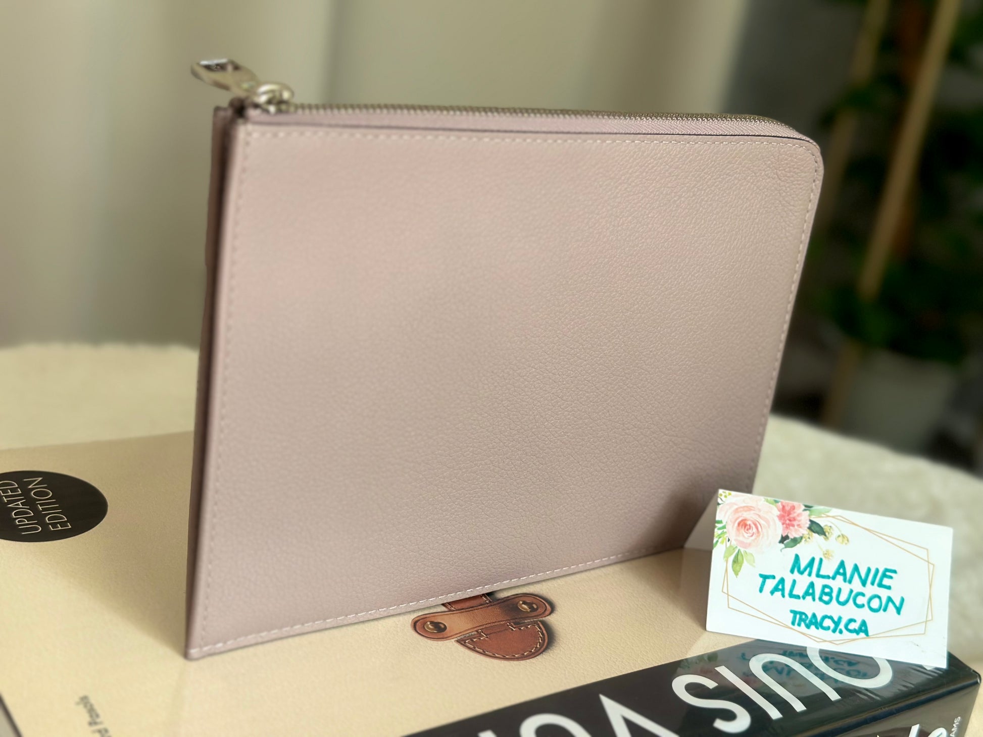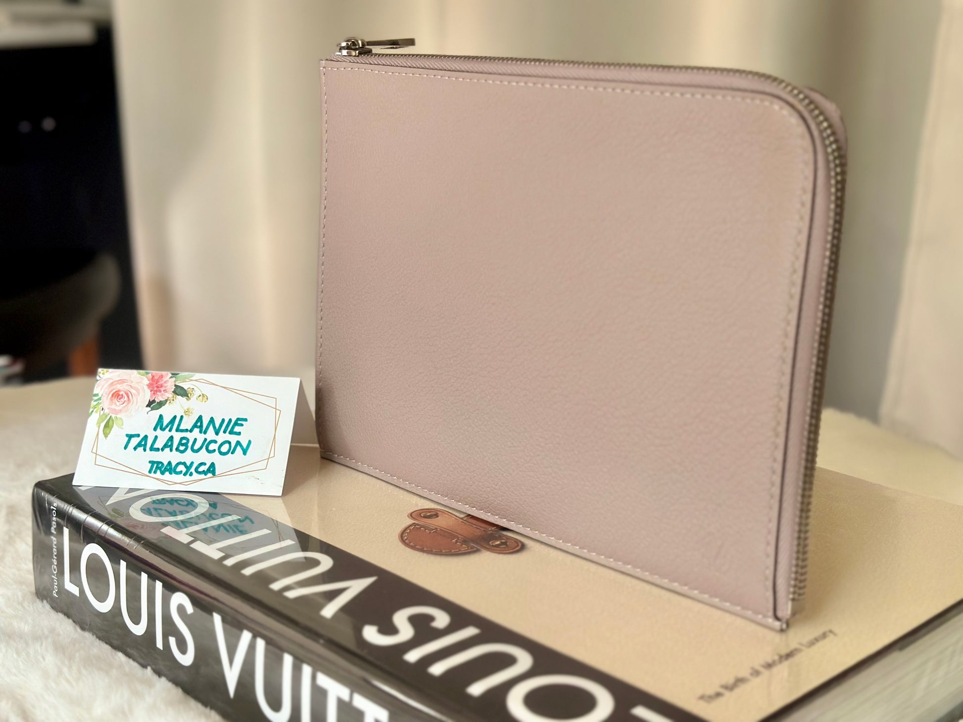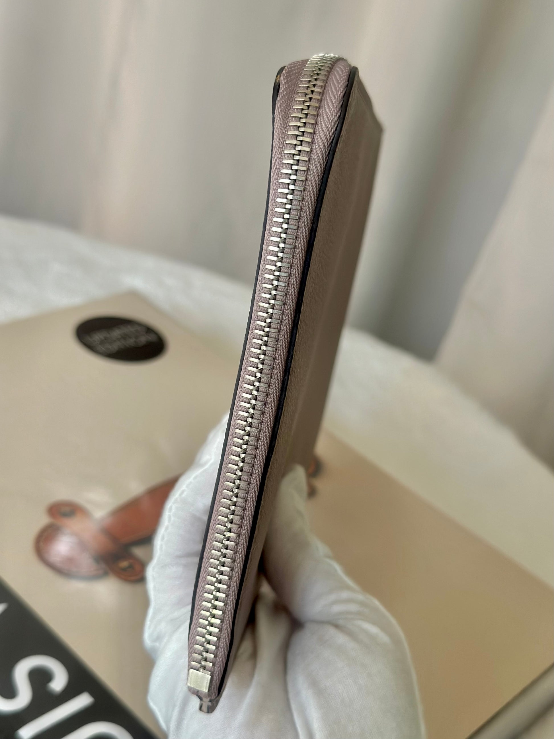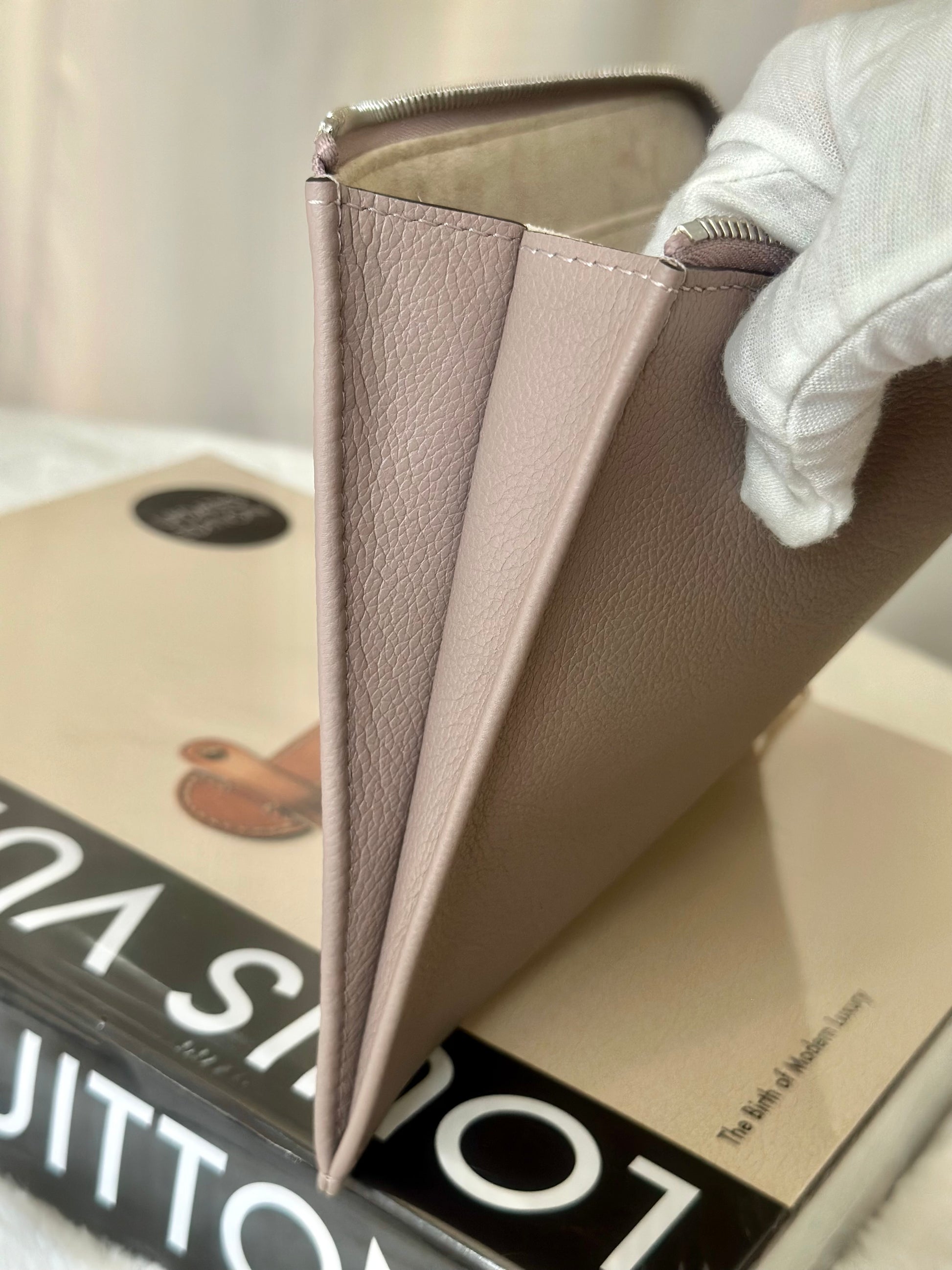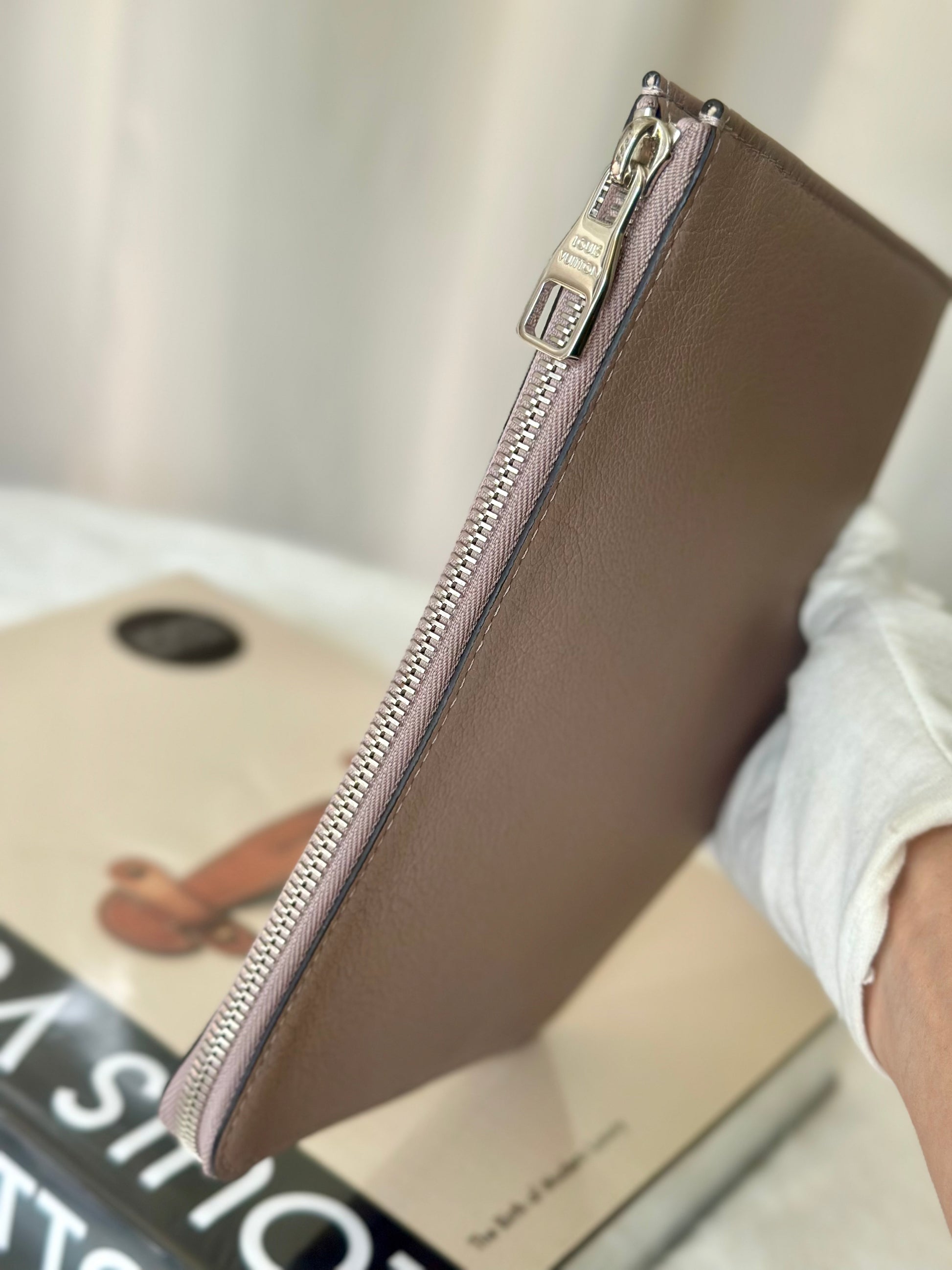 EXCELLENT condition! Made from Taurillon leather in taupe that has no flaws. Silver hardware is still shiny, zipper runs smooth. Interior alcantara lining and interior pocket are both clean. No offensive smell, comes from pet and smoke free home.